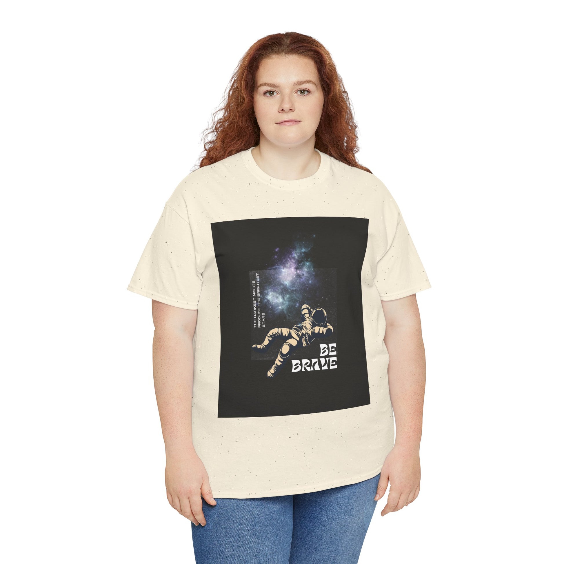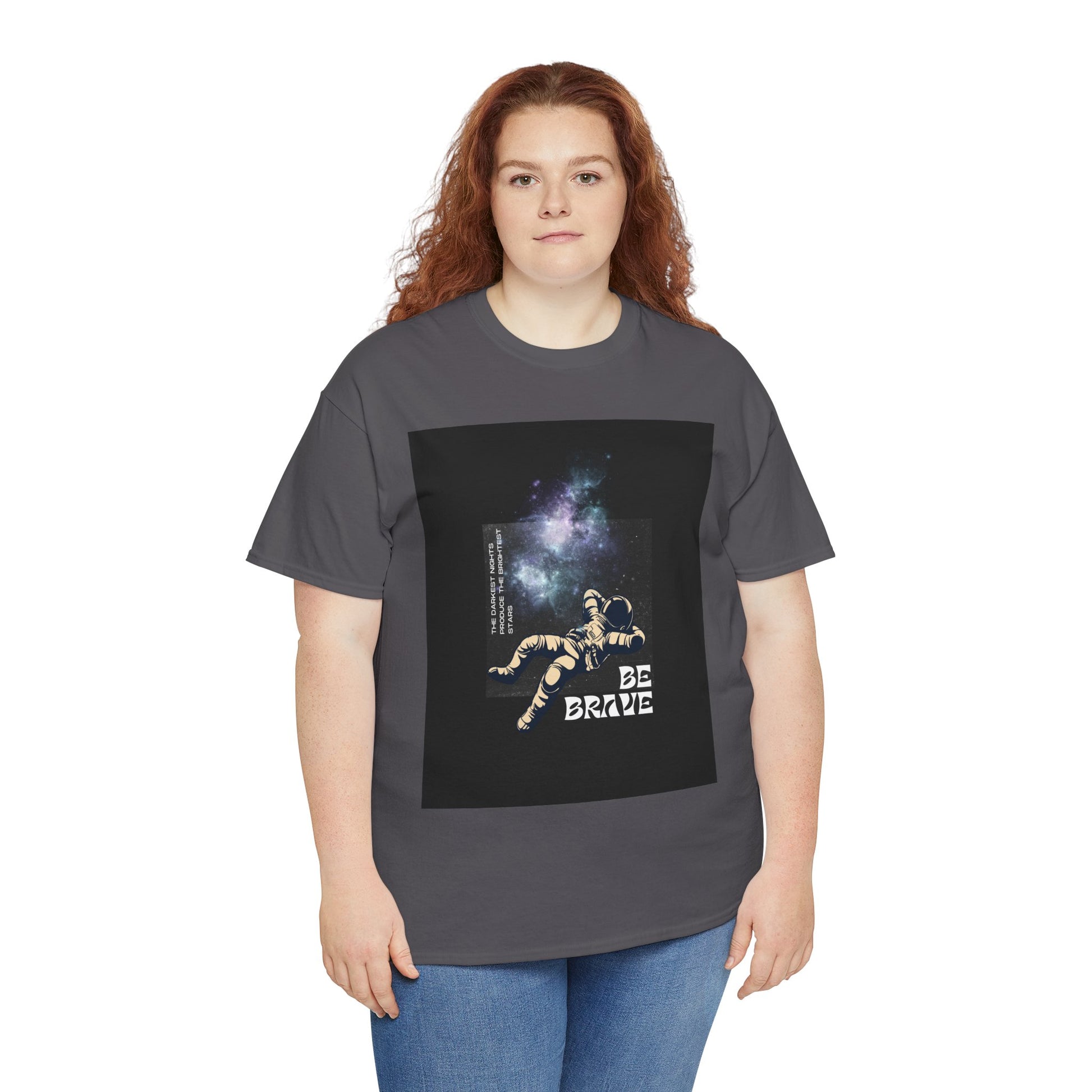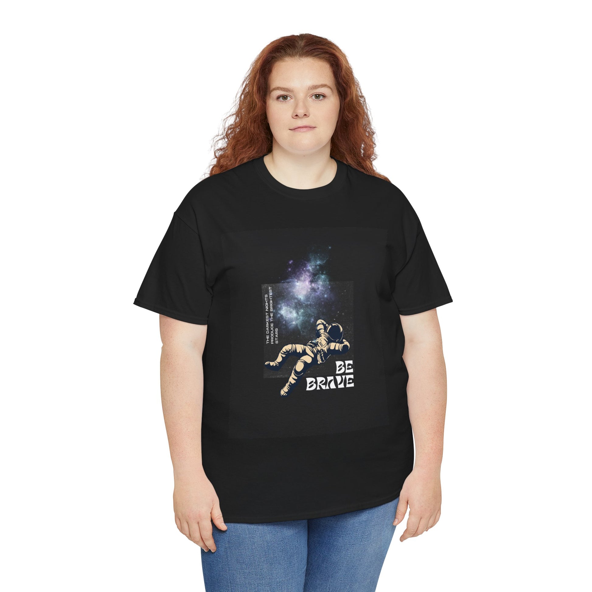 With sizes ranging from Small to 5XL, this tee ensures an inclusive fit for all. Whether you're looking for an inspirational gift or a comfortable, eco-conscious addition to your wardrobe, the "Be Brave Tee" delivers both style and substance. The space-themed graphic adds a bold, uplifting touch, making it a standout piece for those who want to wear positivity every day.
