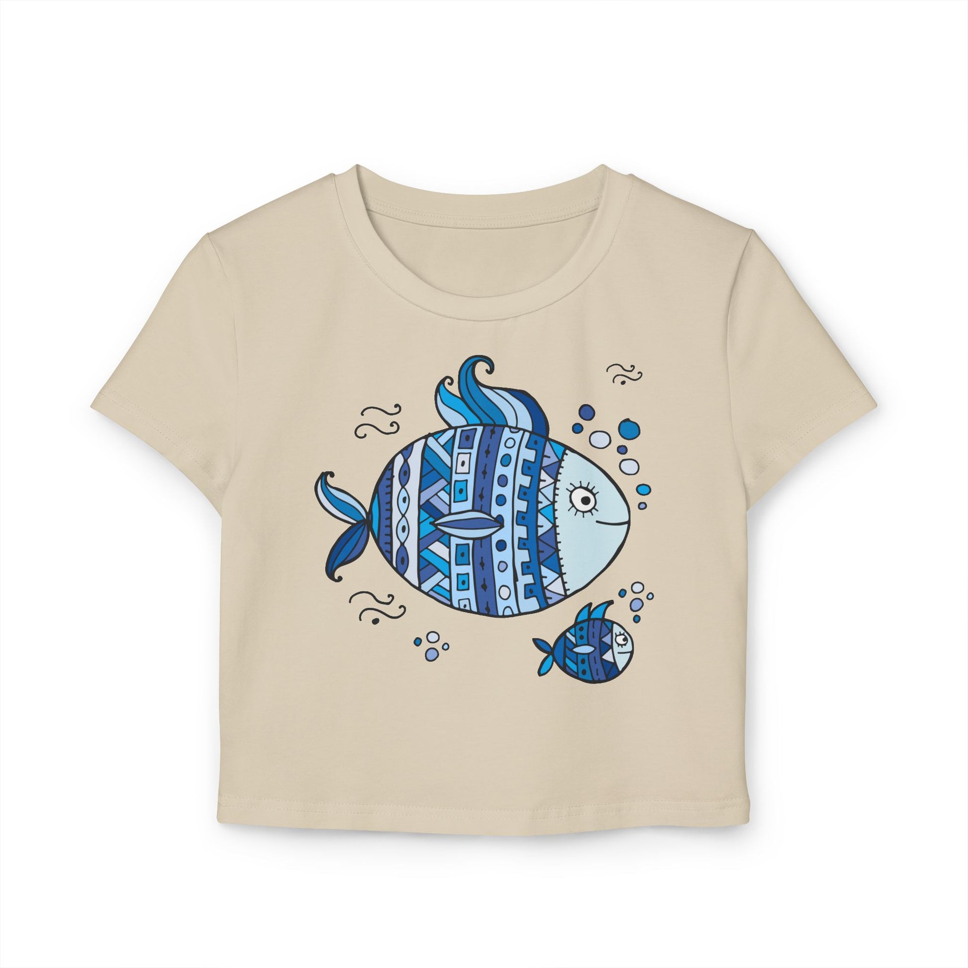 Boho Chic Women's Baby Tee with Blue Fish Design, Cute Summer Top, Fun Gift for Sea Lovers, Aquatic-themed Apparel, Beach Vibes