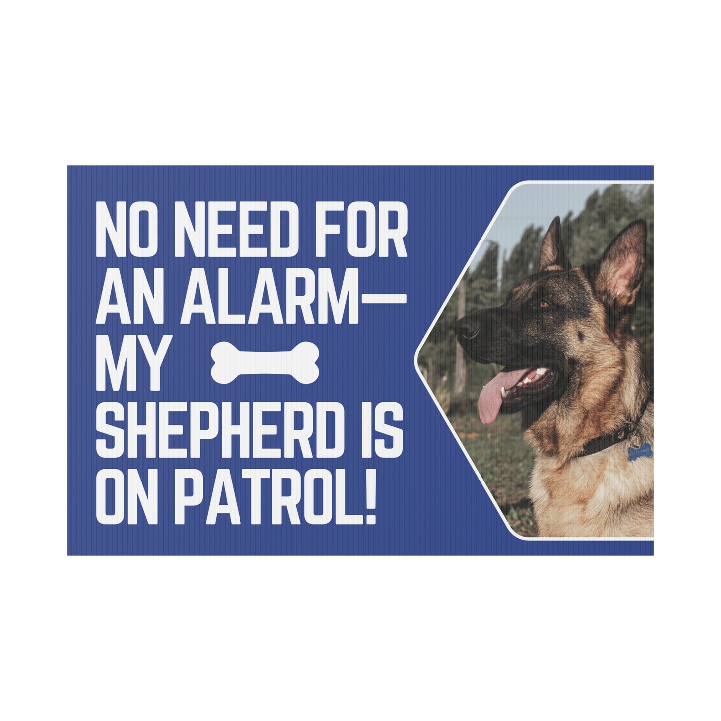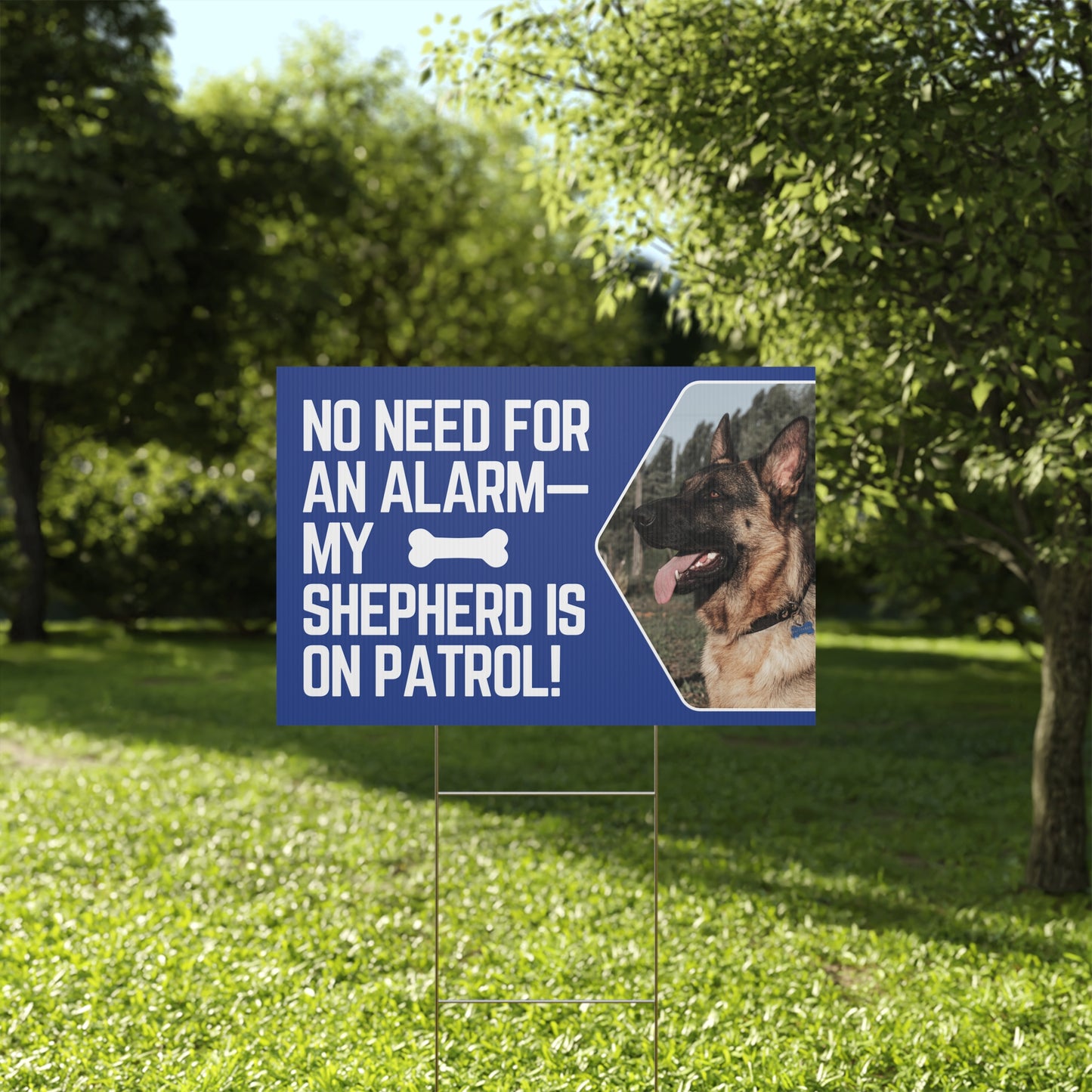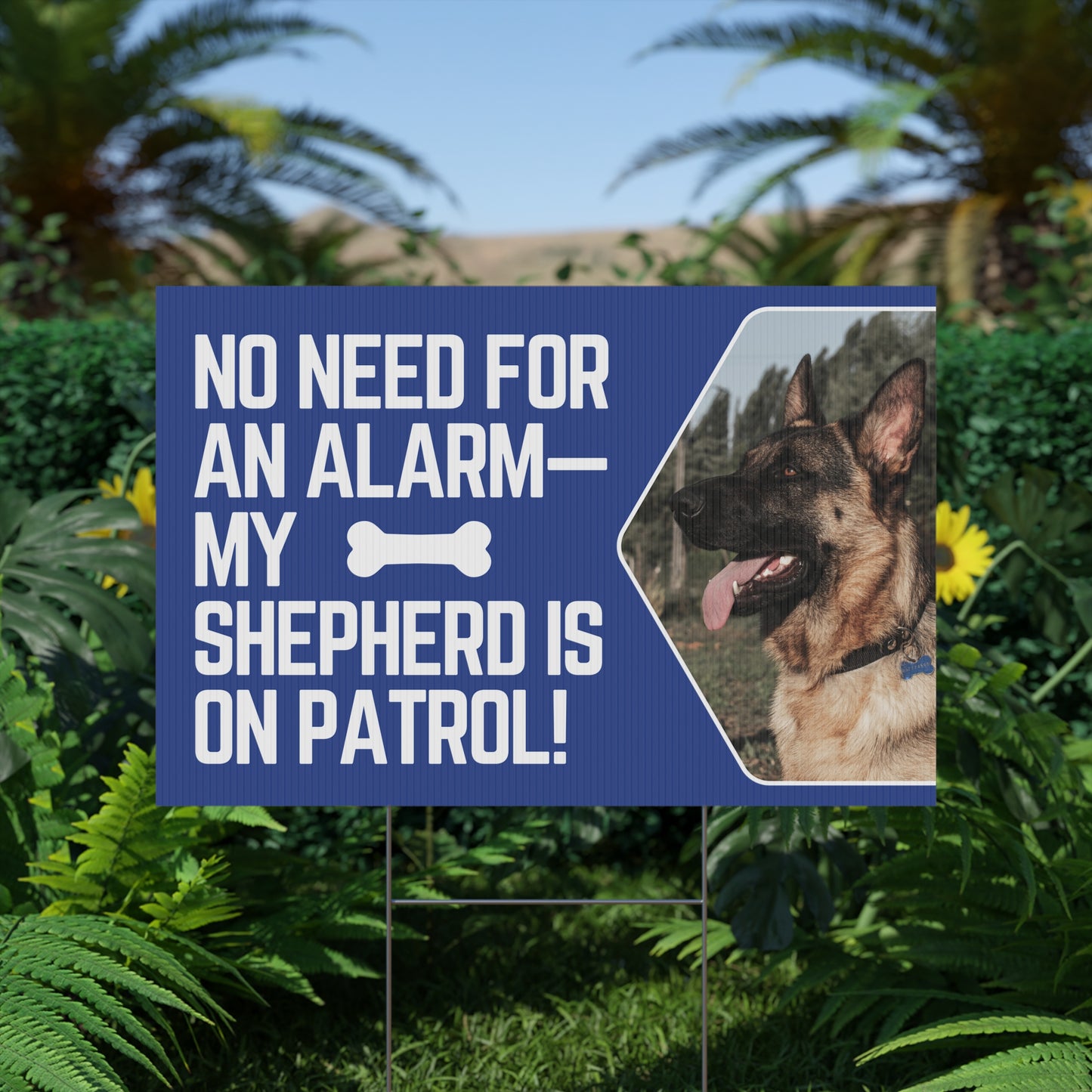 Custom Plastic Yard Sign - "No Need for an Alarm - My Shepherd is On Patrol!"
