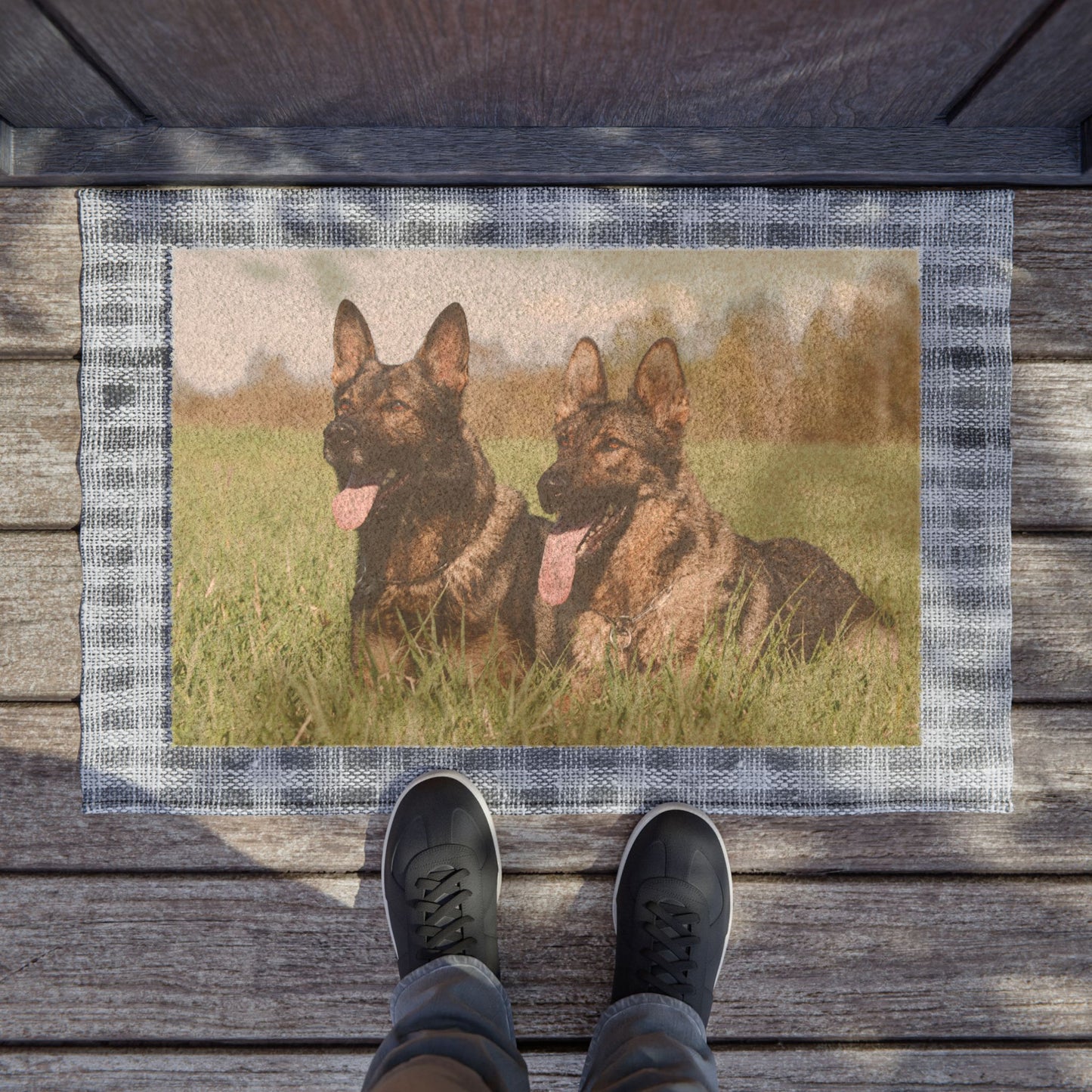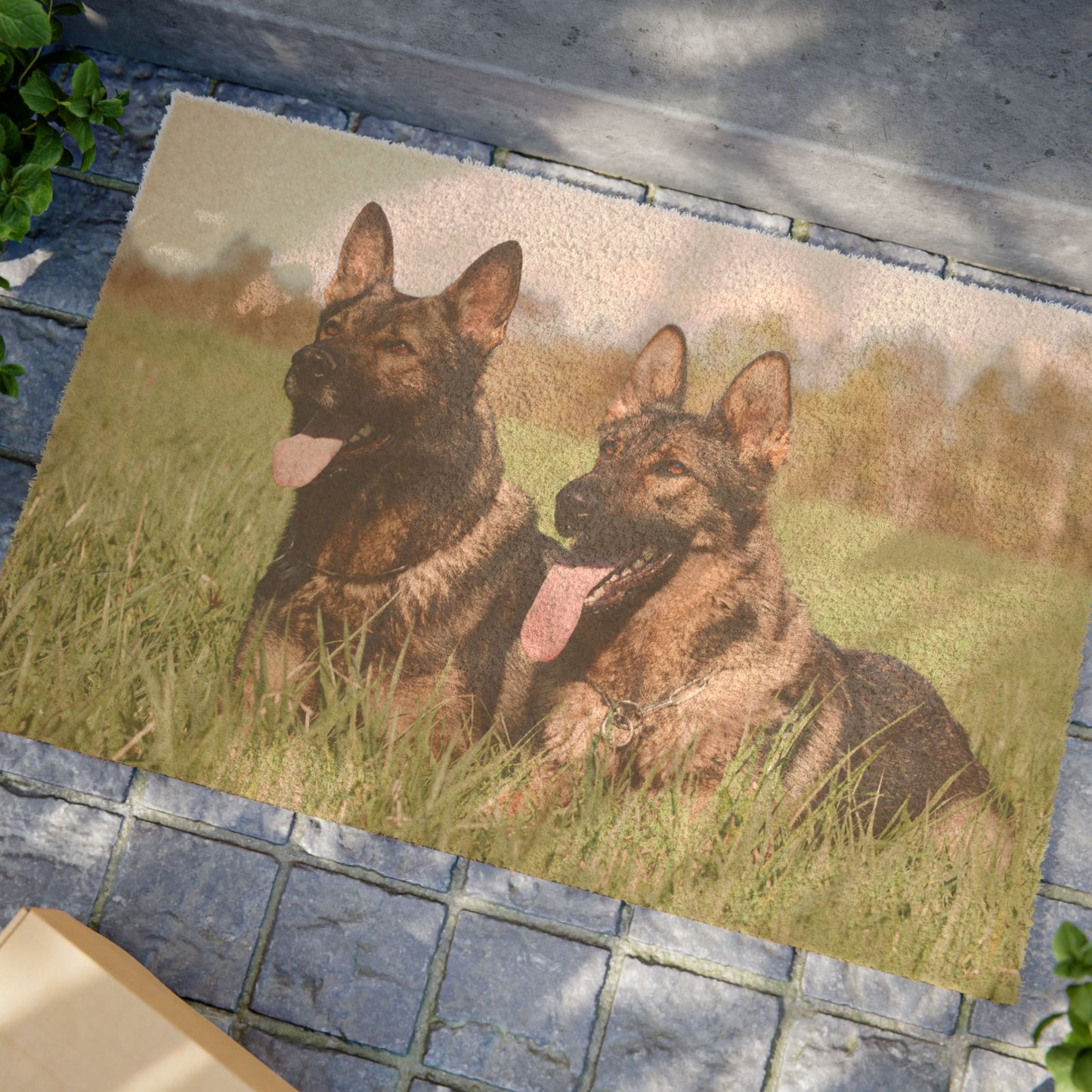Dog Doormat Featuring Two Giant Working Line German Shepherds Sitting on the Grass
