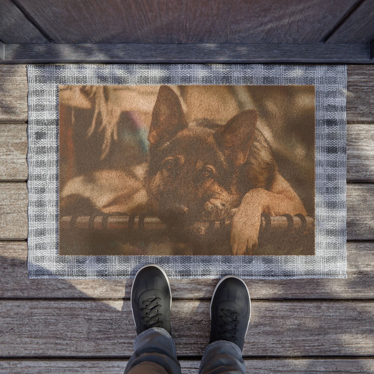 Dog Lover Doormat Featuring a Sable German Shepherd Resting on Outdoor Bed