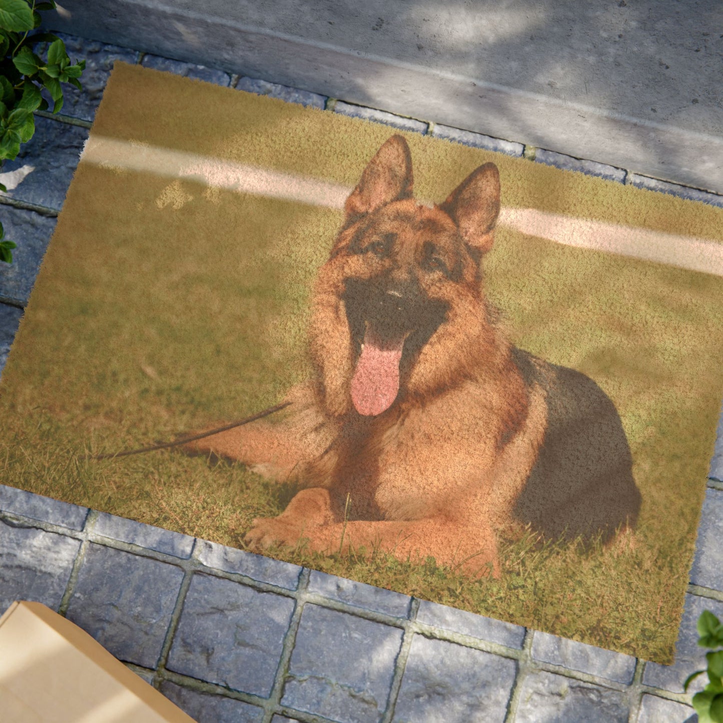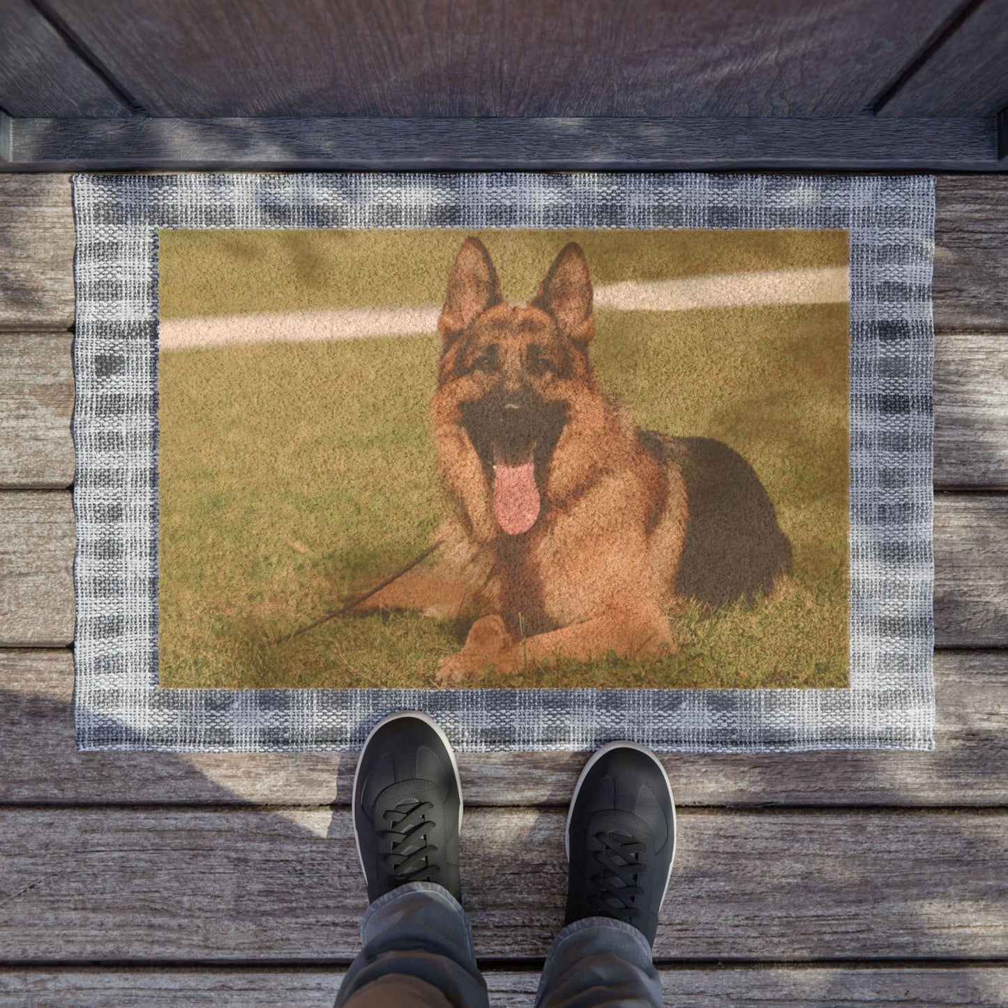 Built to withstand daily use, this high-quality doormat features fade-resistant printing that keeps the colors bright and the details crisp, even with frequent foot traffic and exposure to the elements. The lush grassy background and the dog's joyful expression create a welcoming scene that adds warmth and character to any entryway. Perfect for German Shepherd owners or anyone who adores dogs, this mat is both a practical necessity and a celebration of your furry friend's happy spirit.