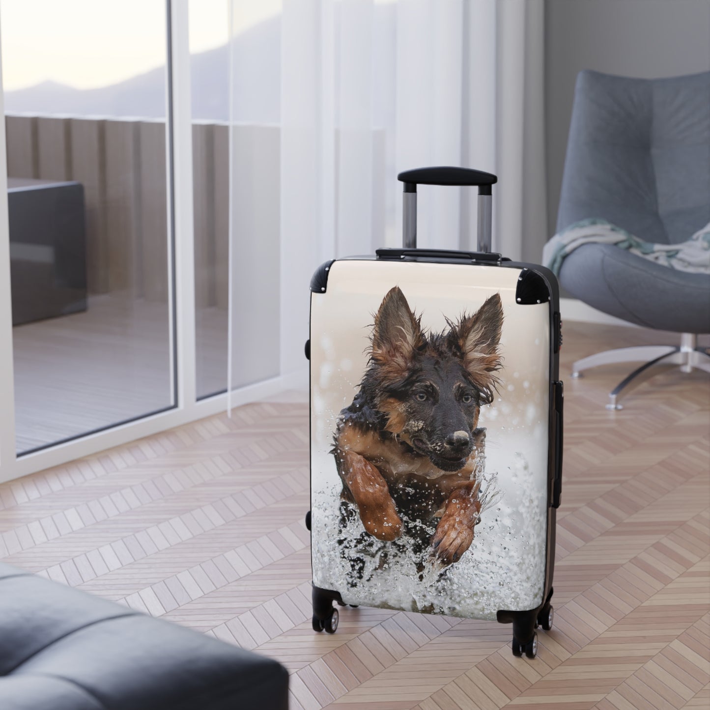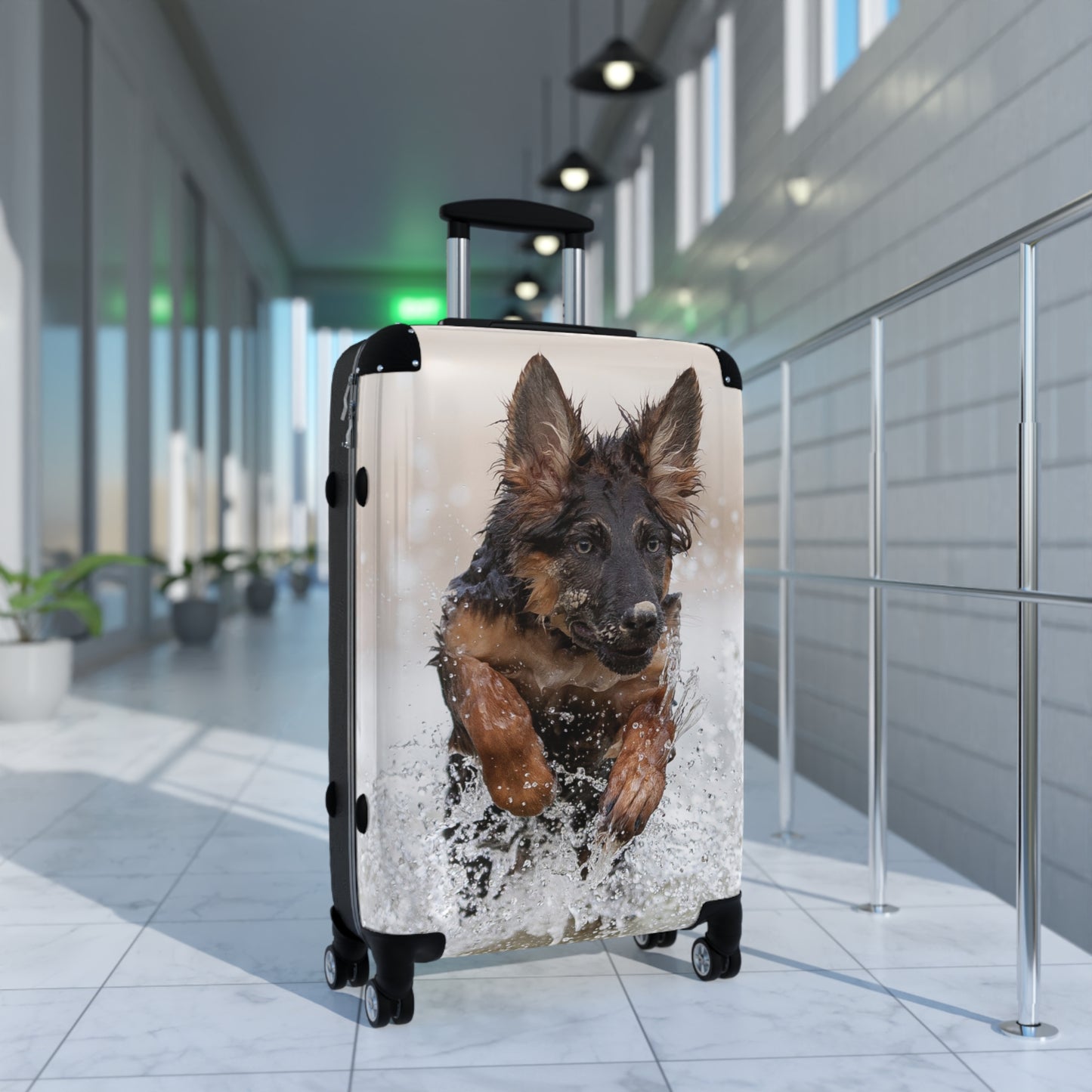 Make a splash wherever you travel with this dynamic suitcase featuring a powerful German Shepherd mid-leap into crystal-clear water! Designed for adventurous dog lovers, this eye-catching hard-shell case combines splash-resistant polycarbonate armor with rugged ABS backing to handle life's exciting journeys. The hydrodynamic 360° spinner wheels glide effortlessly across wet airport floors or sandy boardwalks, while the ergonomic telescopic handle adjusts for perfect control whether you're sprinting for a connection or strolling to baggage claim.