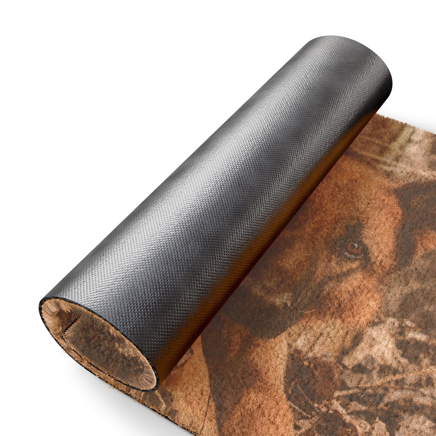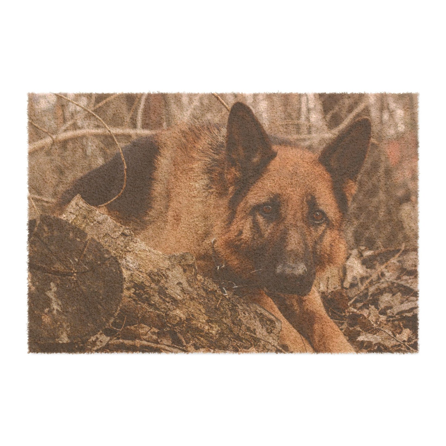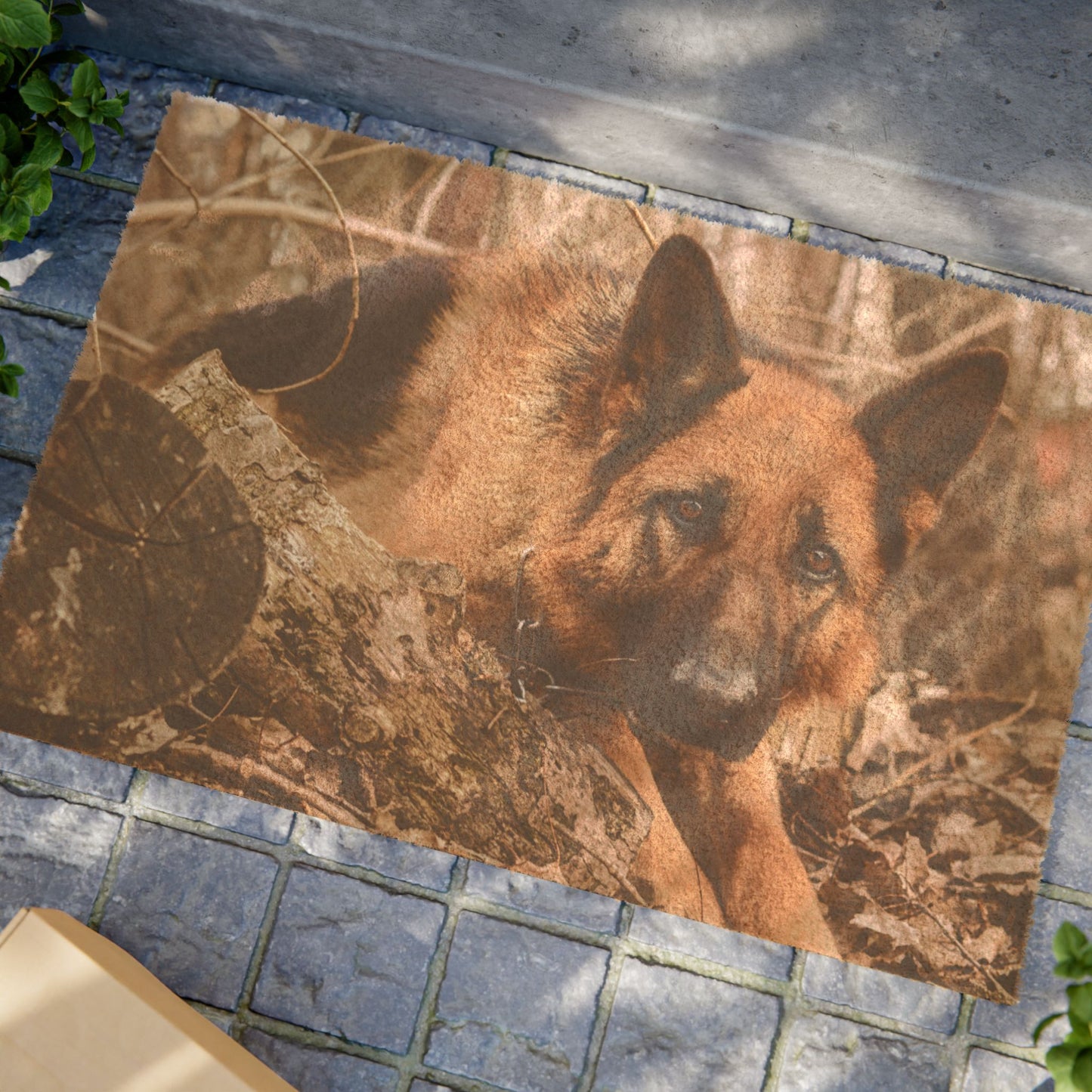 Welcome people with this charming doormat featuring a wide-eyed, surprised German Shepherd sitting among fallen leaves. Measuring 24" × 16" (61cm x 40.6cm), this high-quality mat is crafted from durable Grade A tufted coir coconut fiber, offering a tough, textured surface that effectively traps dirt, mud, and moisture. The non-slip black vinyl backing keeps it securely in place while protecting your floors from scratches—perfect for high-traffic entryways, patios, or porches.