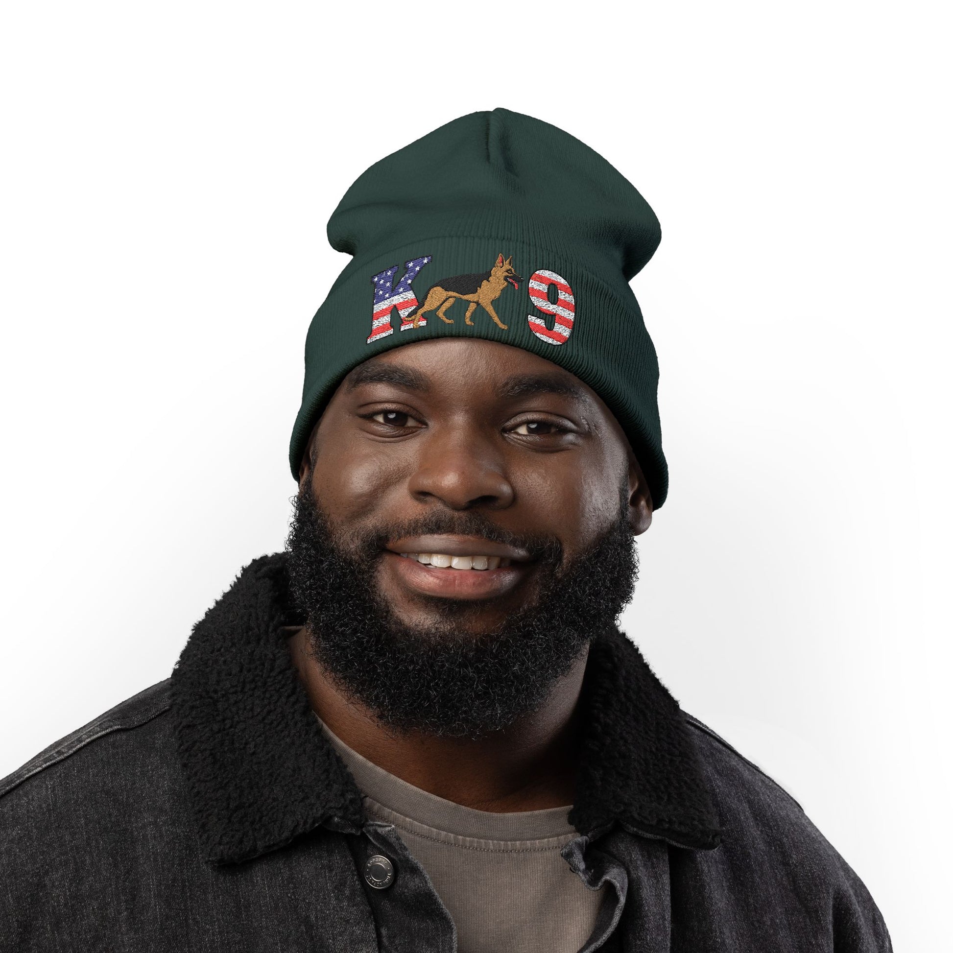 Wear your patriotism and passion for German Shepherds with pride. This unique beanie features a stunning and intricate design where the iconic stars and stripes of the American flag are masterfully woven into the letters "K" and "9". It’s a bold, symbolic statement for true dog lovers and patriots.