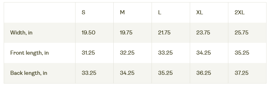 - Longer than a standard unisex shirt with a rounded bottom hem