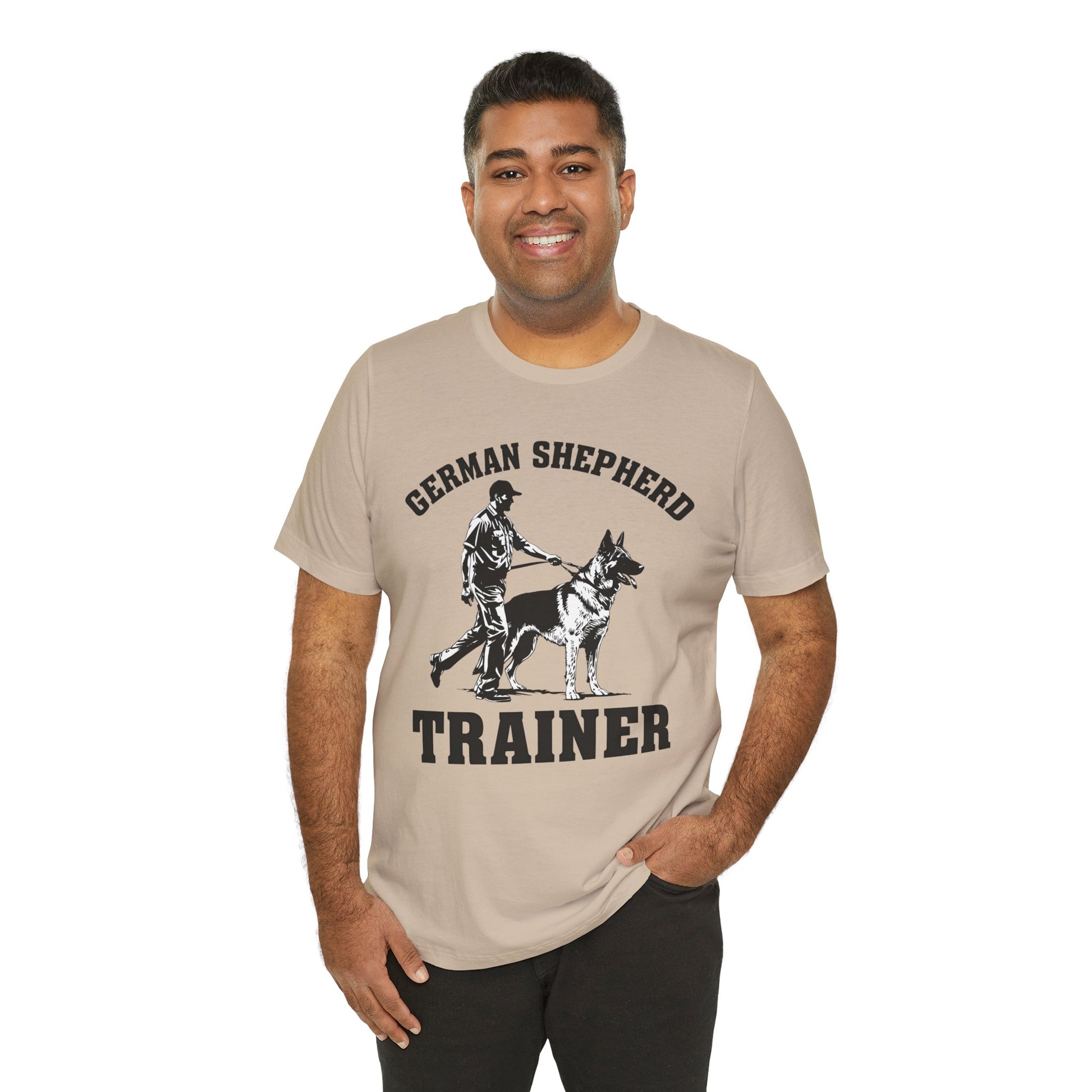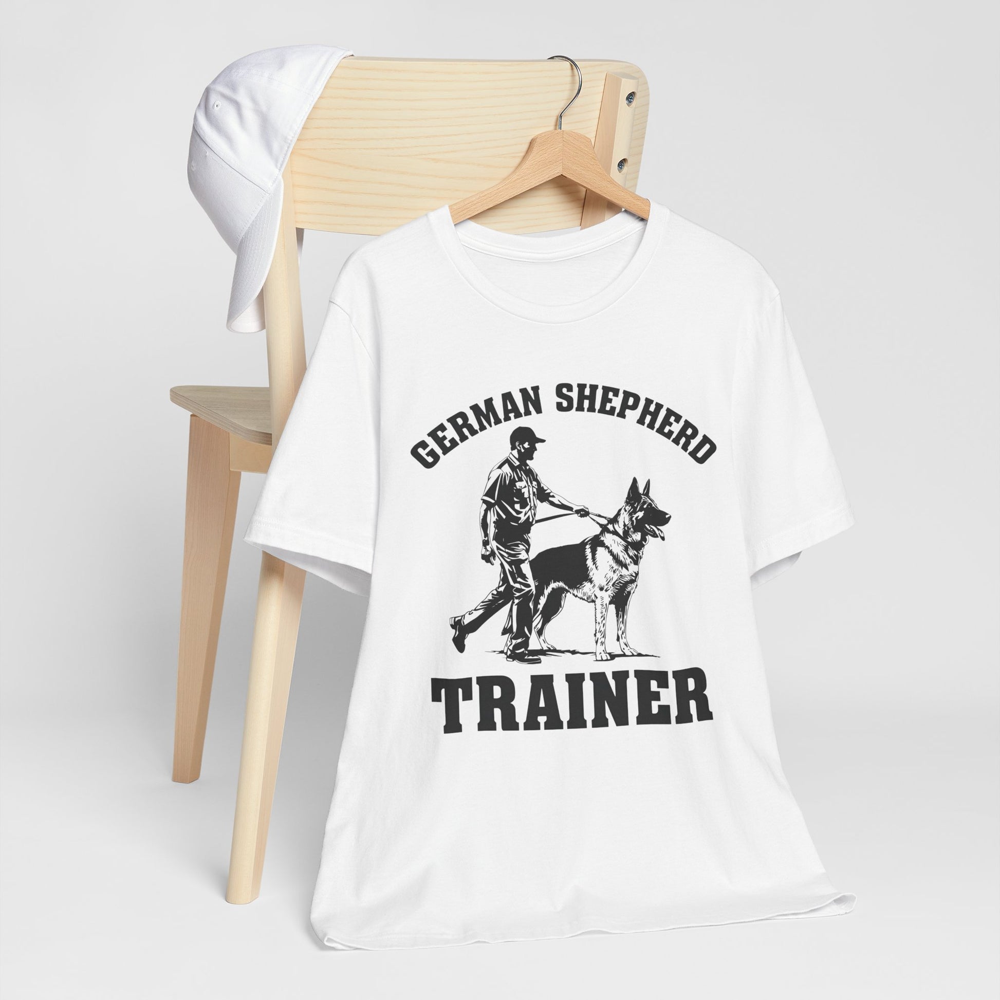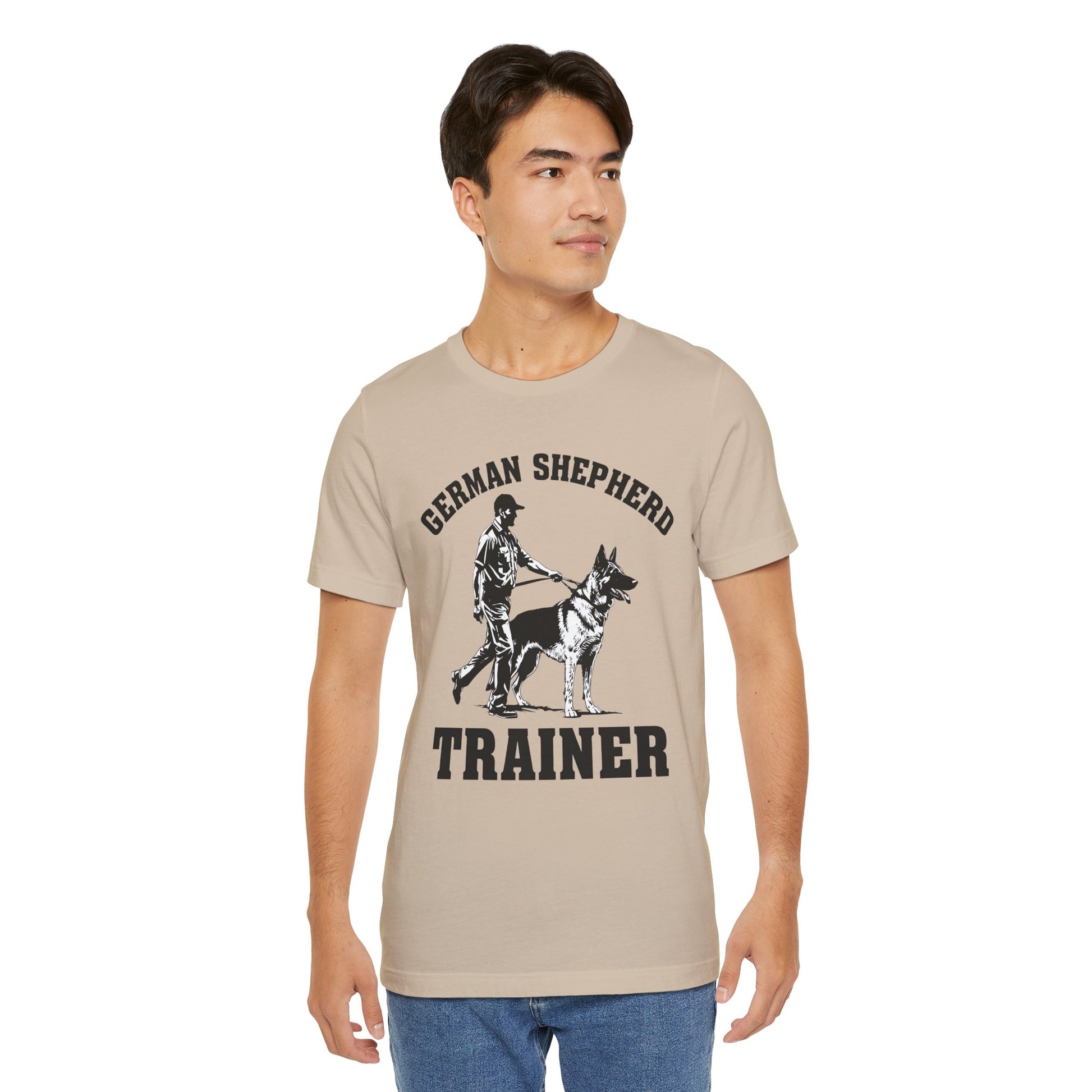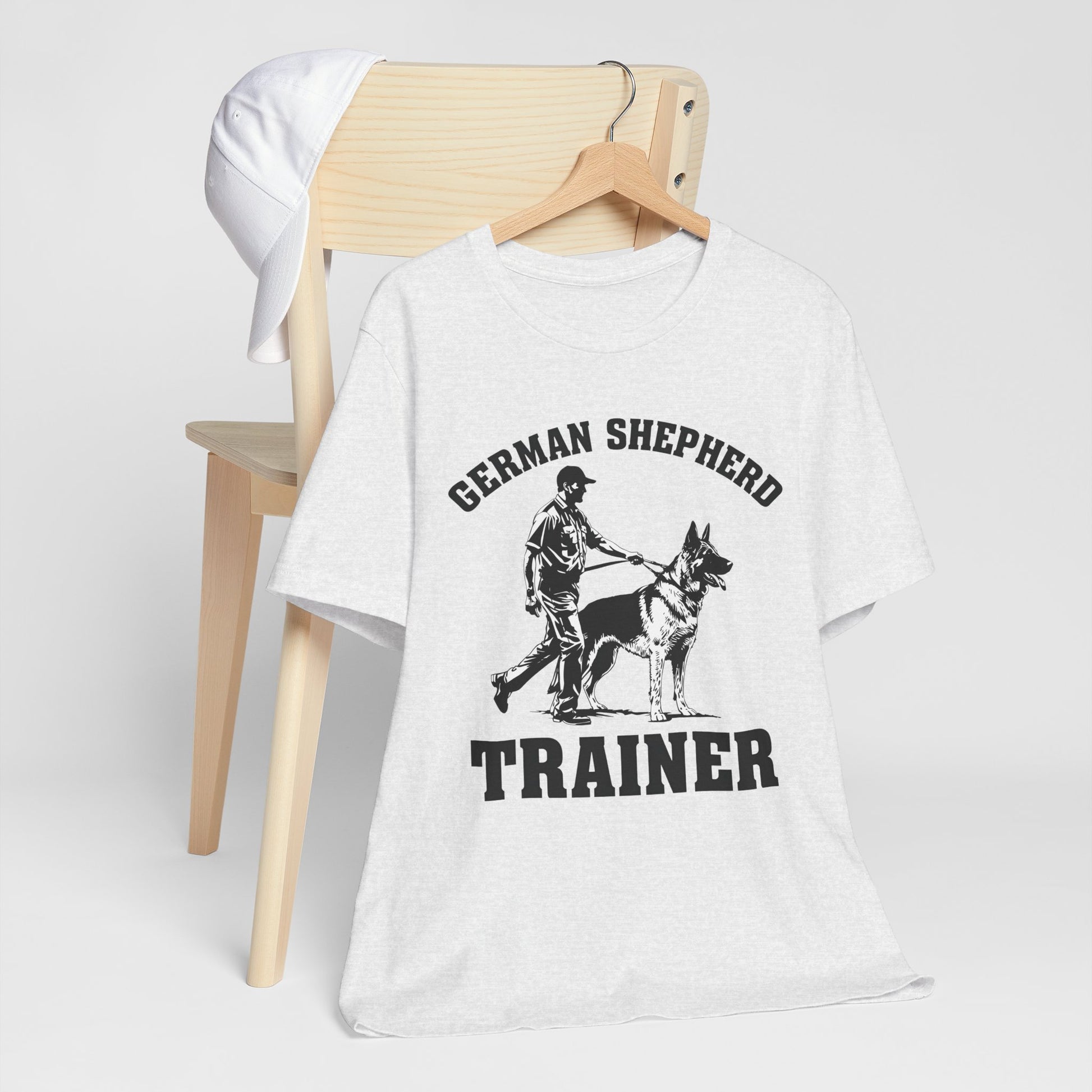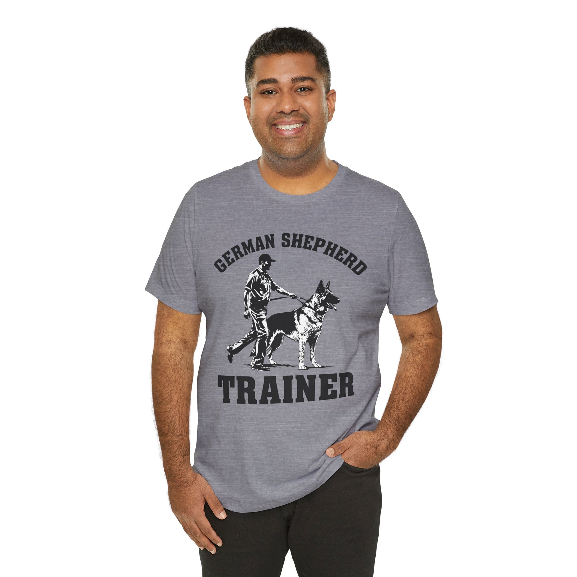 German Shepherd Trainer Tee - Black and White Design of Man Holding a German Shepherd