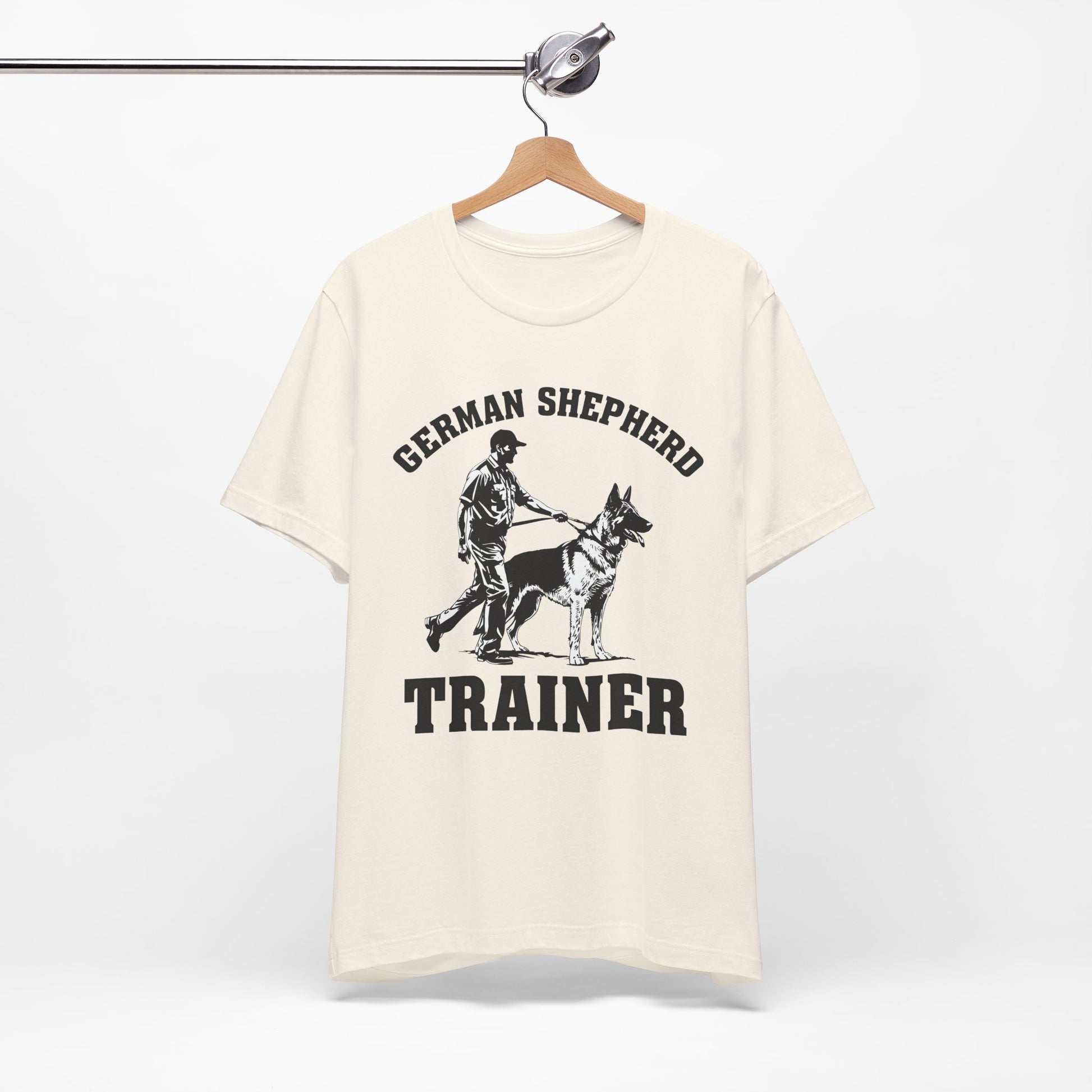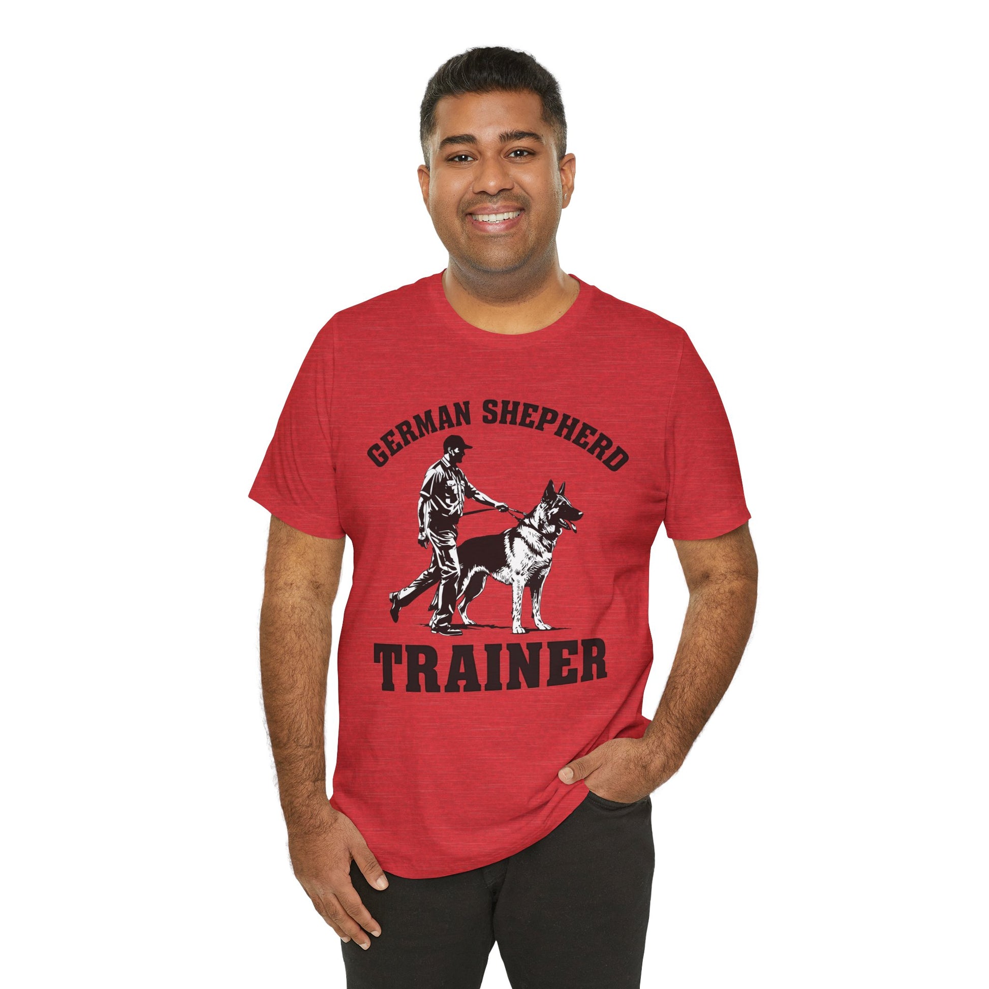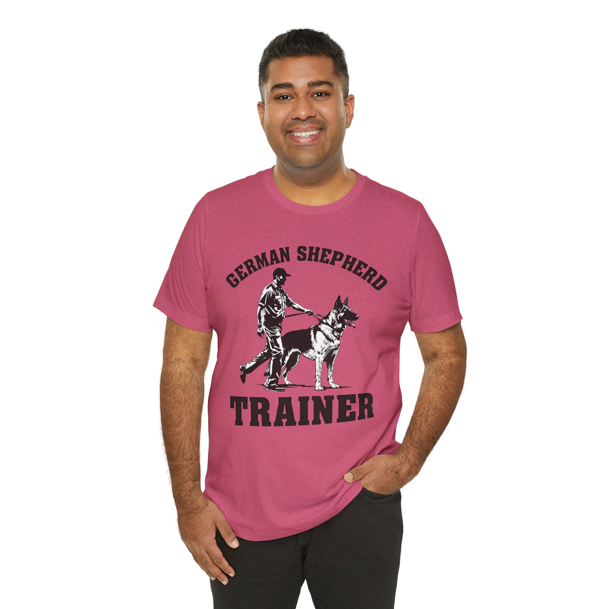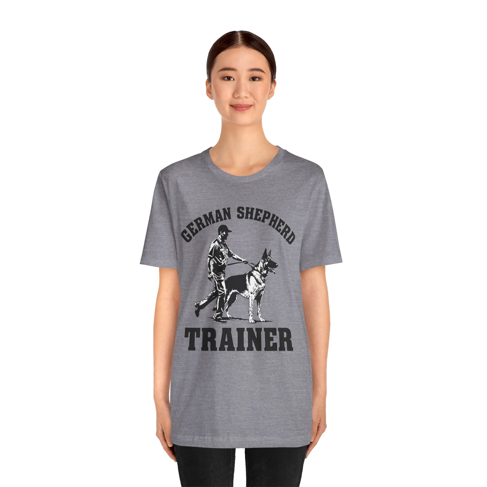 German Shepherd Trainer Tee - Black and White Design of Man Holding a German Shepherd