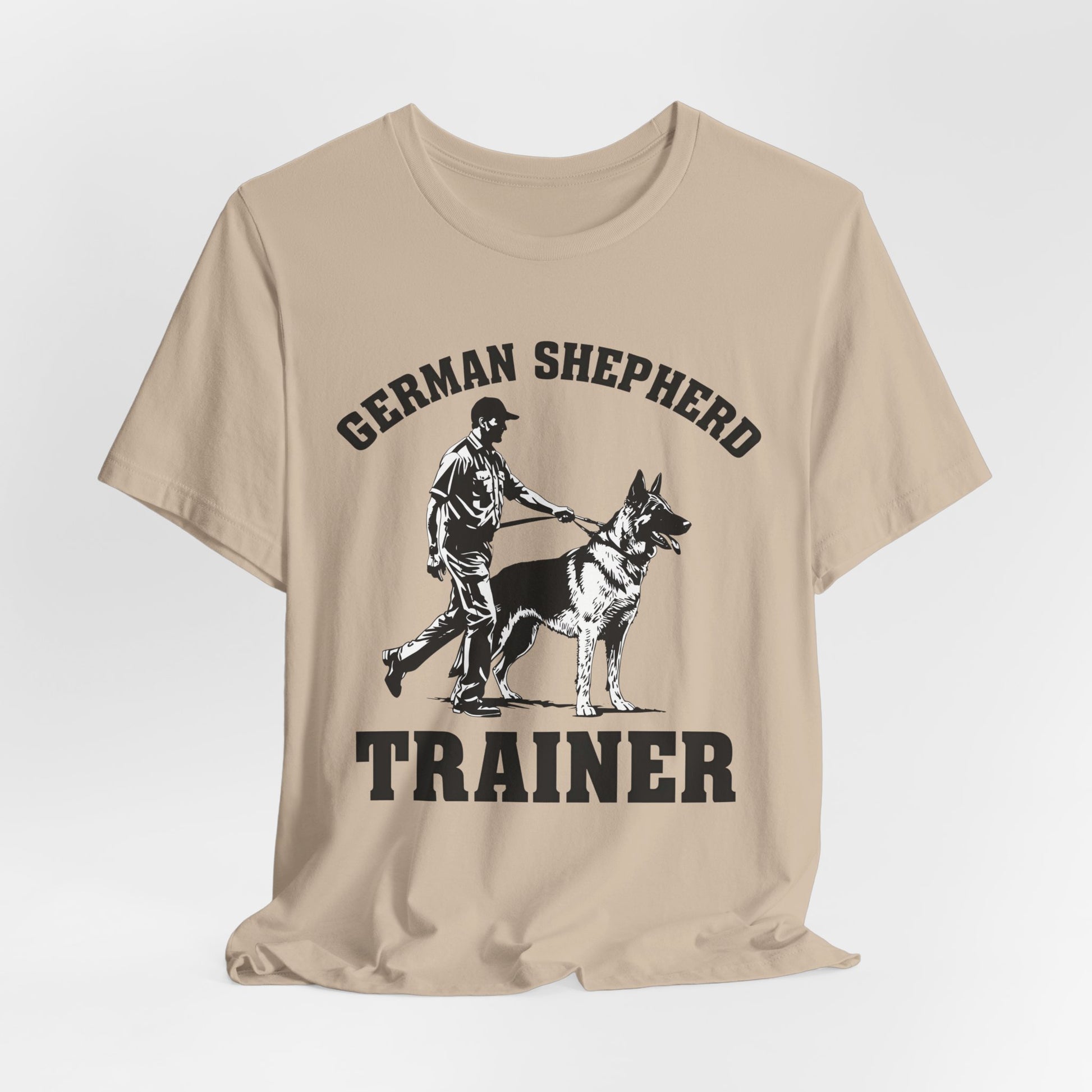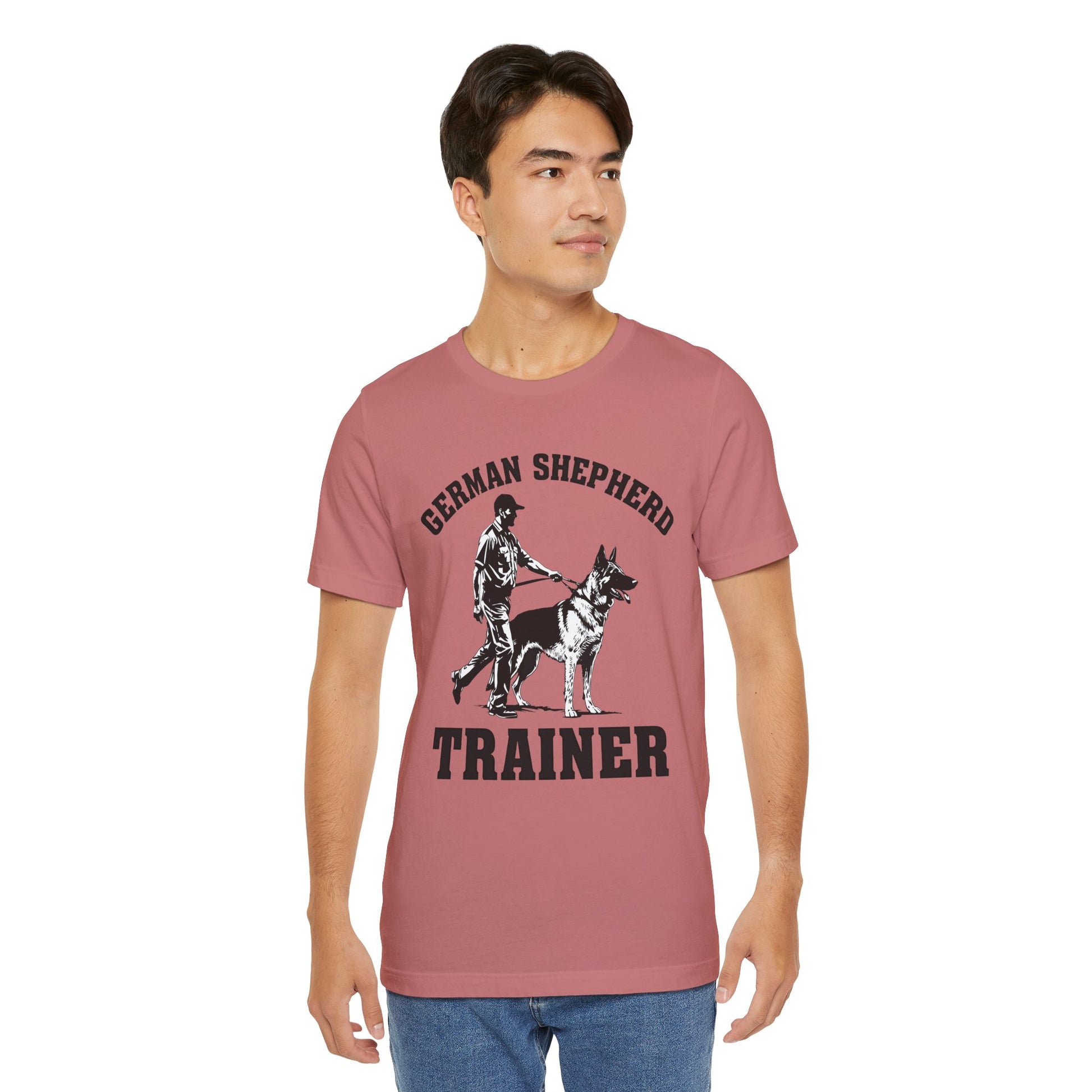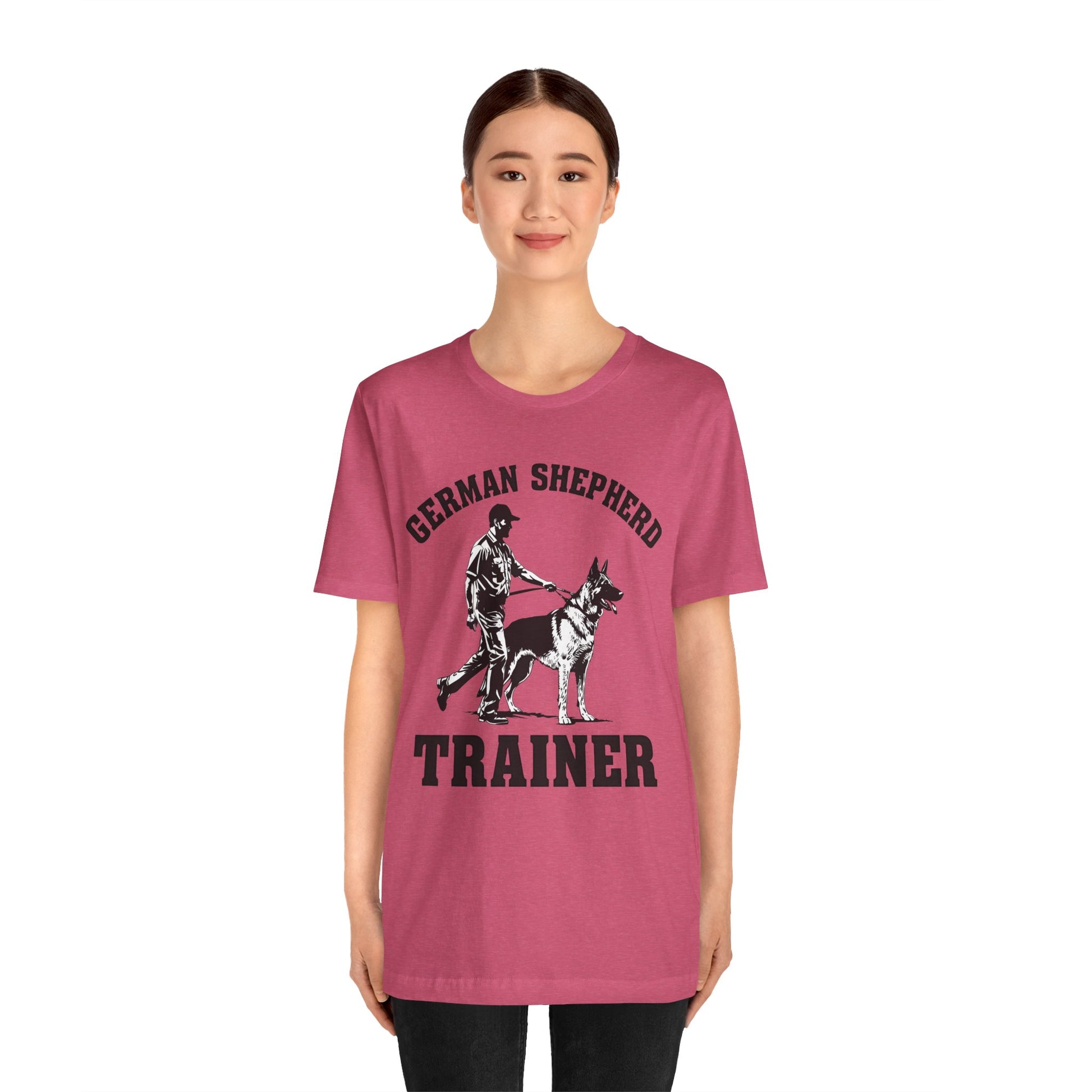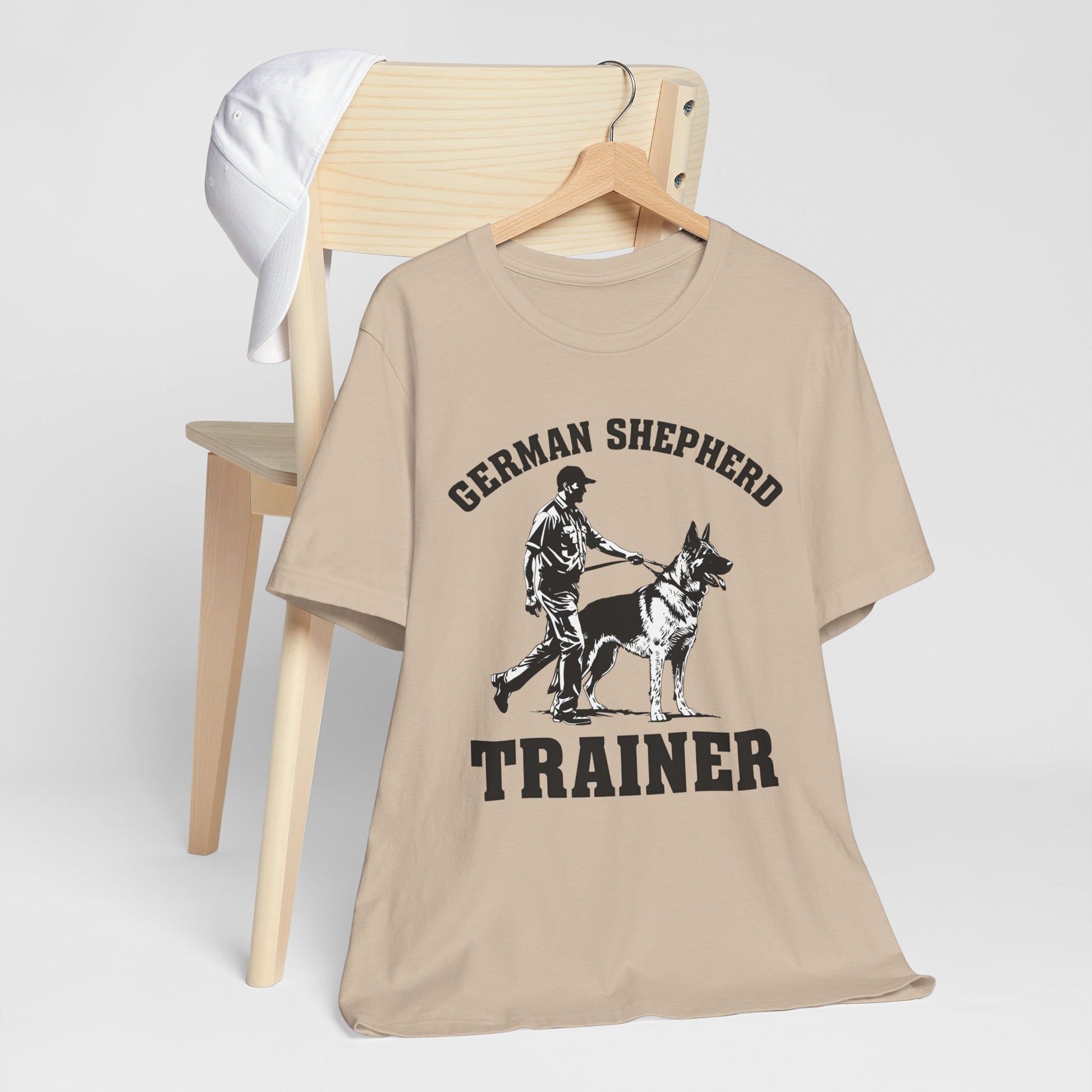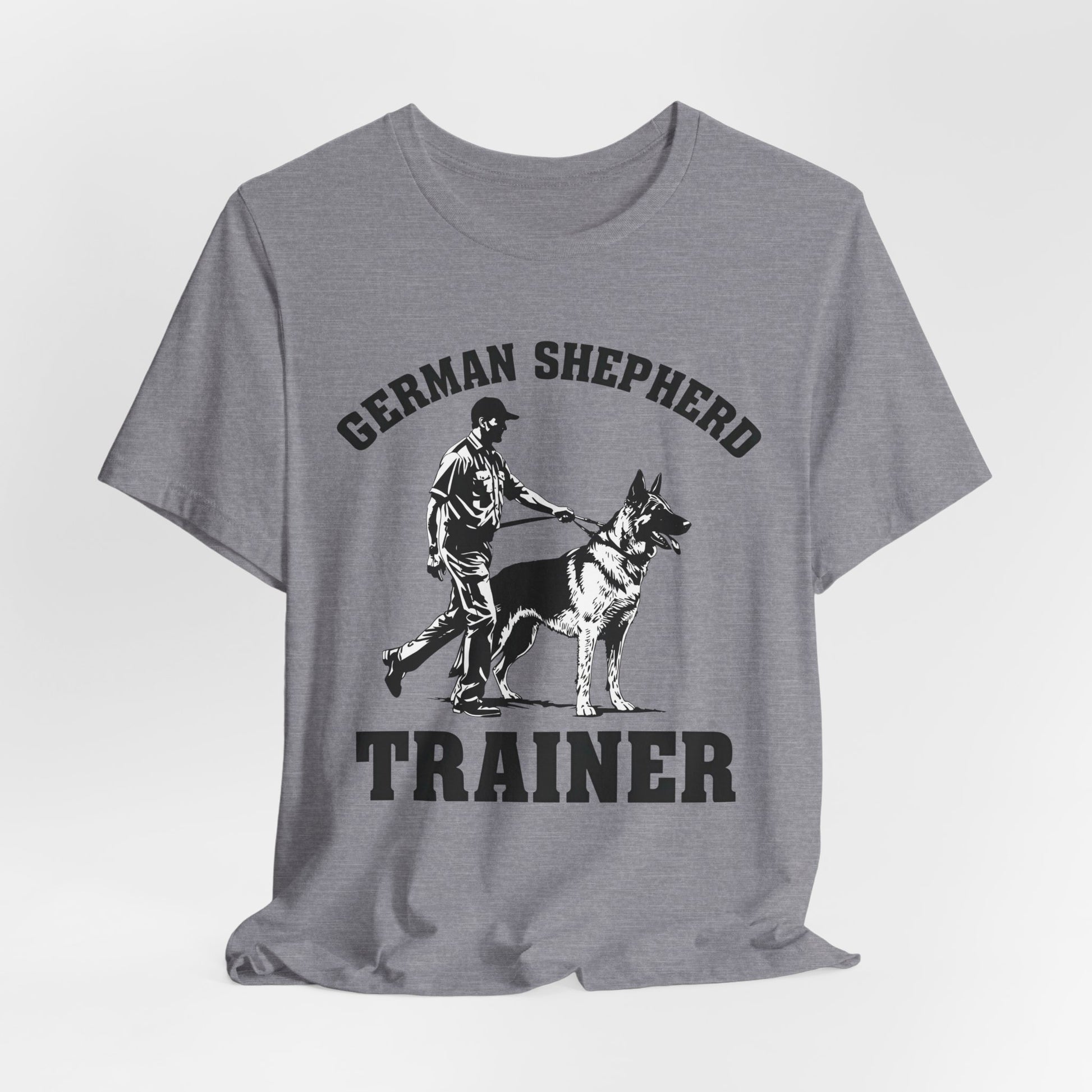German Shepherd Trainer Tee - Black and White Design of Man Holding a German Shepherd
