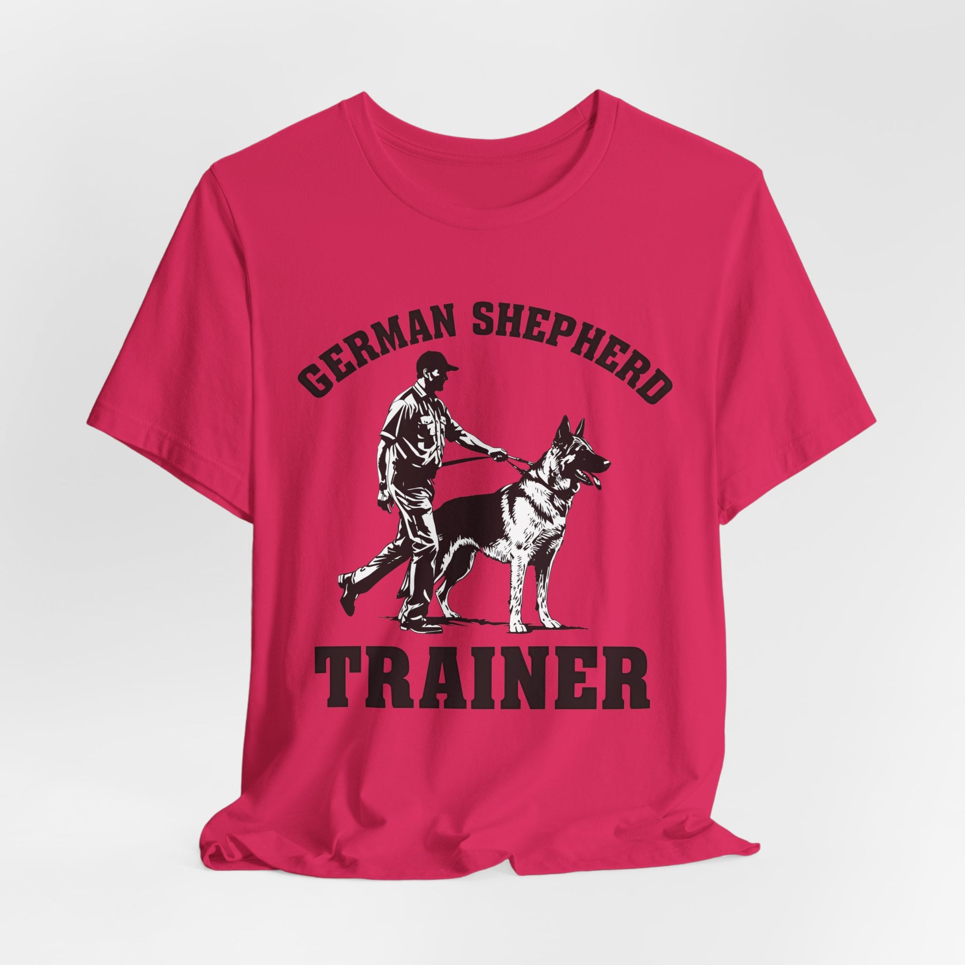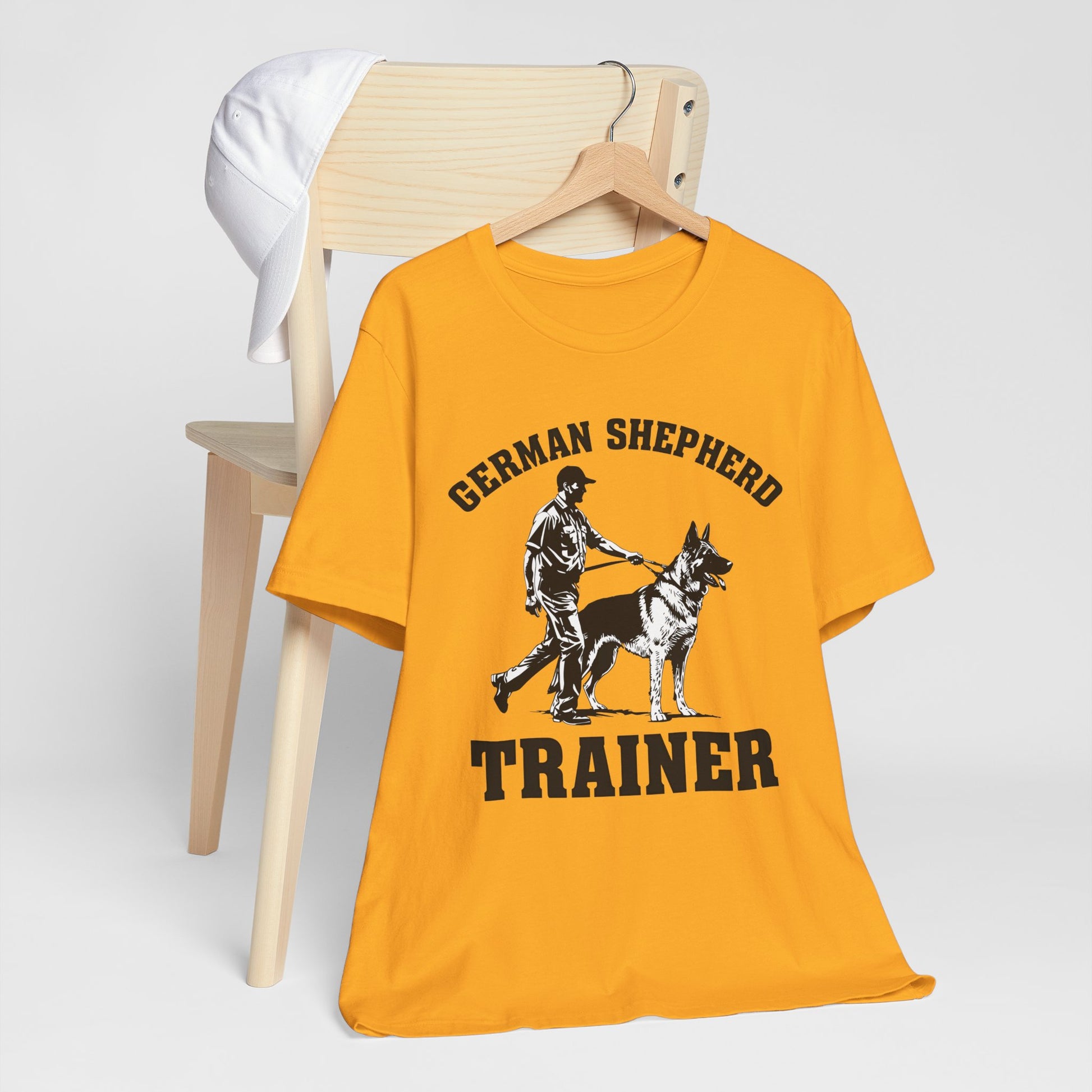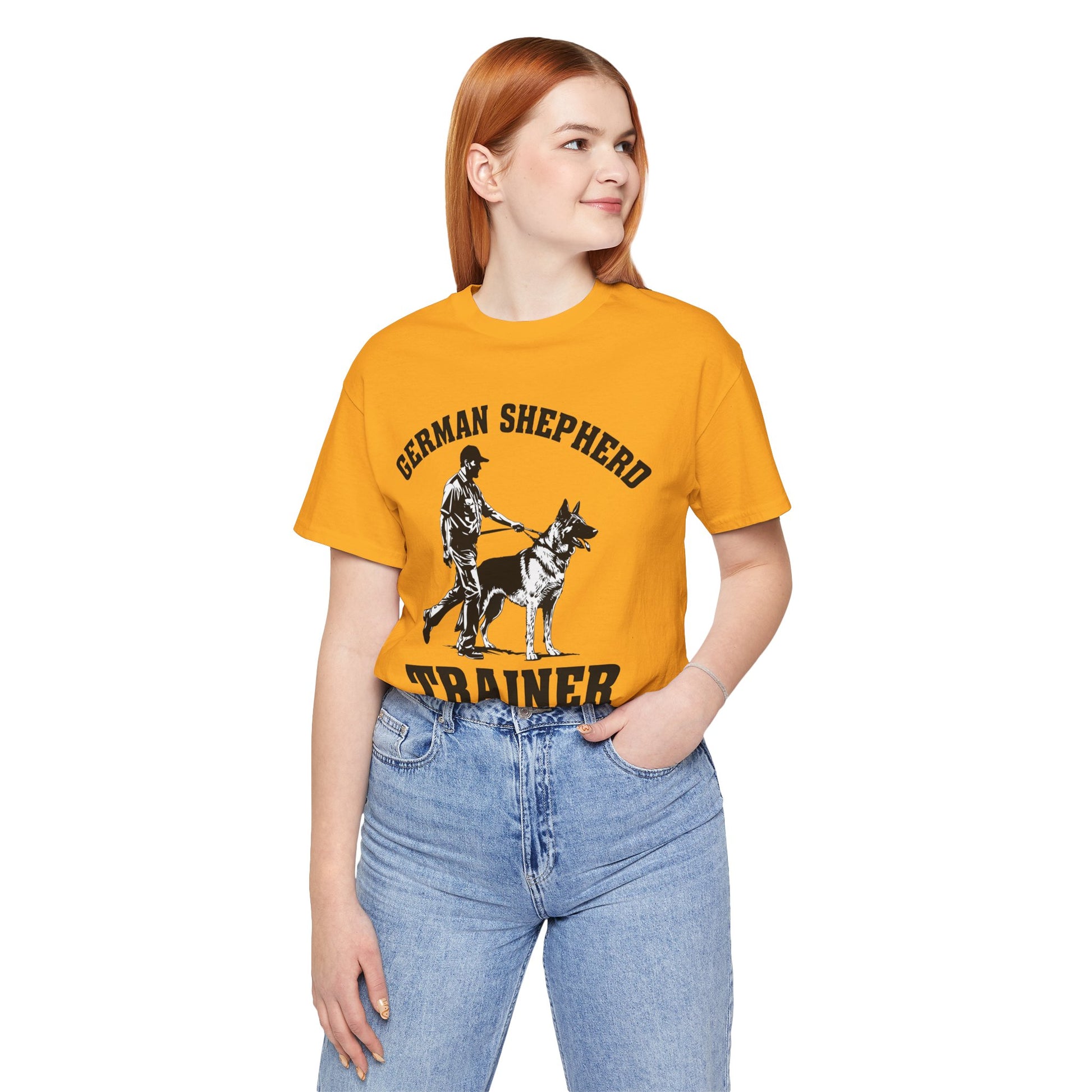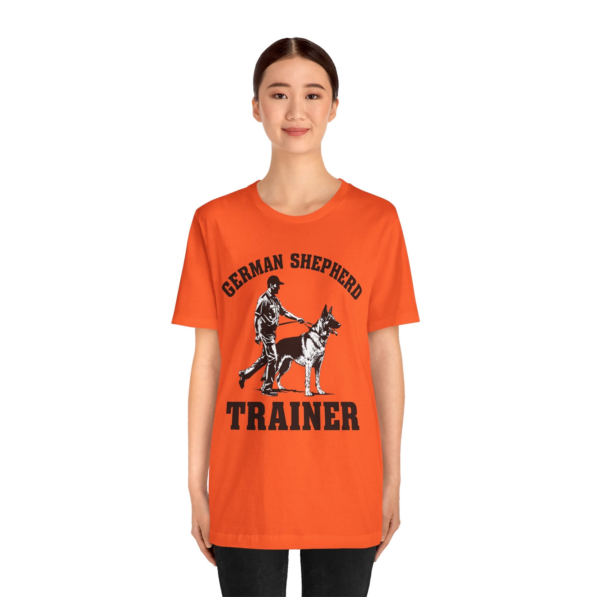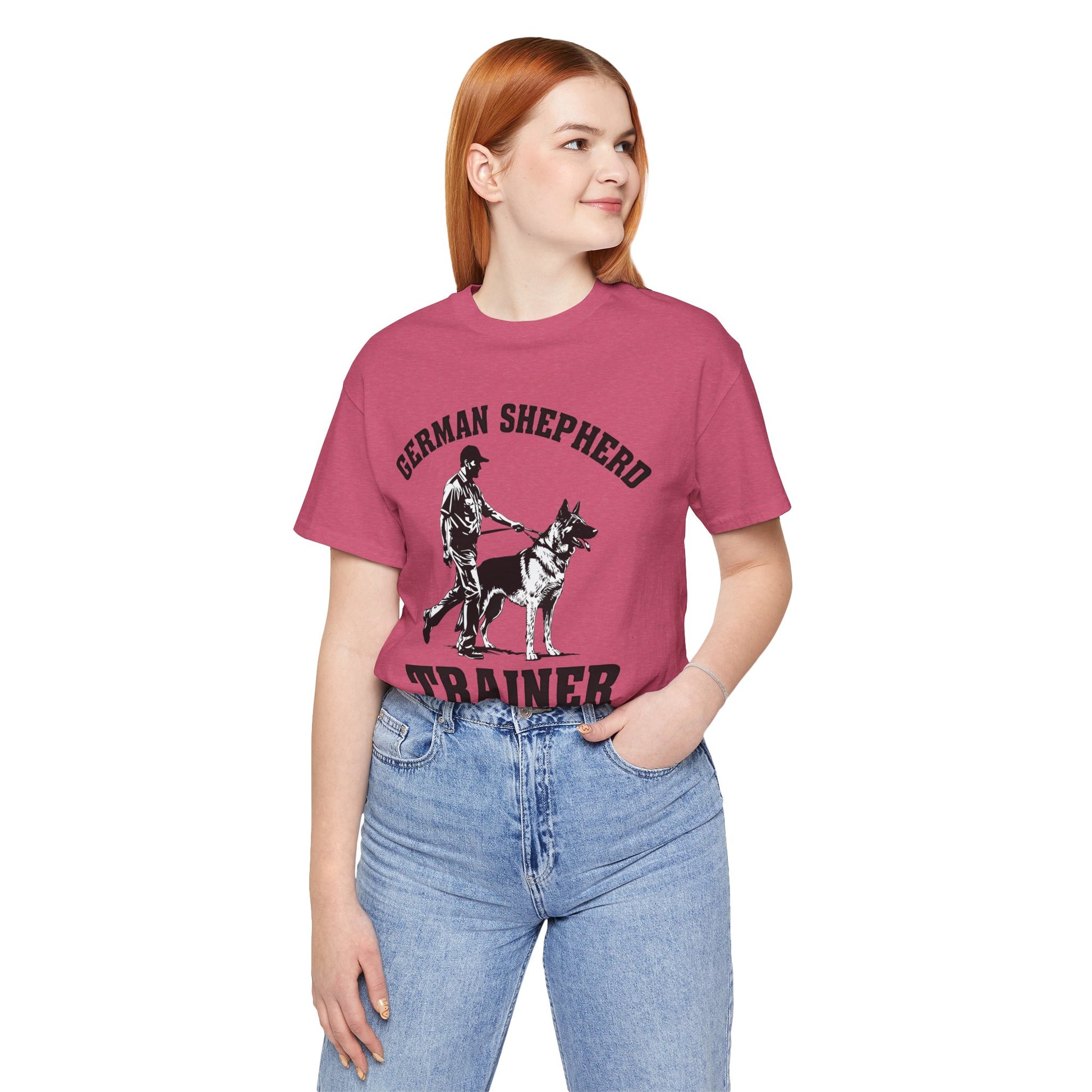 German Shepherd Trainer Tee - Black and White Design of Man Holding a German Shepherd