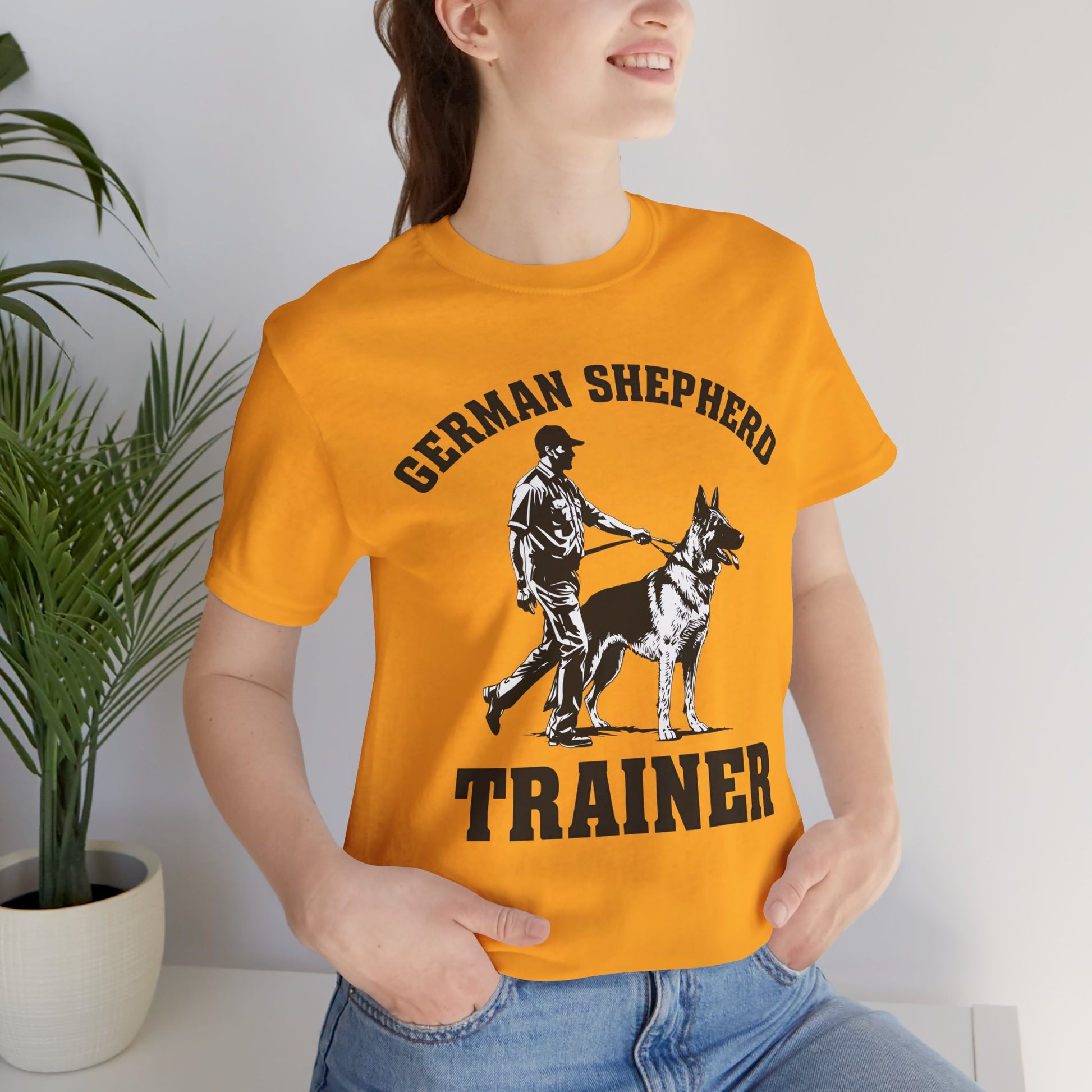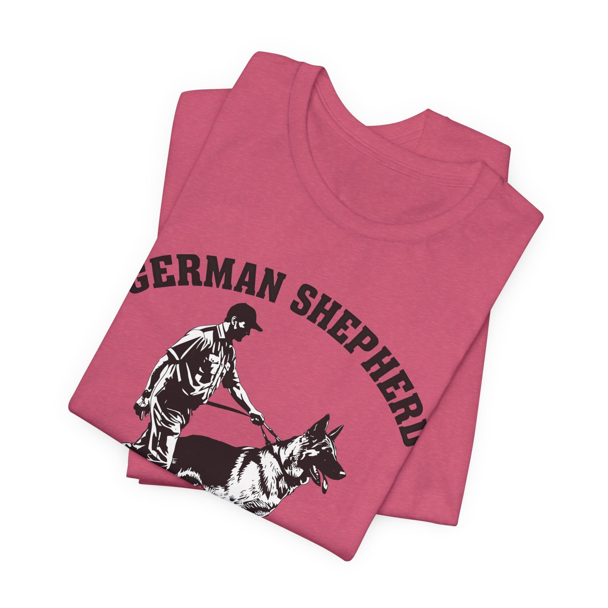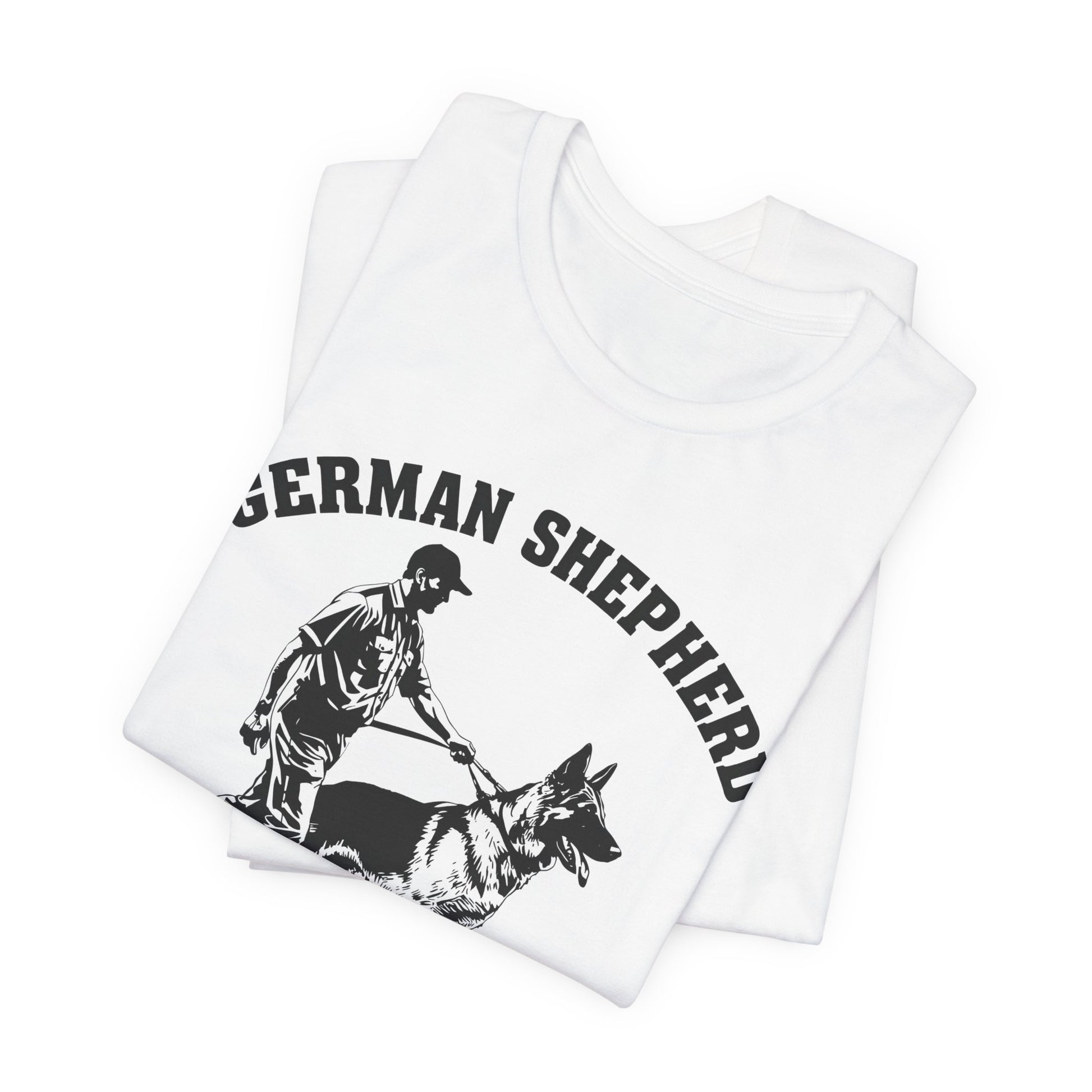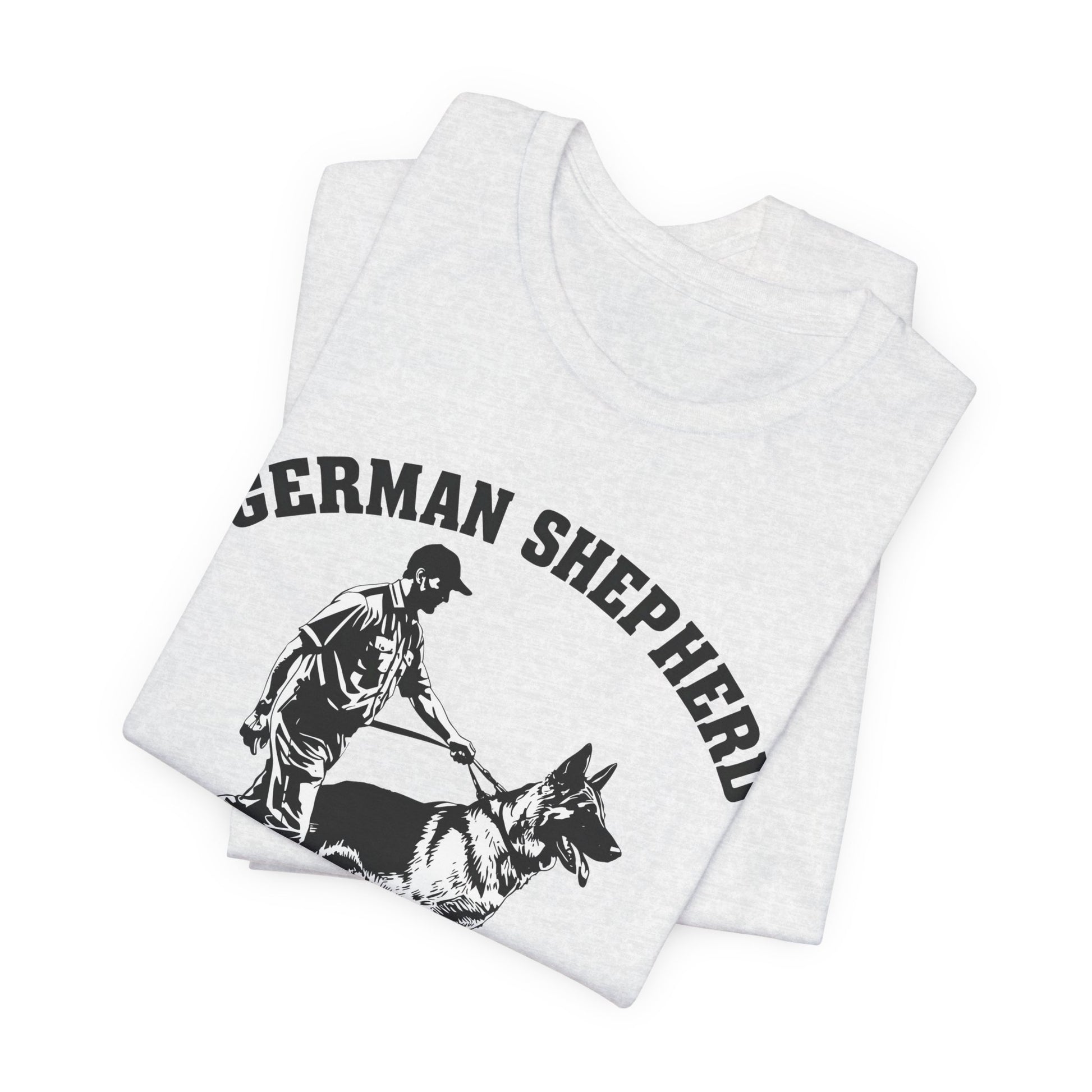 This t-shirt is the perfect gift for dedicated German Shepherd owners, trainers, and enthusiasts. It directly celebrates their passion for the breed with its prominent black and white graphic of a man holding a German Shepherd.