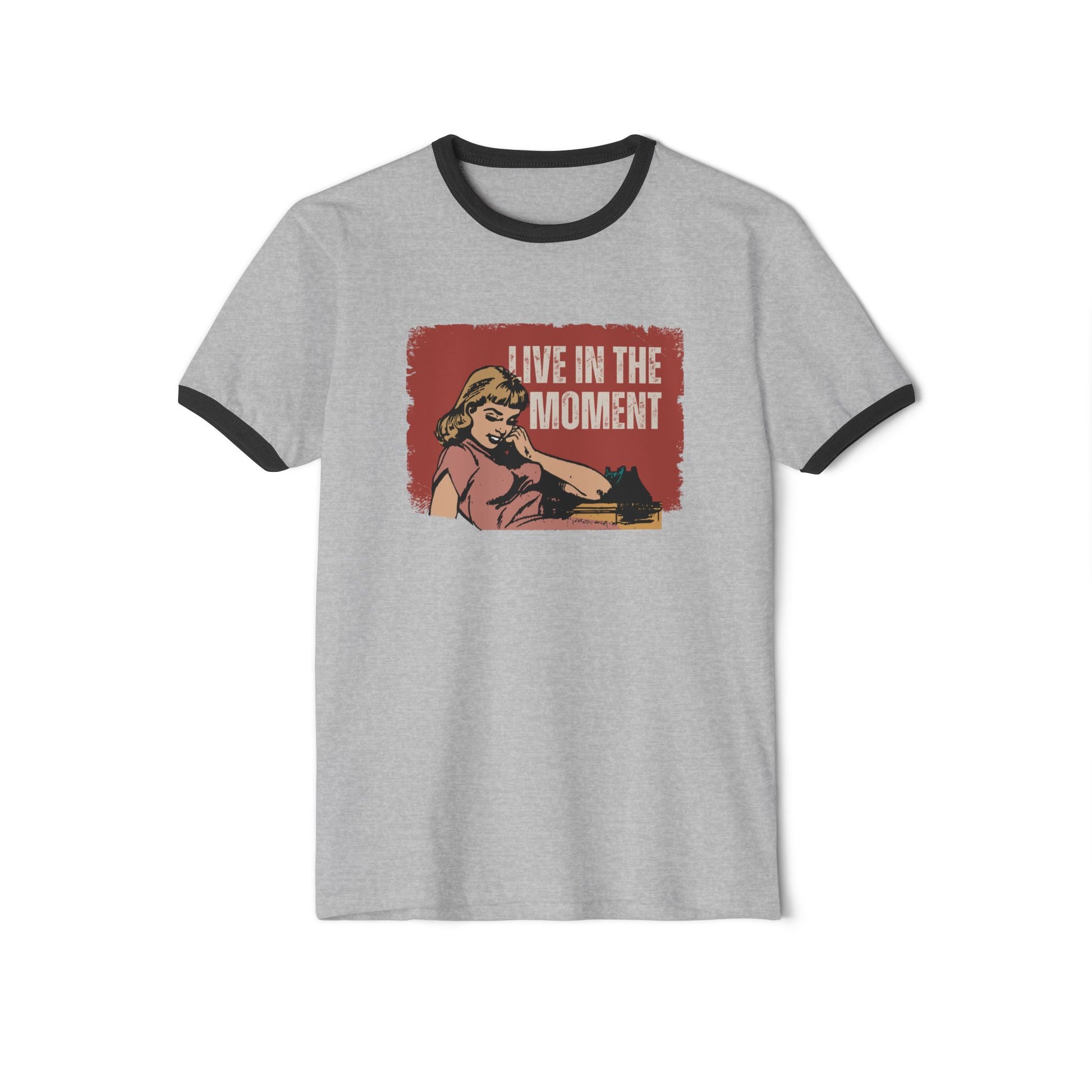 Live in the Moment Unisex Cotton Ringer T-Shirt, Retro Graphic Tee, Casual Wear, Gift for Her, Motivational Trendy Top