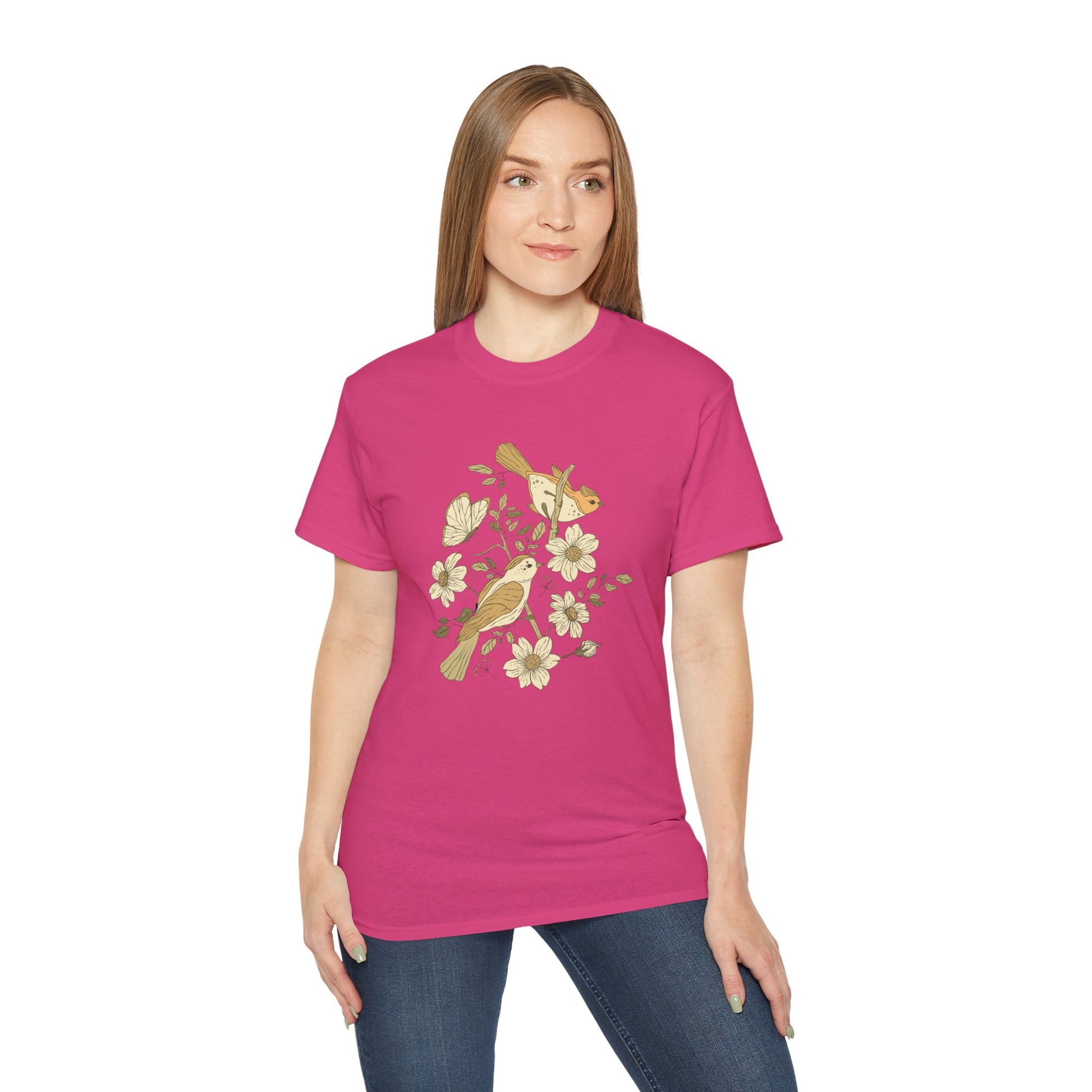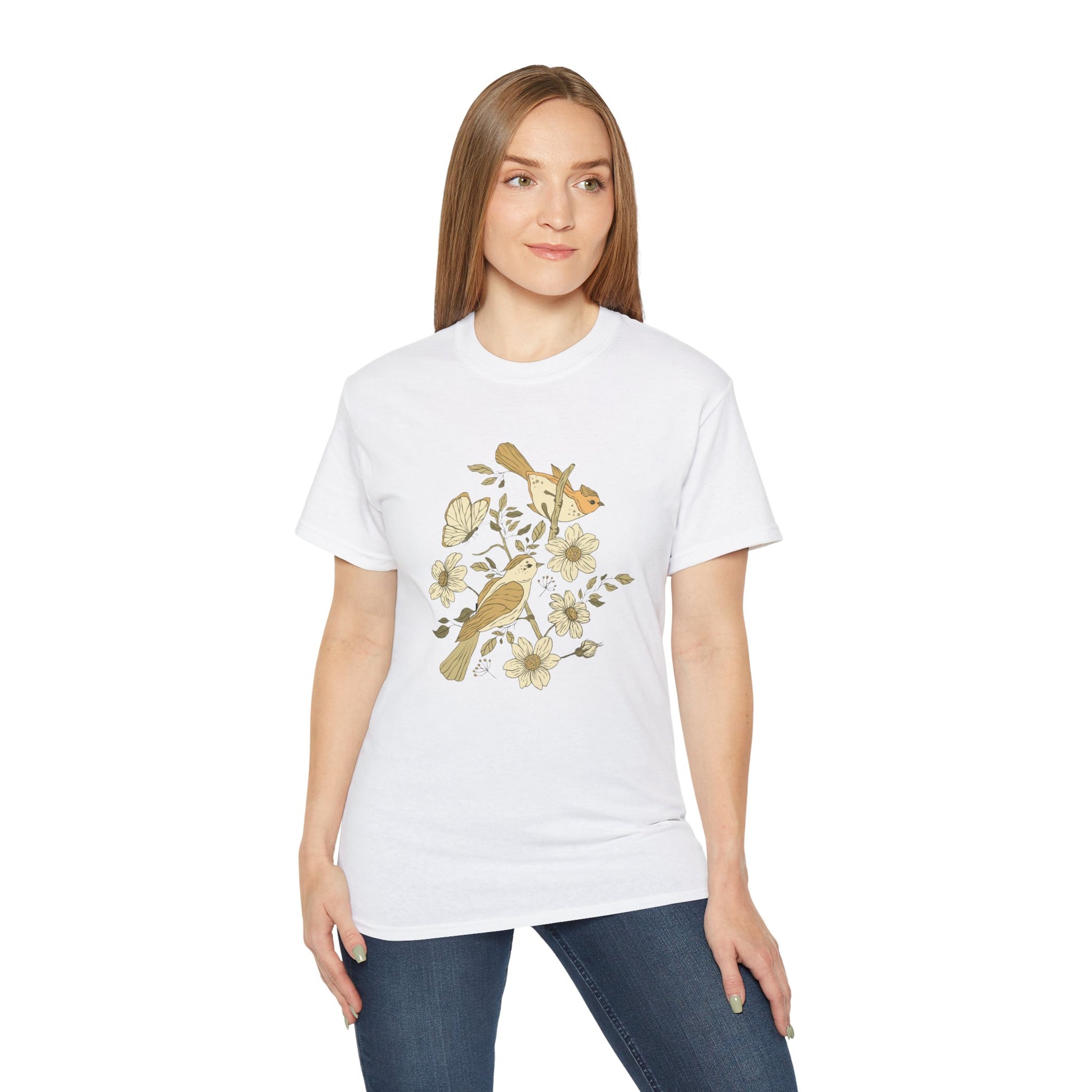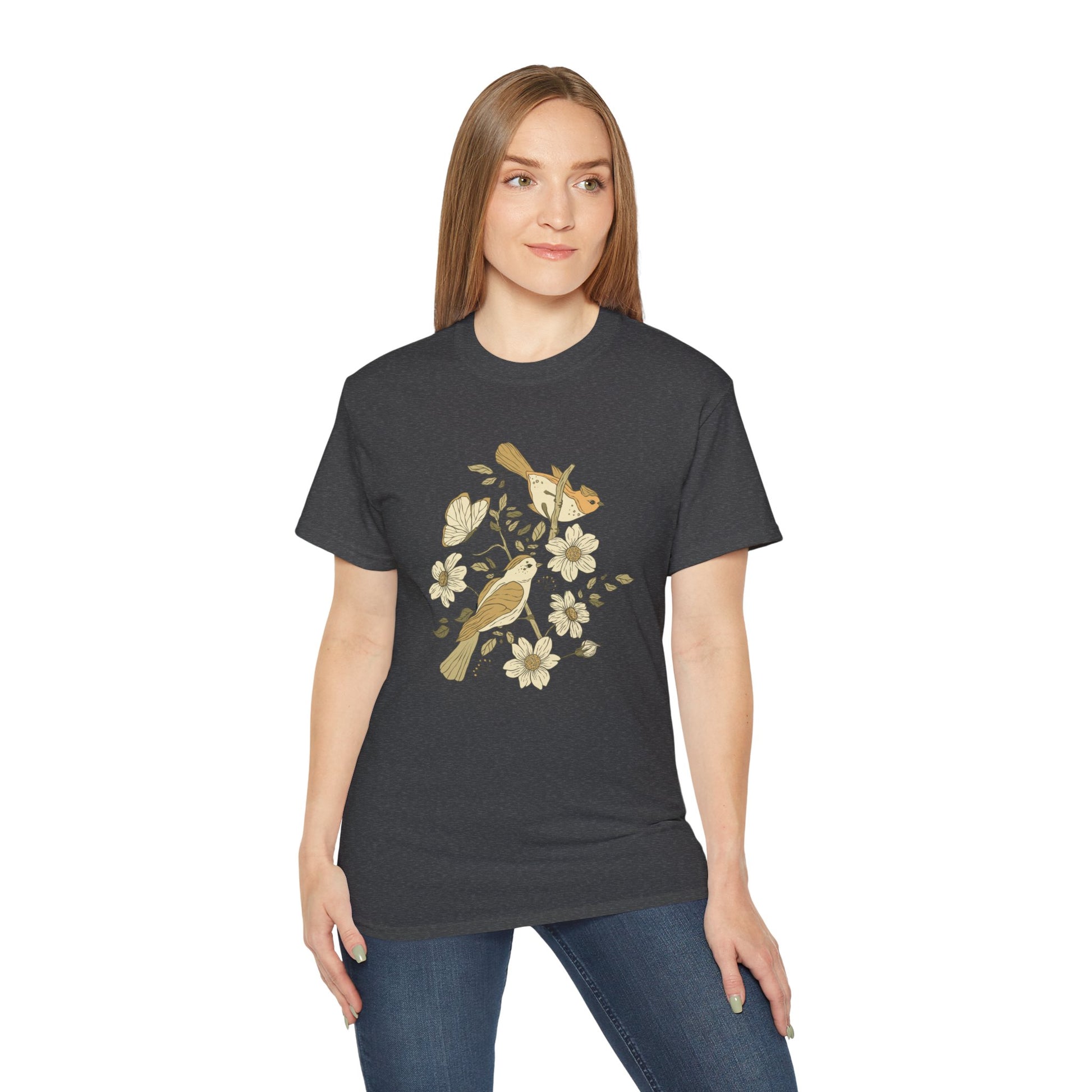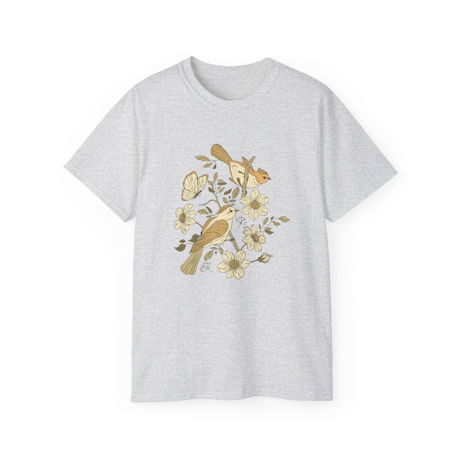 Nature-Inspired Unisex Tee, Floral Bird Print T-Shirt, Gift for Nature Lovers, Spring Fashion, Eco-Friendly Casual Wear
