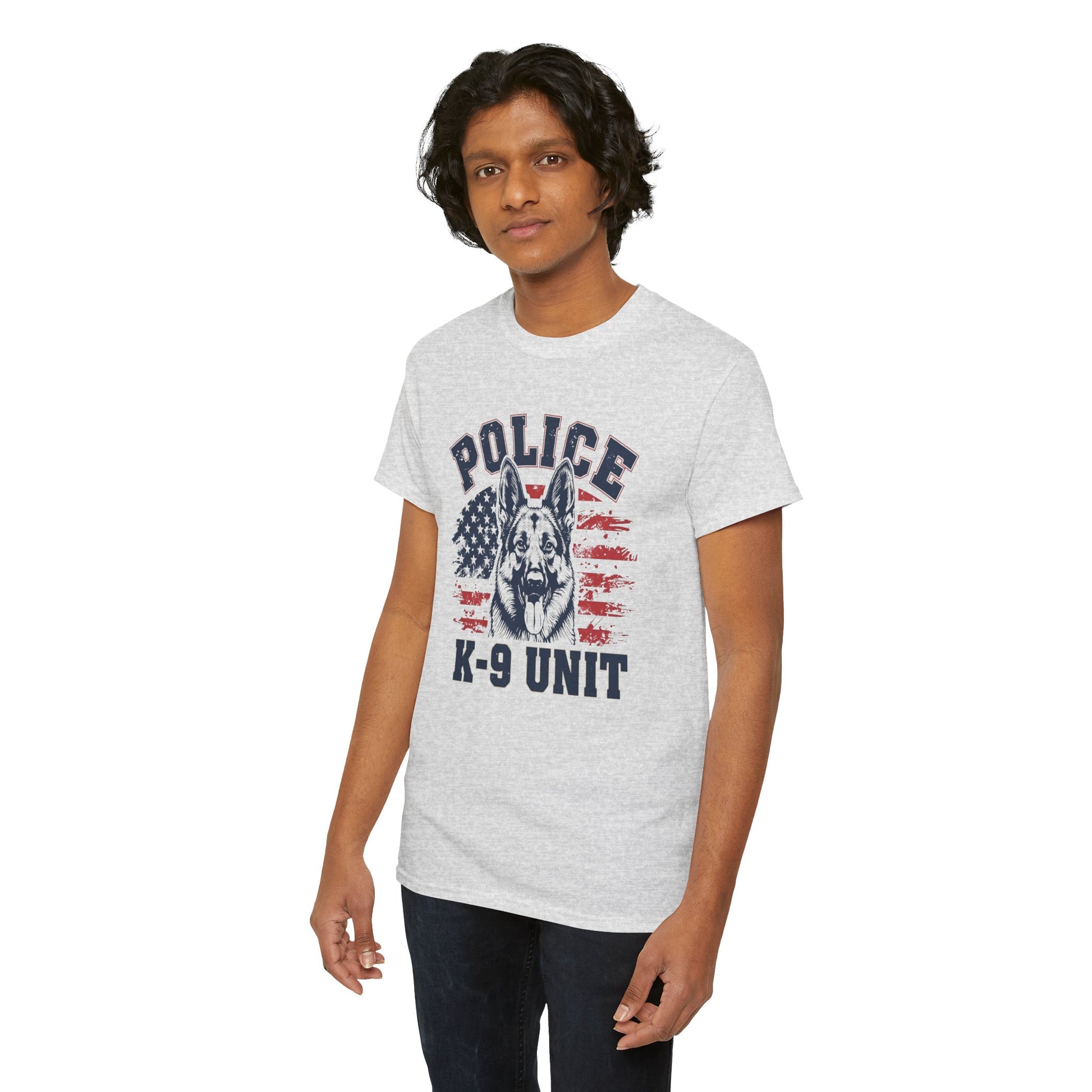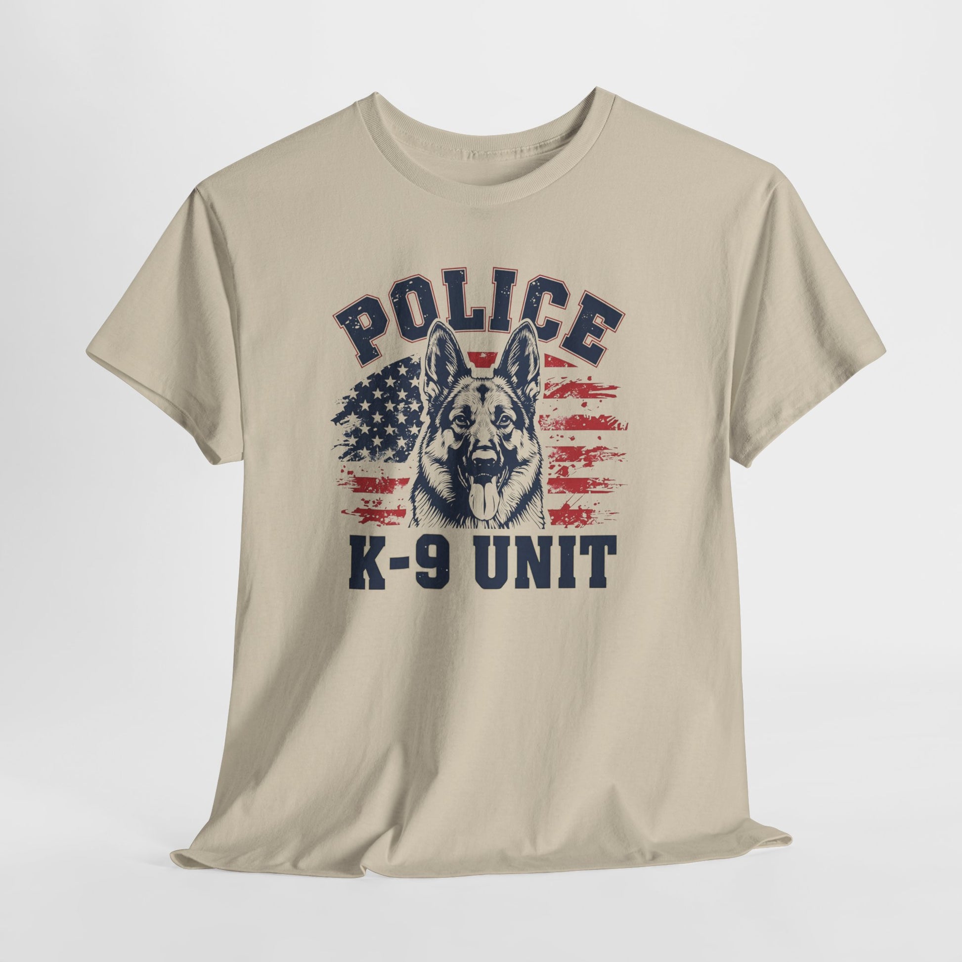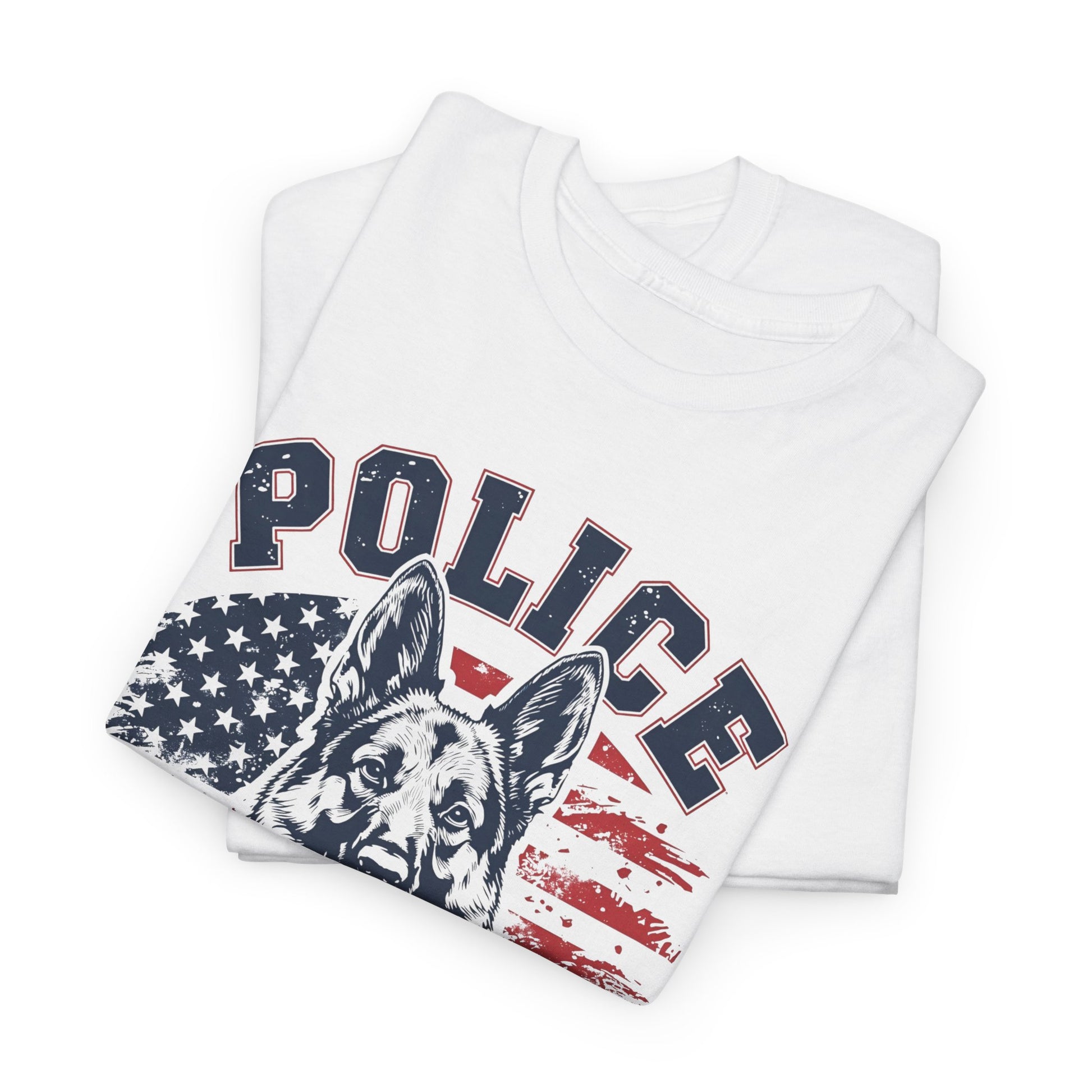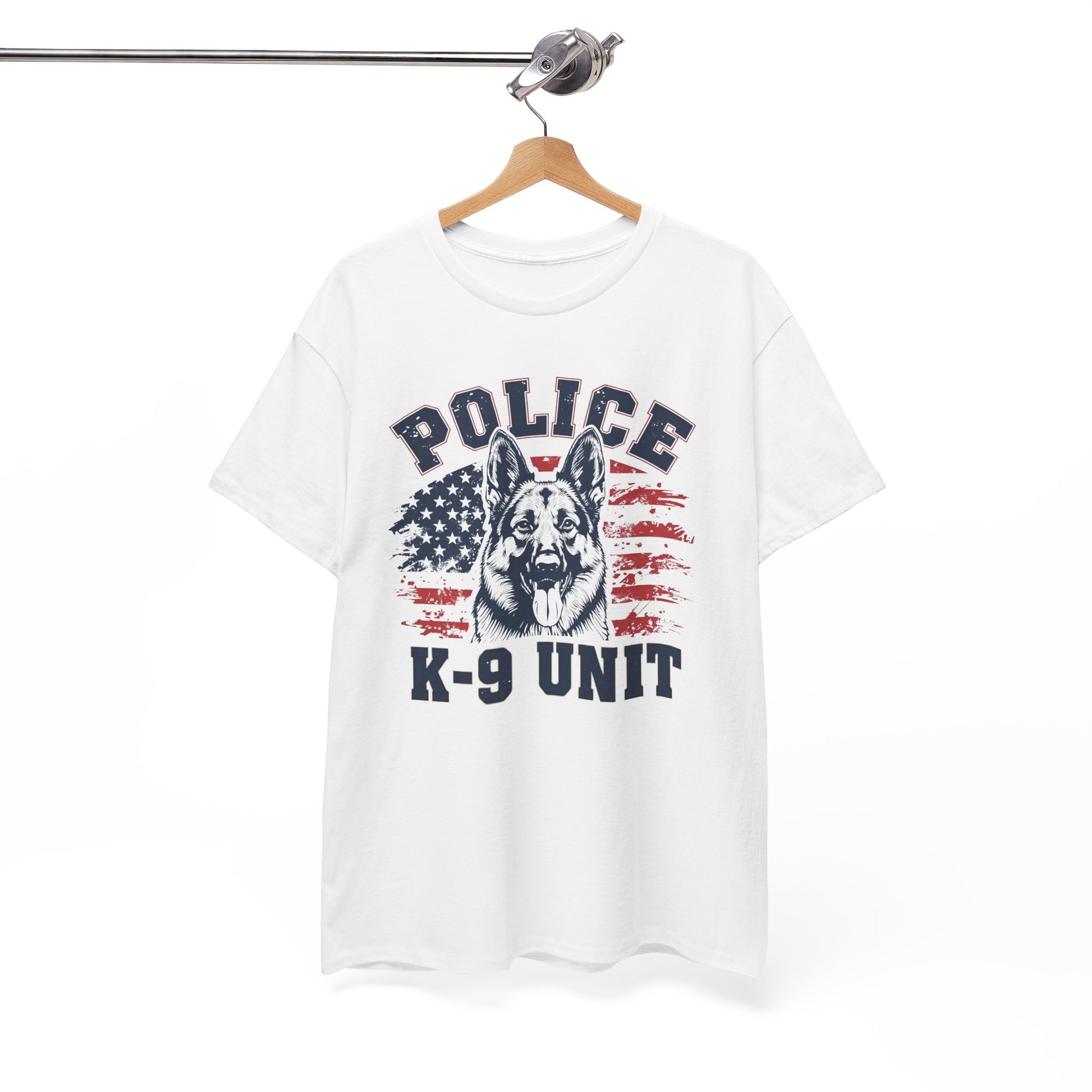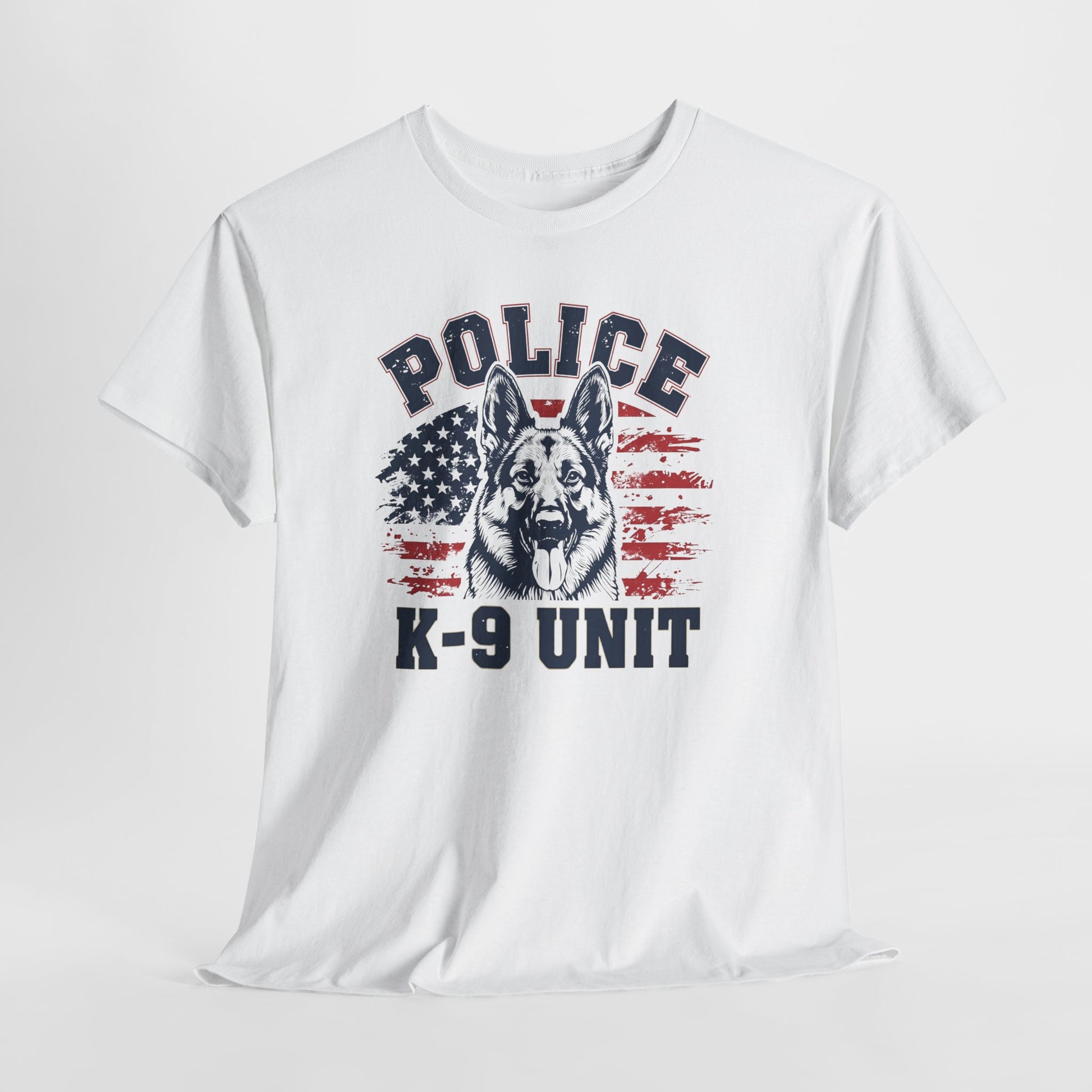 Patriotic Police K-9 Unit T-Shirt With American Flag in Background, Unisex Heavy Cotton Tee