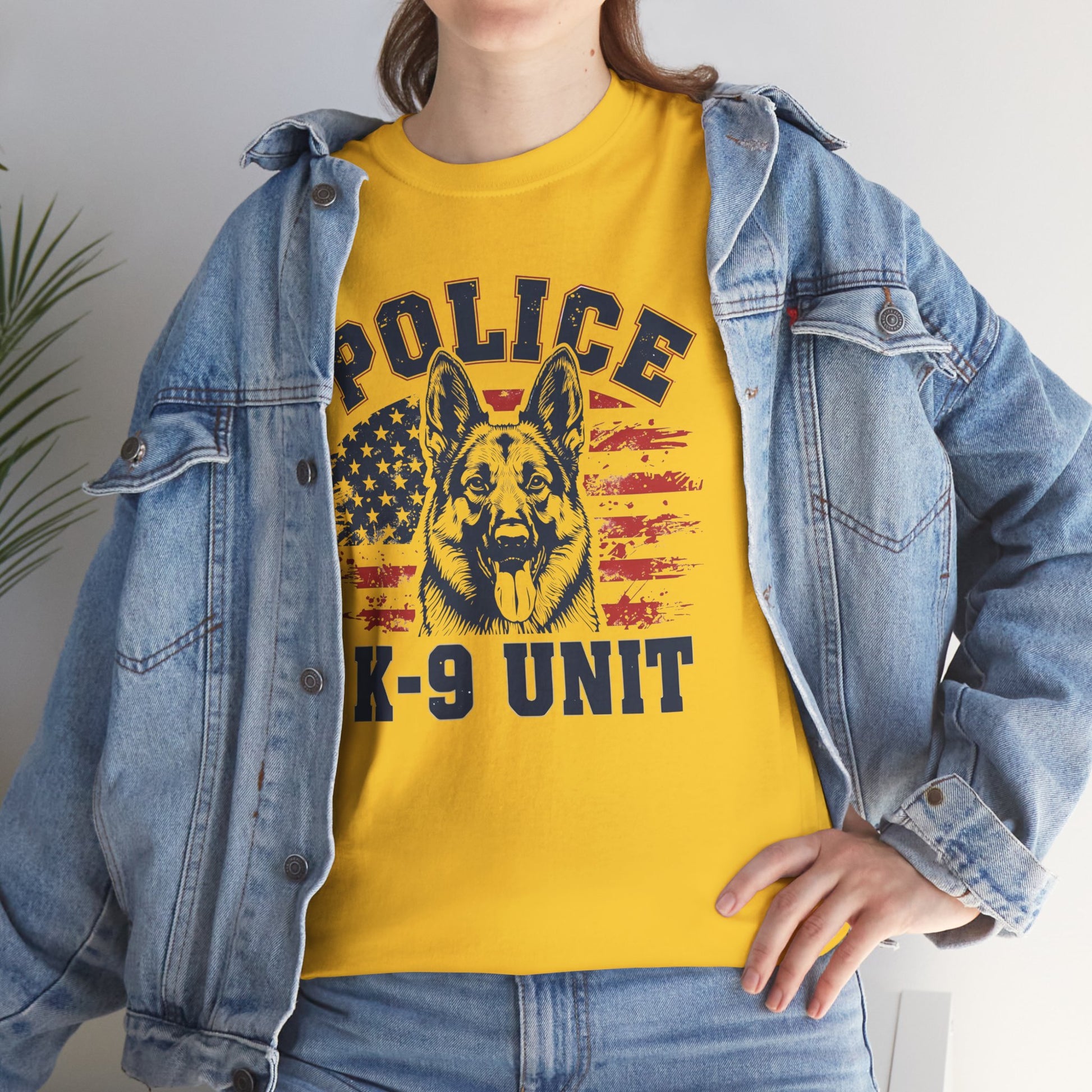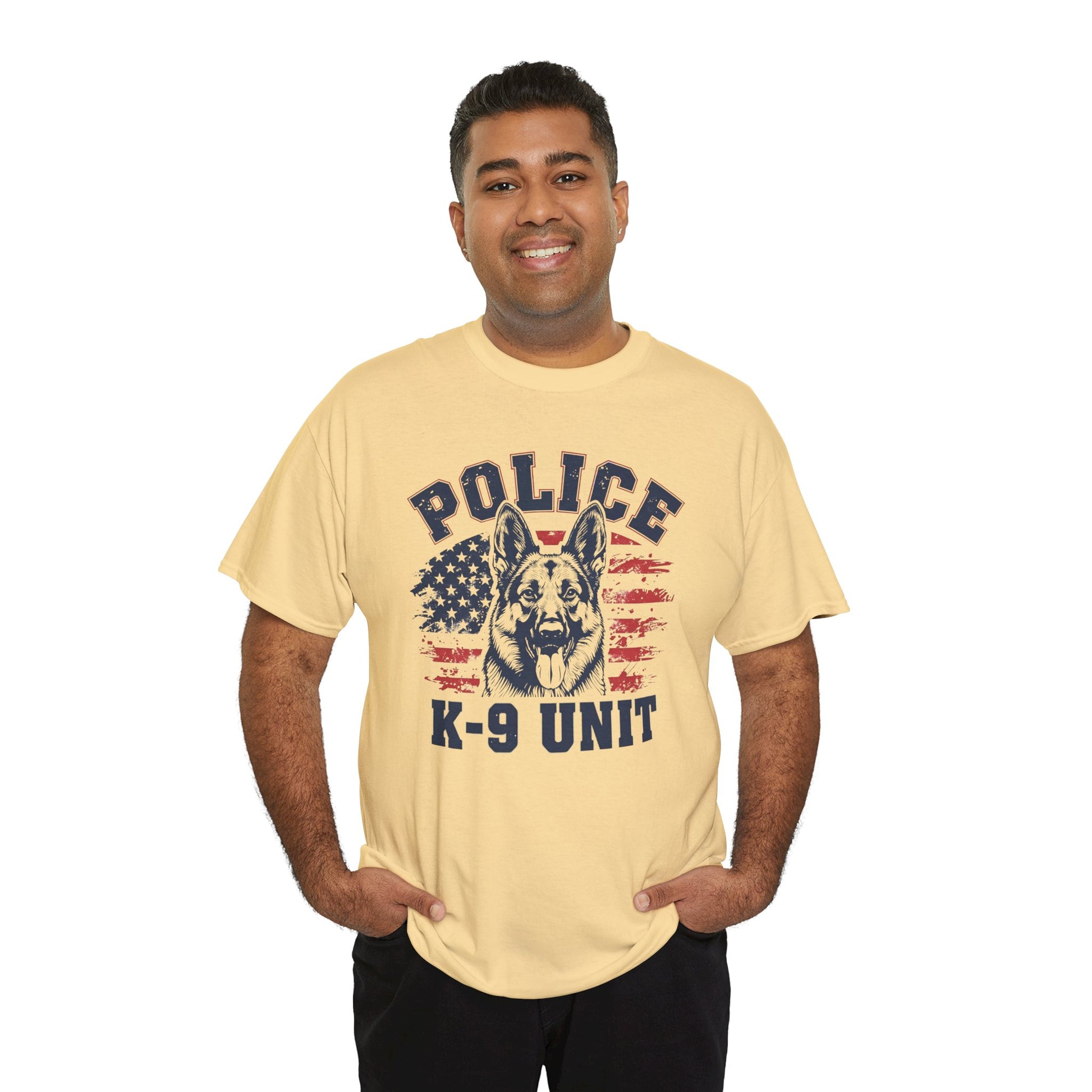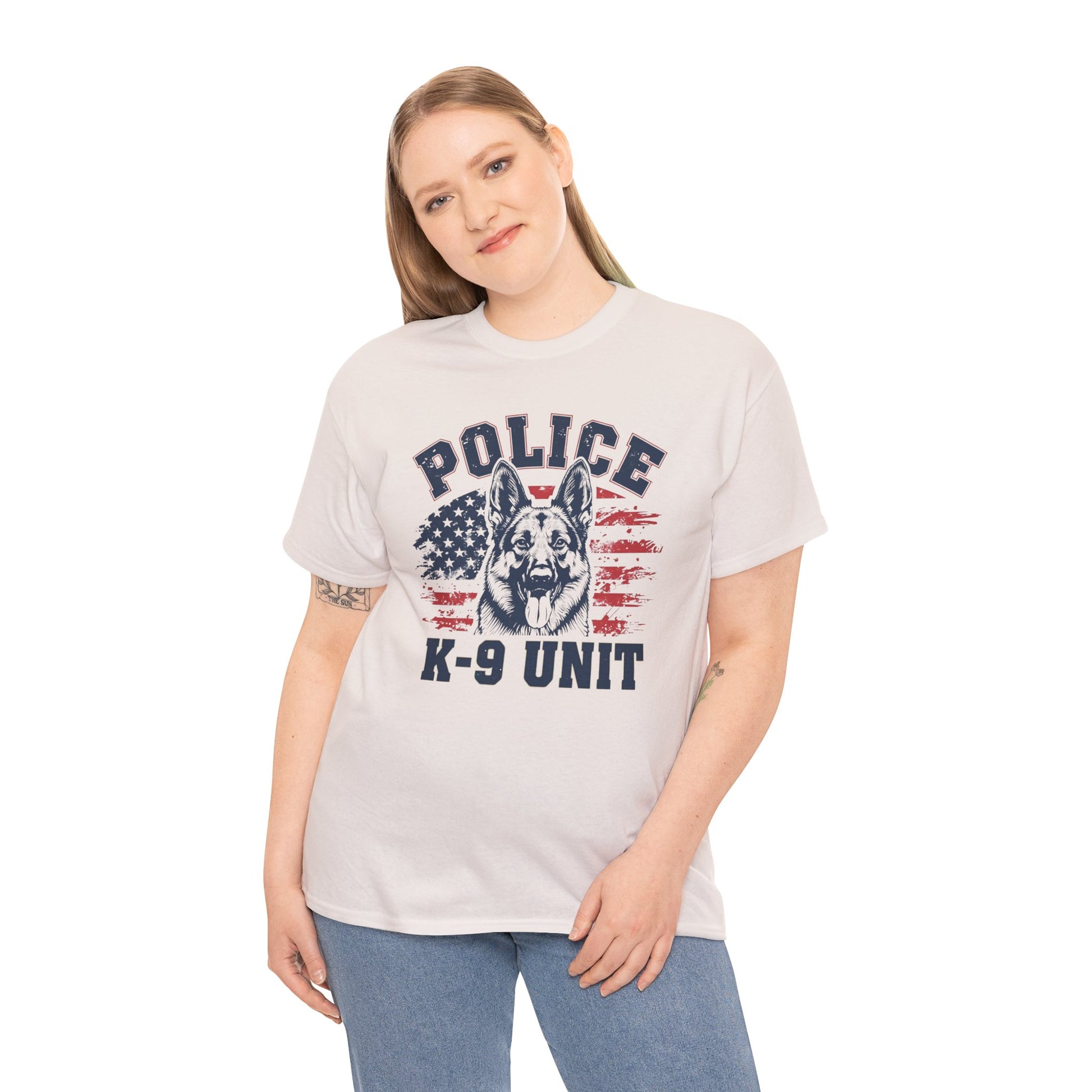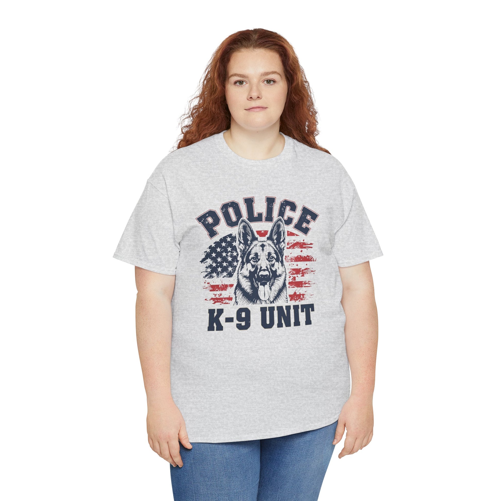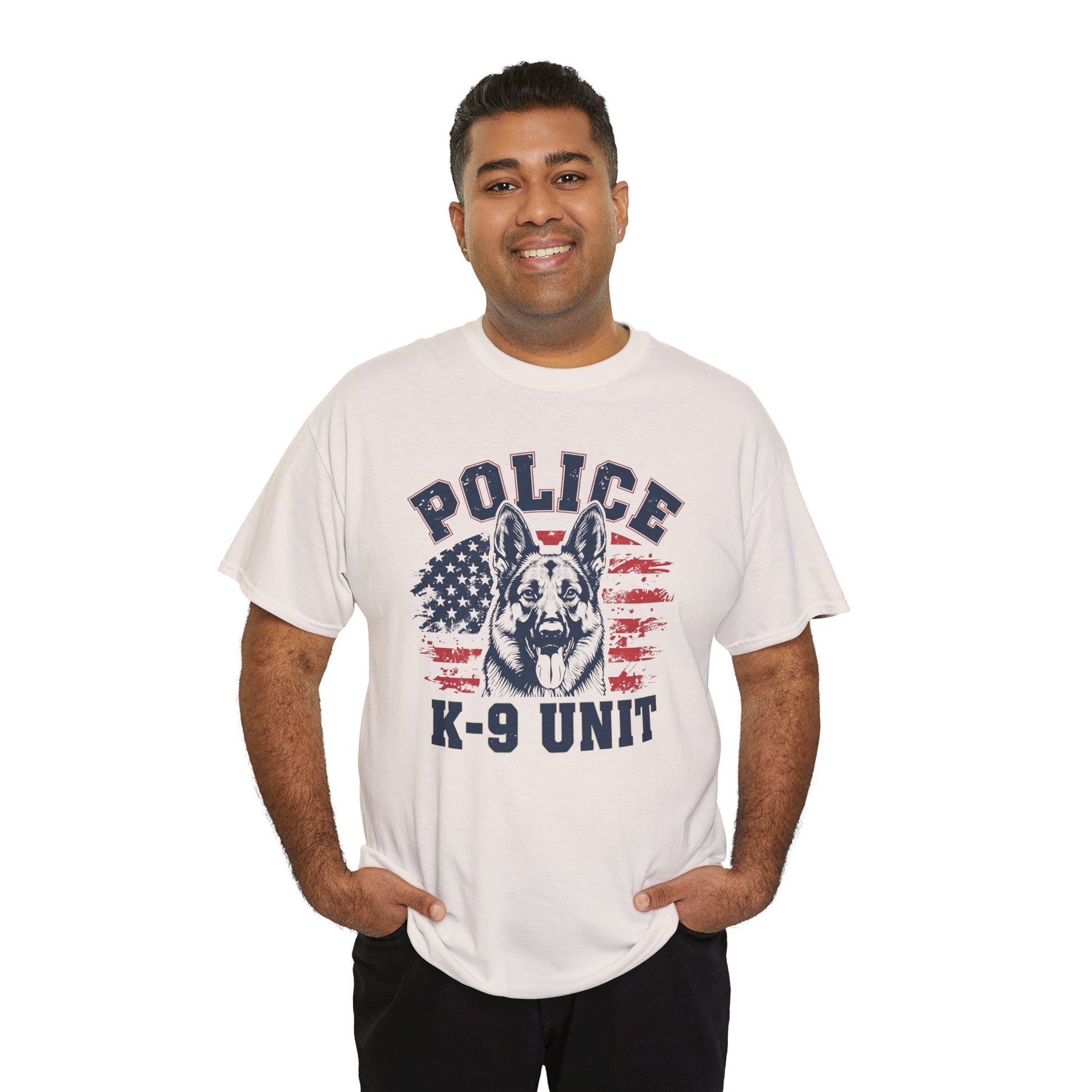 Patriotic Police K-9 Unit T-Shirt With American Flag in Background, Unisex Heavy Cotton Tee