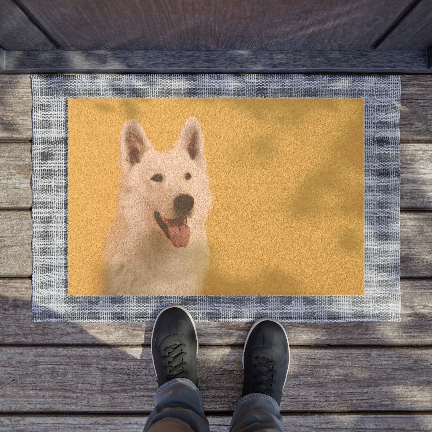 Personalized Dog Face Doormat Featuring a White German Shepherd With a Hanging Tongue