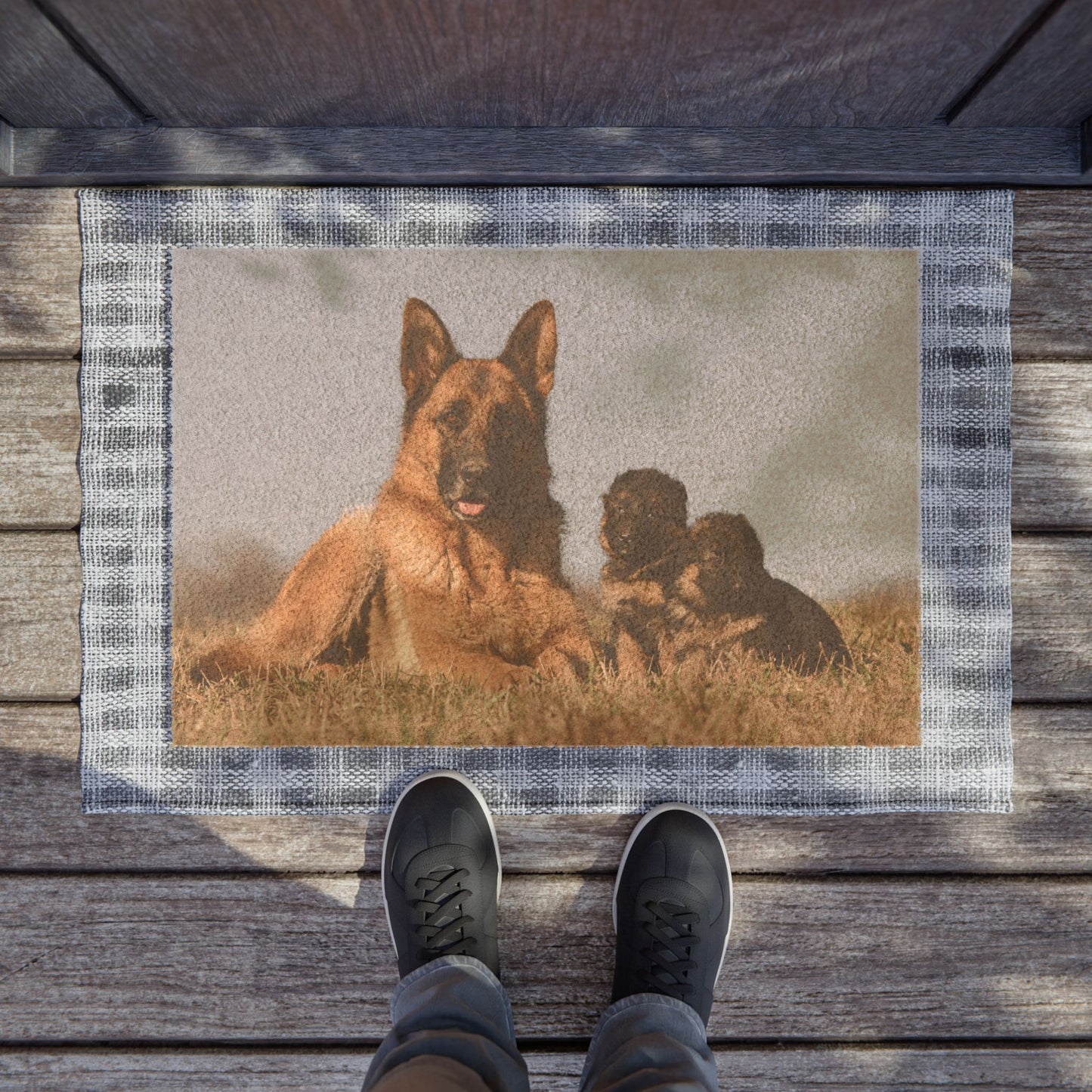 Personalized Dog Family Doormat - German Shepherd and Two Puppies Resting on Vast Field
