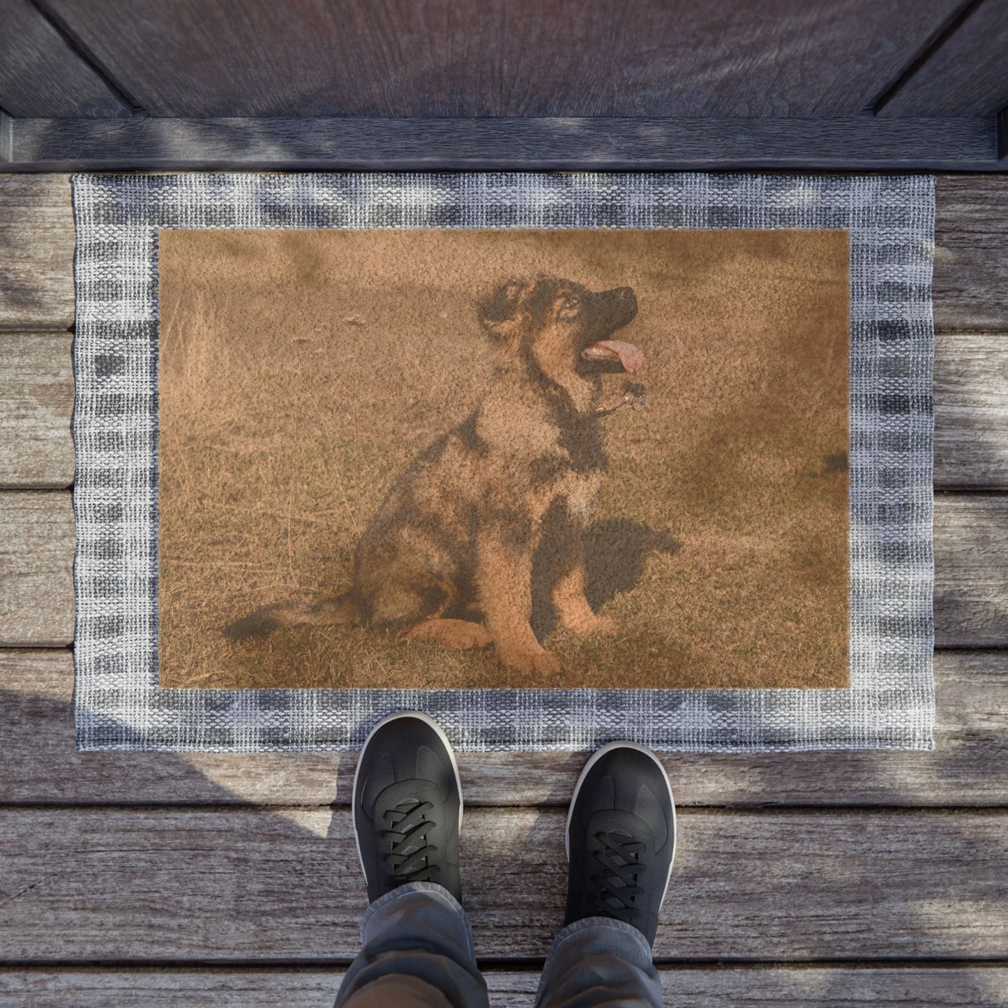 Personalized Pet Welcome Doormat Featuring a Cute Sable German Shepherd Puppy Sloppily Sitting