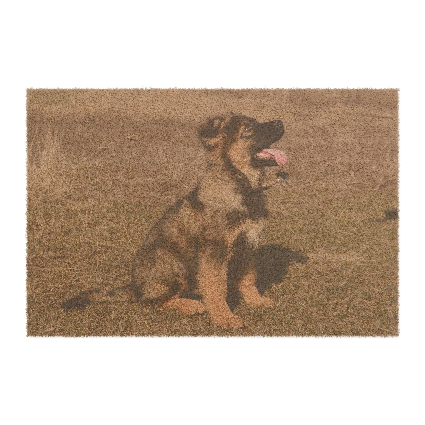 Welcome friends and family with an extra dose of puppy love using this personalized pet doormat featuring your adorable sable German Shepherd! This custom-designed mat showcases your fluffy companion in all their playful glory—captured mid-sloppy sit with that irresistible puppy charm. Measuring 24" × 16" (61cm x 40.6cm), it creates the perfect first impression at your entryway while trapping dirt and debris.