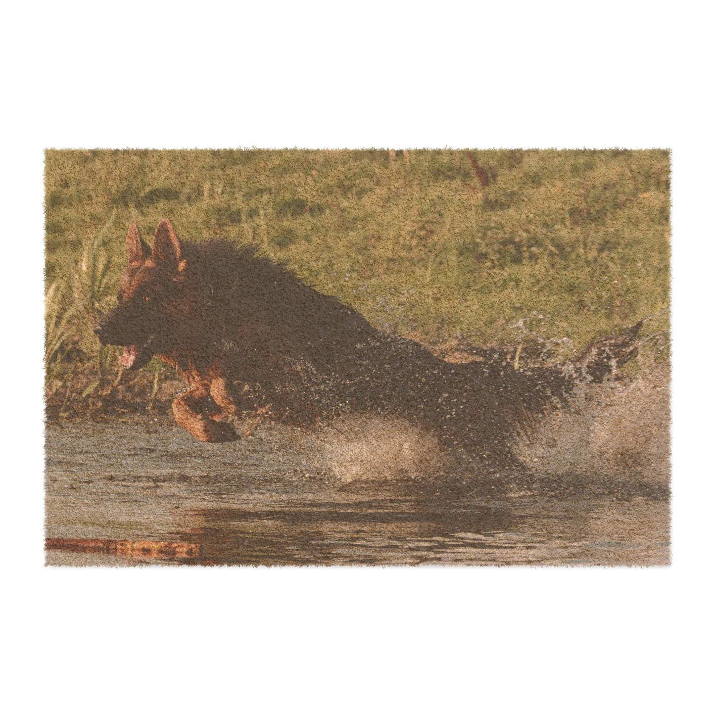 Pet Lovers Doormat Featuring a German Shepherd Jumping in the Water