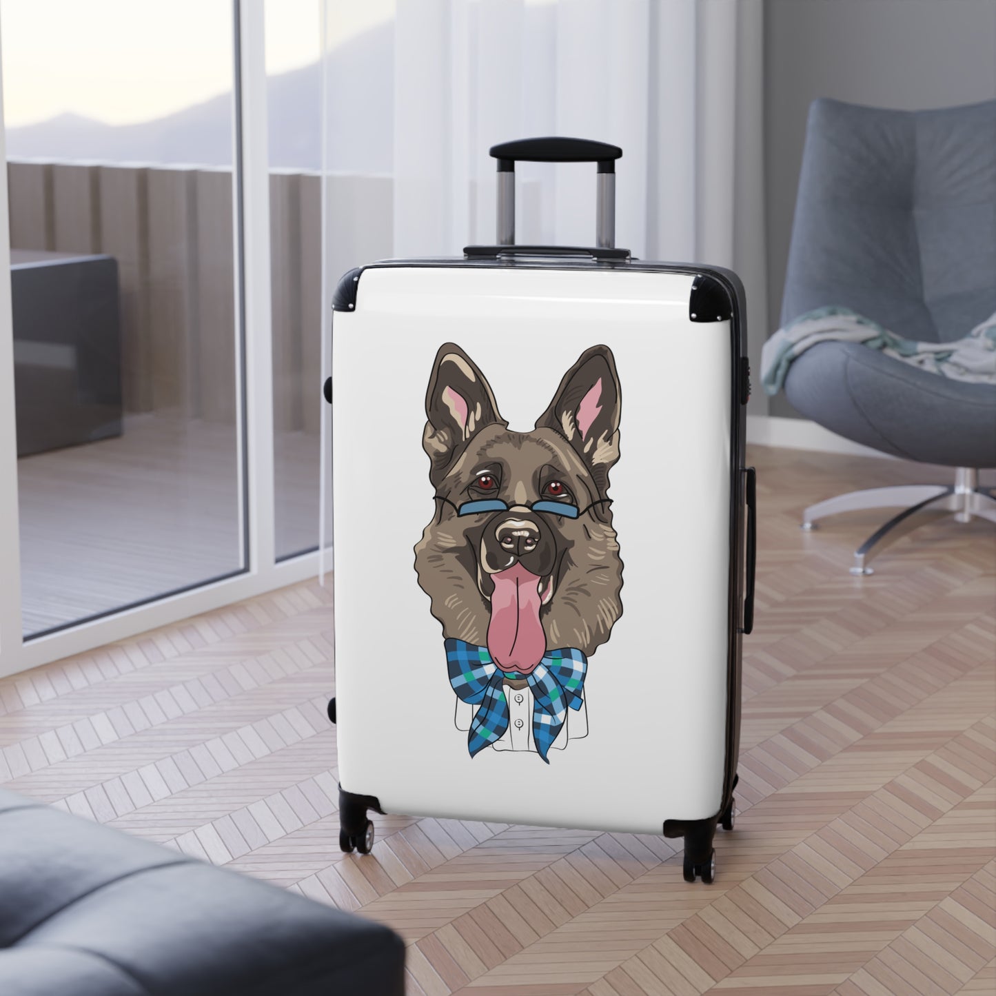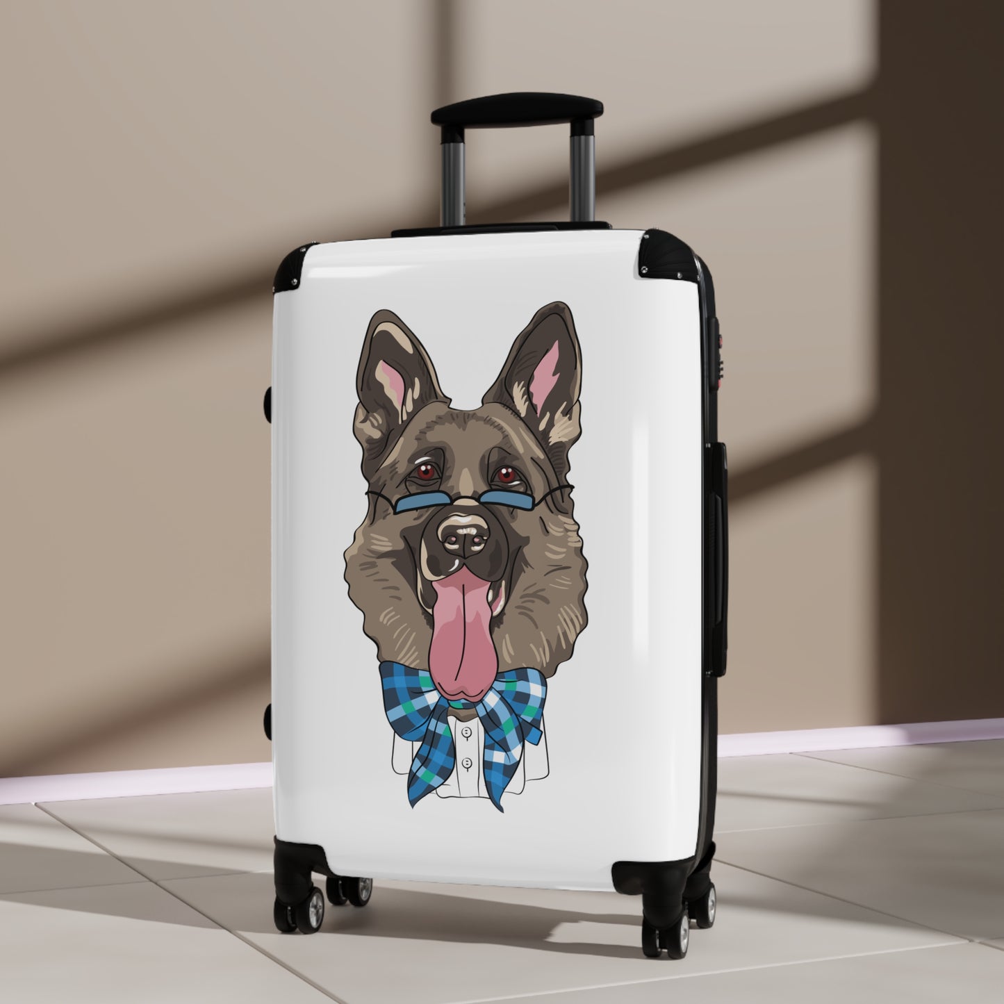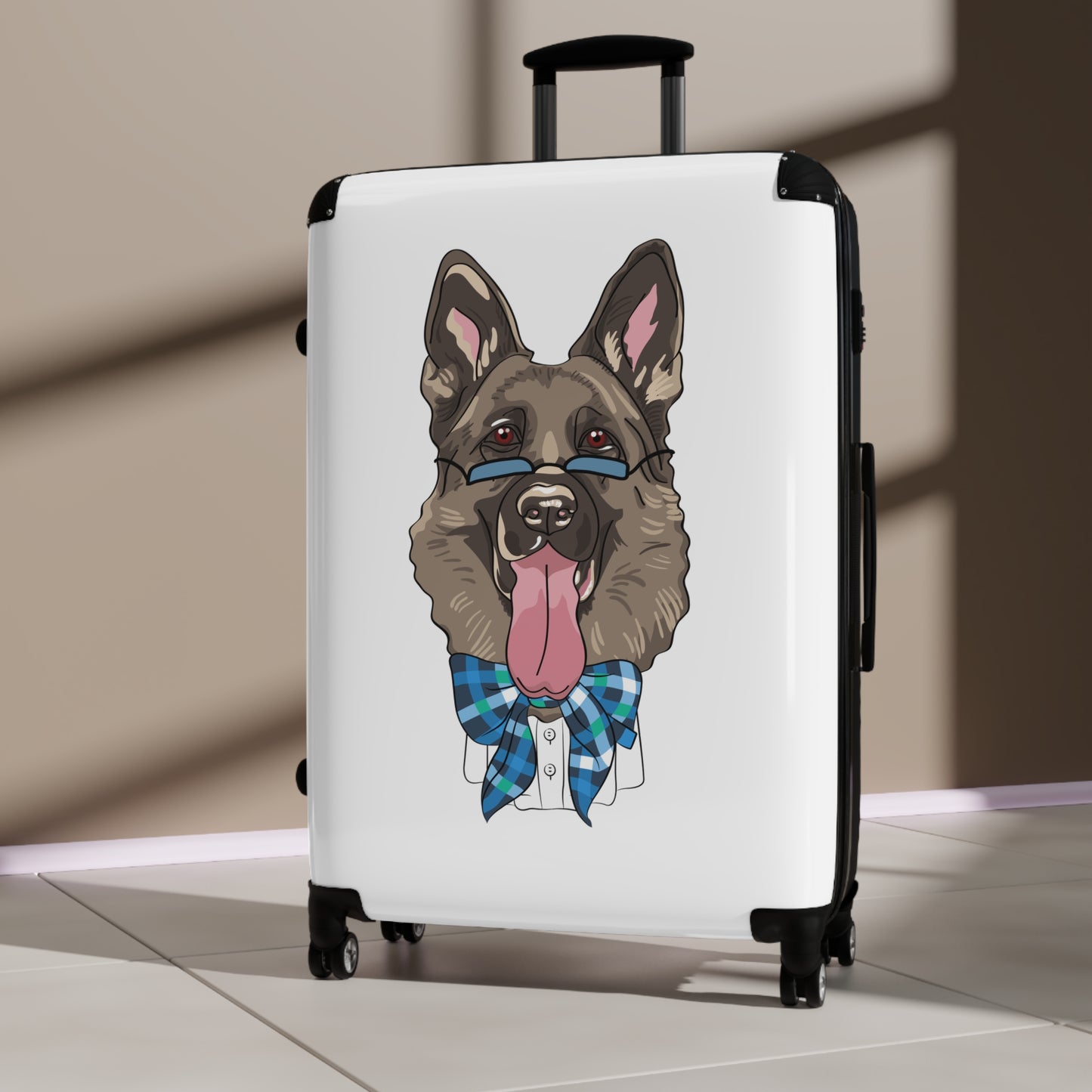 Turn heads at every terminal with this irresistibly stylish suitcase featuring a dapper German Shepherd in blue glasses and bow tie, tongue lolling out in playful charm! Designed for pet lovers with a flair for fun, this eye-catching luggage combines high-end durability with delightful canine personality. The scratch-resistant polycarbonate front and rugged ABS back hard-shell stand up to rough handling, while the four ultra-smooth 360° spinner wheels glide effortlessly through crowds—just like your shepherd dashes to greet you at the door.
