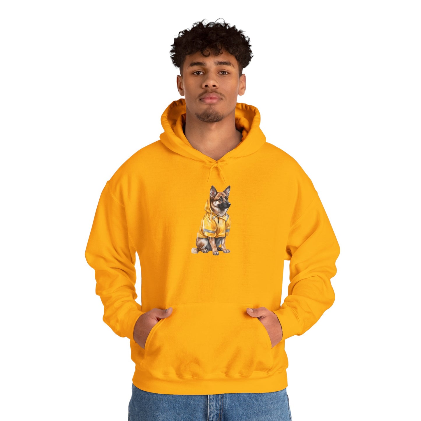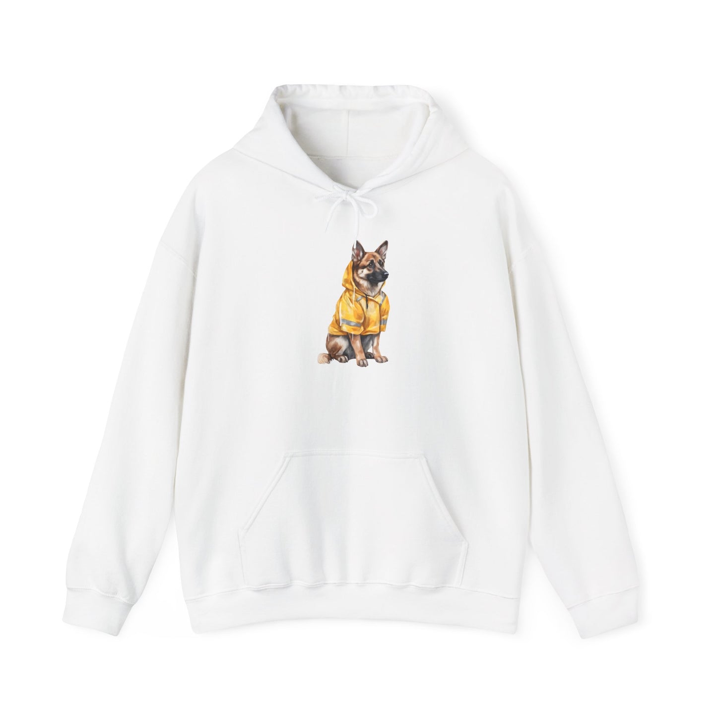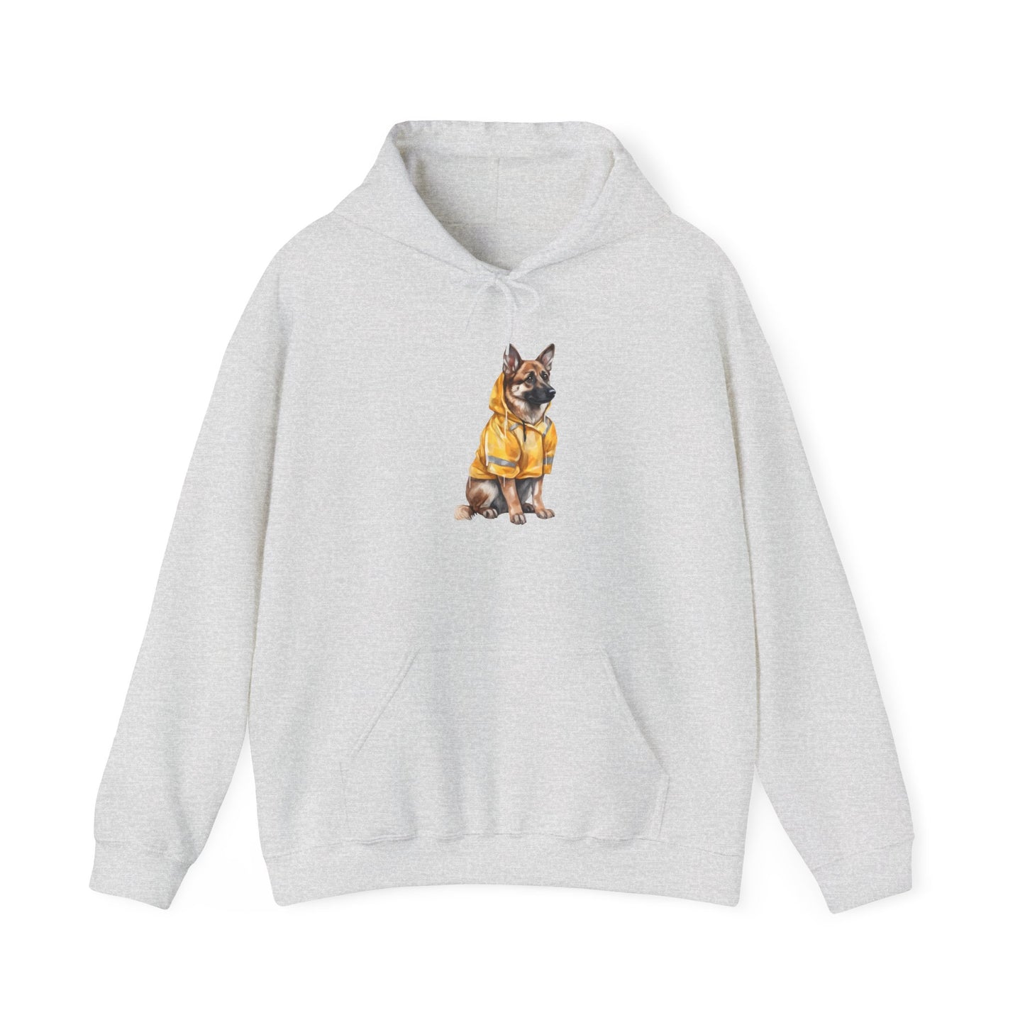 Unisex Dog Lover Hoodie With a Graphic of German Shepherd Wearing a Yellow Rain Coat
