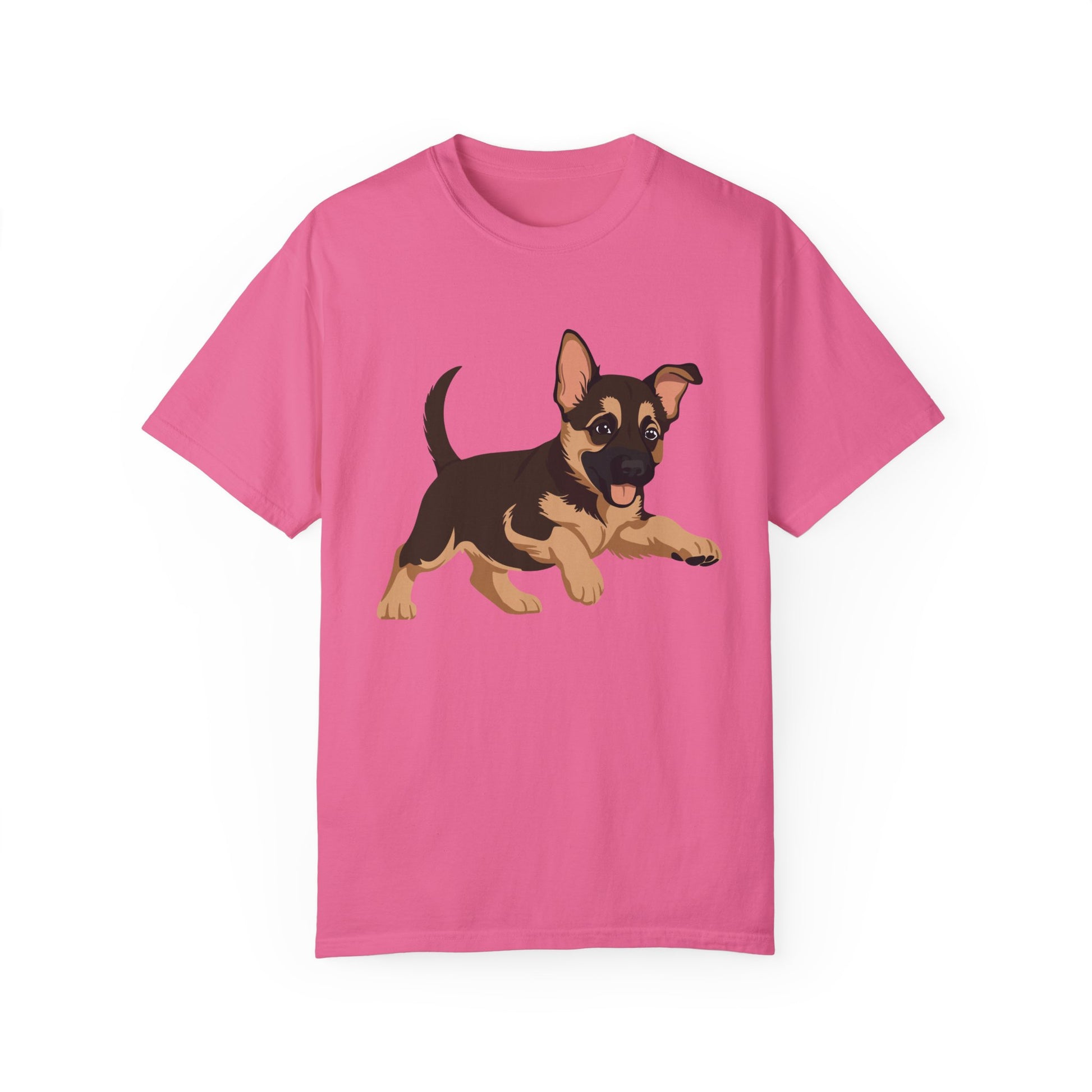 Capture the playful spirit of man's best friend with this charming unisex tee featuring an adorable graphic of a German Shepherd puppy in mid-play. The garment-dyed, 100% ring-spun cotton fabric (6.1 oz) gives this shirt a soft, lived-in feel with a subtle vintage look that gets better with each wash. Designed for both comfort and durability, the pre-shrunk fabric maintains its shape over time, while double-needle stitching reinforces every seam for long-lasting wear. The playful puppy design—whether chasing a ball, romping in the grass, or simply being irresistibly cute—celebrates the joyful energy of German Shepherds. Available in multiple colors and sizes (S to 4XL), this tee is perfect for dog lovers who want to showcase their affection for the breed in a fun, laid-back style. Ideal for casual outings, dog park adventures, or cozy days at home with your furry companion.
