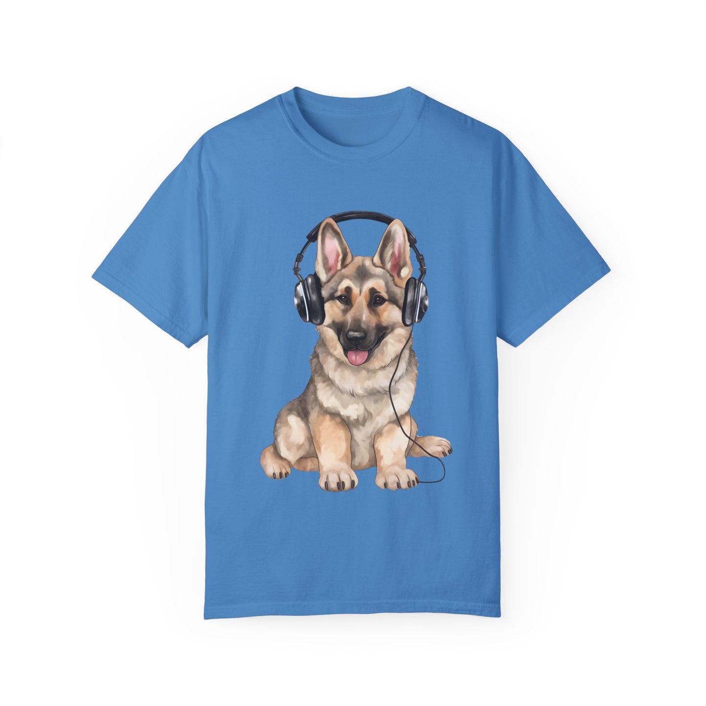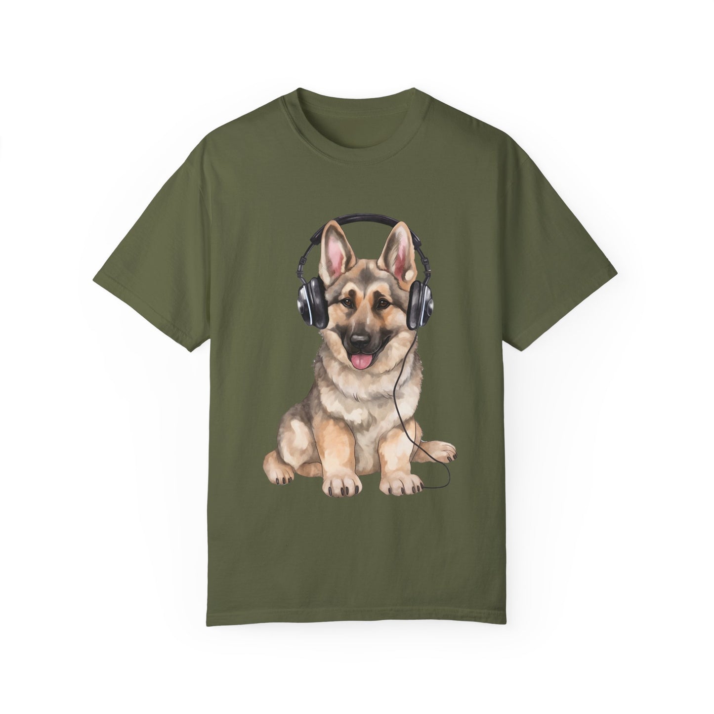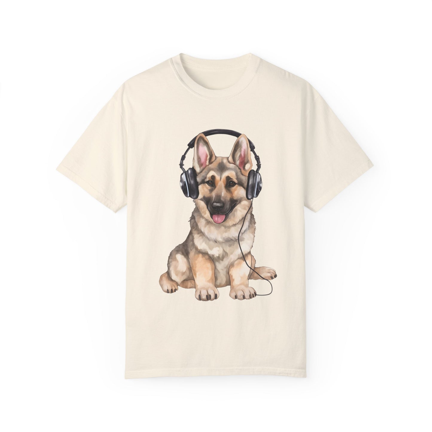 The garment dyed t-shirt featuring a black and cream young German Shepherd graphic wearing headphones and enjoying music is a stylish and unique piece for both men and women. This design combines a love for pets with a trendy and music-inspired aesthetic, making it a great choice for animal lovers and music enthusiasts alike. The high-quality dyeing process ensures a rich and vibrant color that is long-lasting, while the comfortable fabric provides a soft and cozy feel. Whether you're heading to a casual outing or just relaxing at home, this t-shirt is sure to make a statement and showcase your individuality.