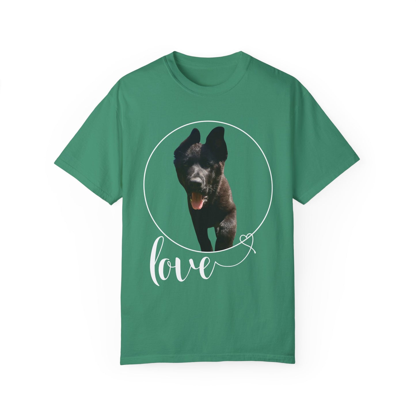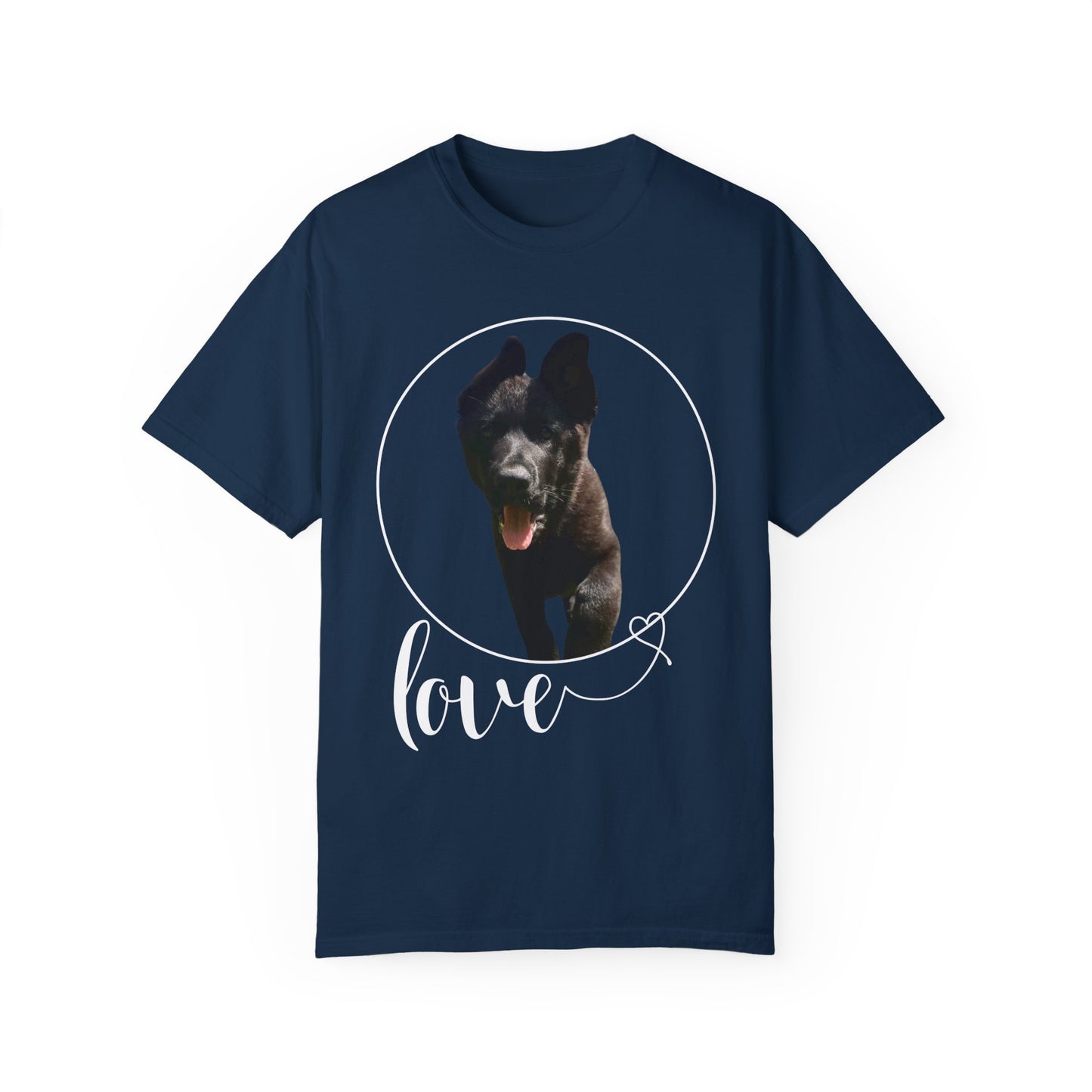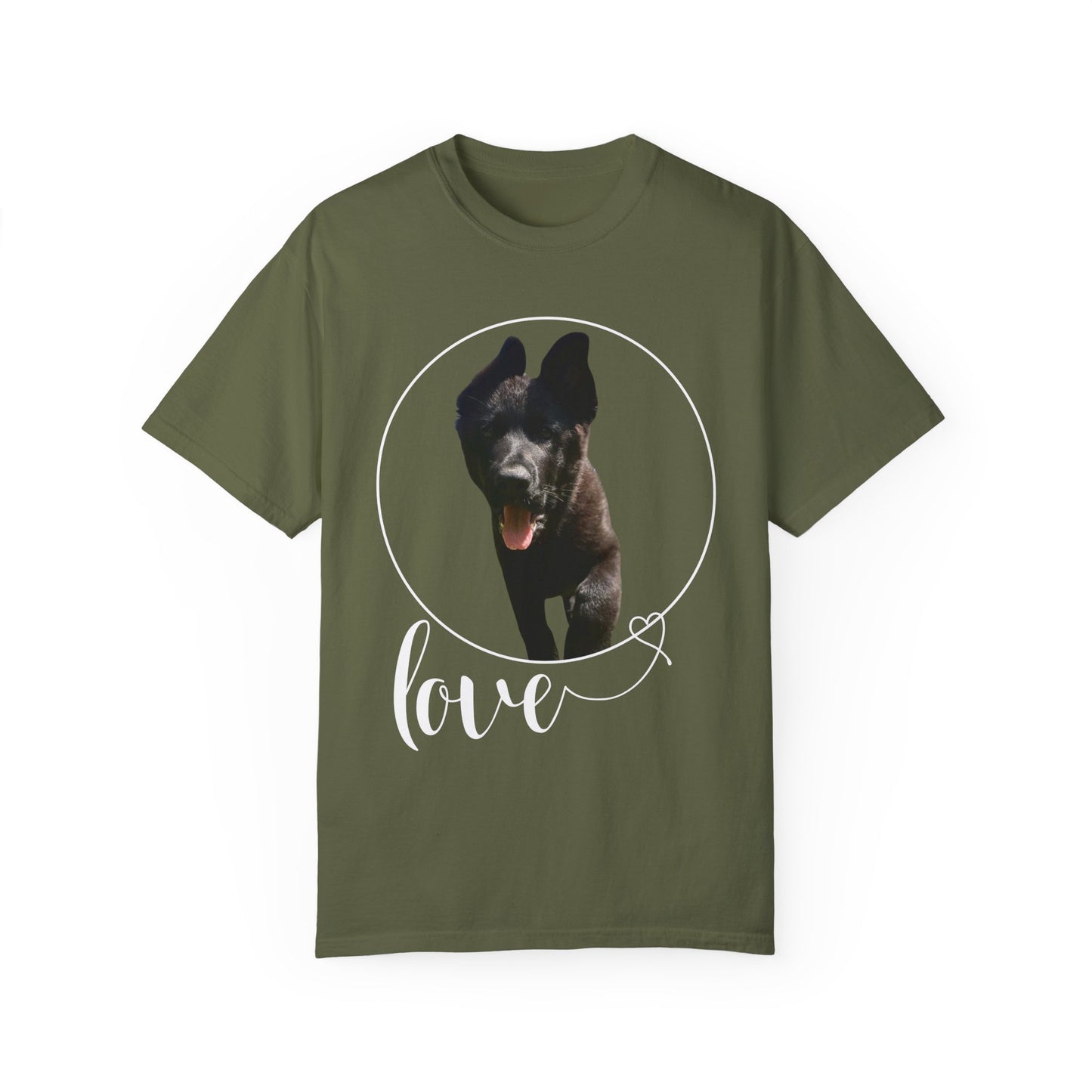 A garment dyed t-shirt featuring a European Solid Black German Shepherd walking on grass with the text "Love" can be a stylish and unique addition to any wardrobe. The design of the German Shepherd adds a touch of elegance and sophistication, while the word "Love" brings a message of positivity and affection. This t-shirt is versatile and suitable for both men and women, offering a fashionable way to showcase a love for dogs and nature. The combination of the black color and the artistic graphic creates a visually appealing piece that can be worn on various occasions with comfort and style.