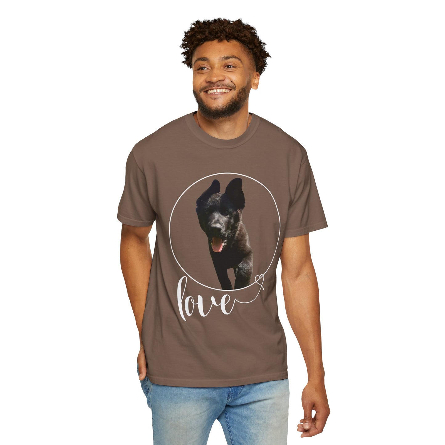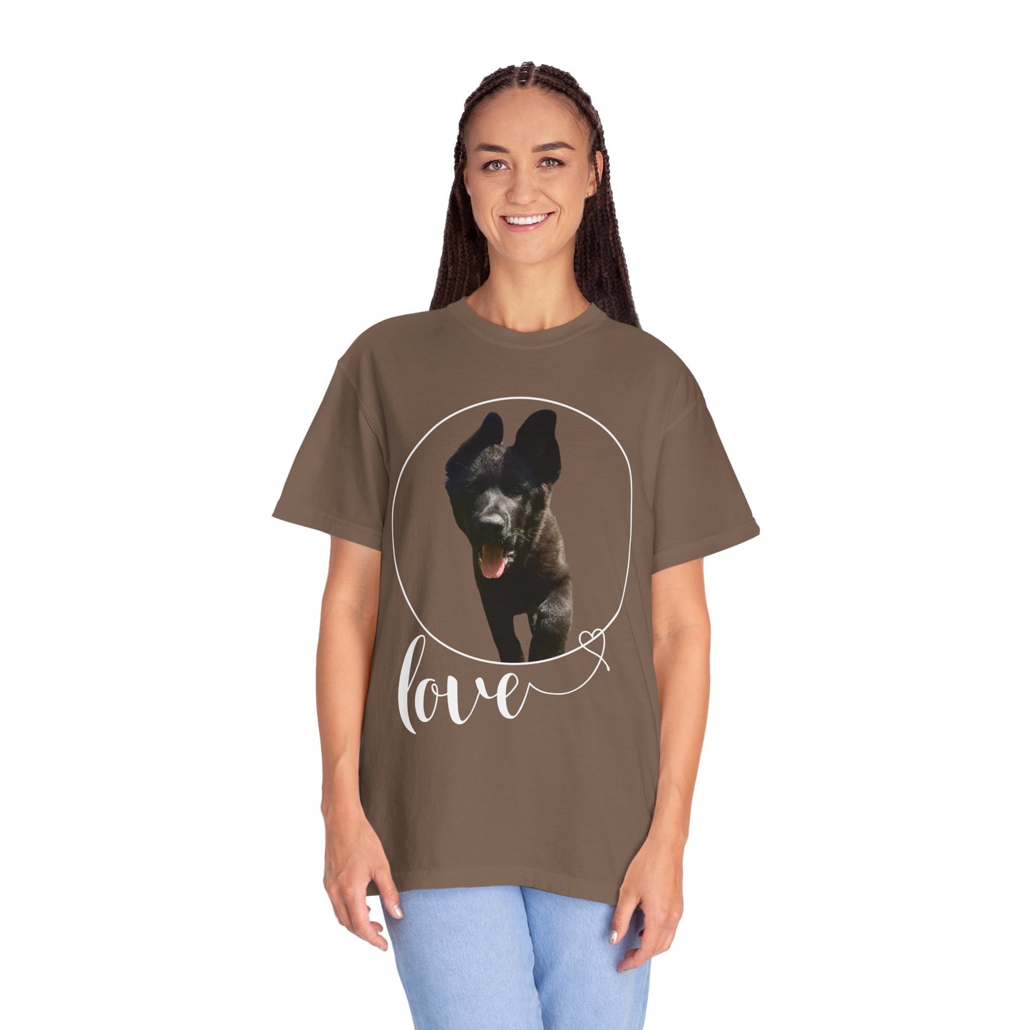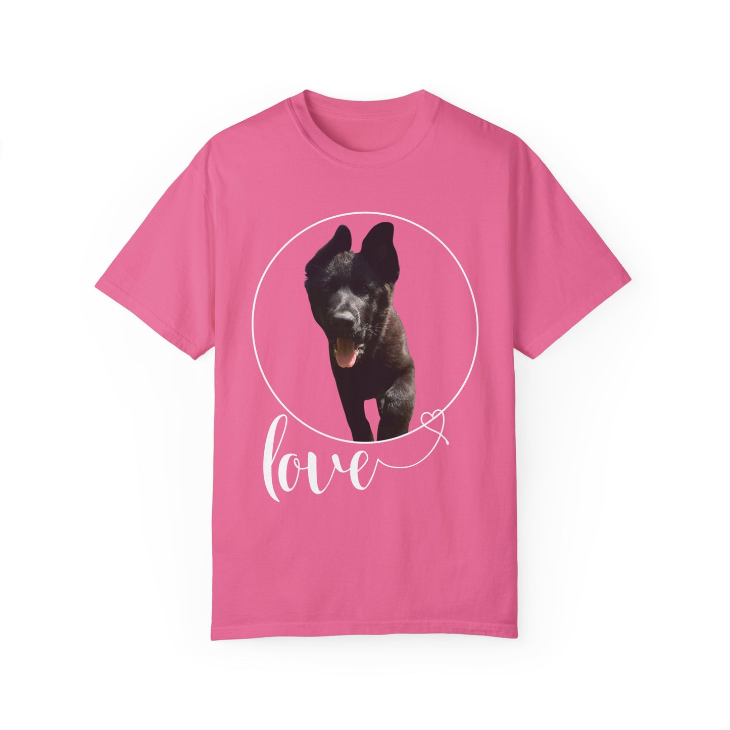 A garment dyed t-shirt featuring a European Solid Black German Shepherd walking on grass with the text "Love" can be a stylish and unique addition to any wardrobe. The design of the German Shepherd adds a touch of elegance and sophistication, while the word "Love" brings a message of positivity and affection. This t-shirt is versatile and suitable for both men and women, offering a fashionable way to showcase a love for dogs and nature. The combination of the black color and the artistic graphic creates a visually appealing piece that can be worn on various occasions with comfort and style.