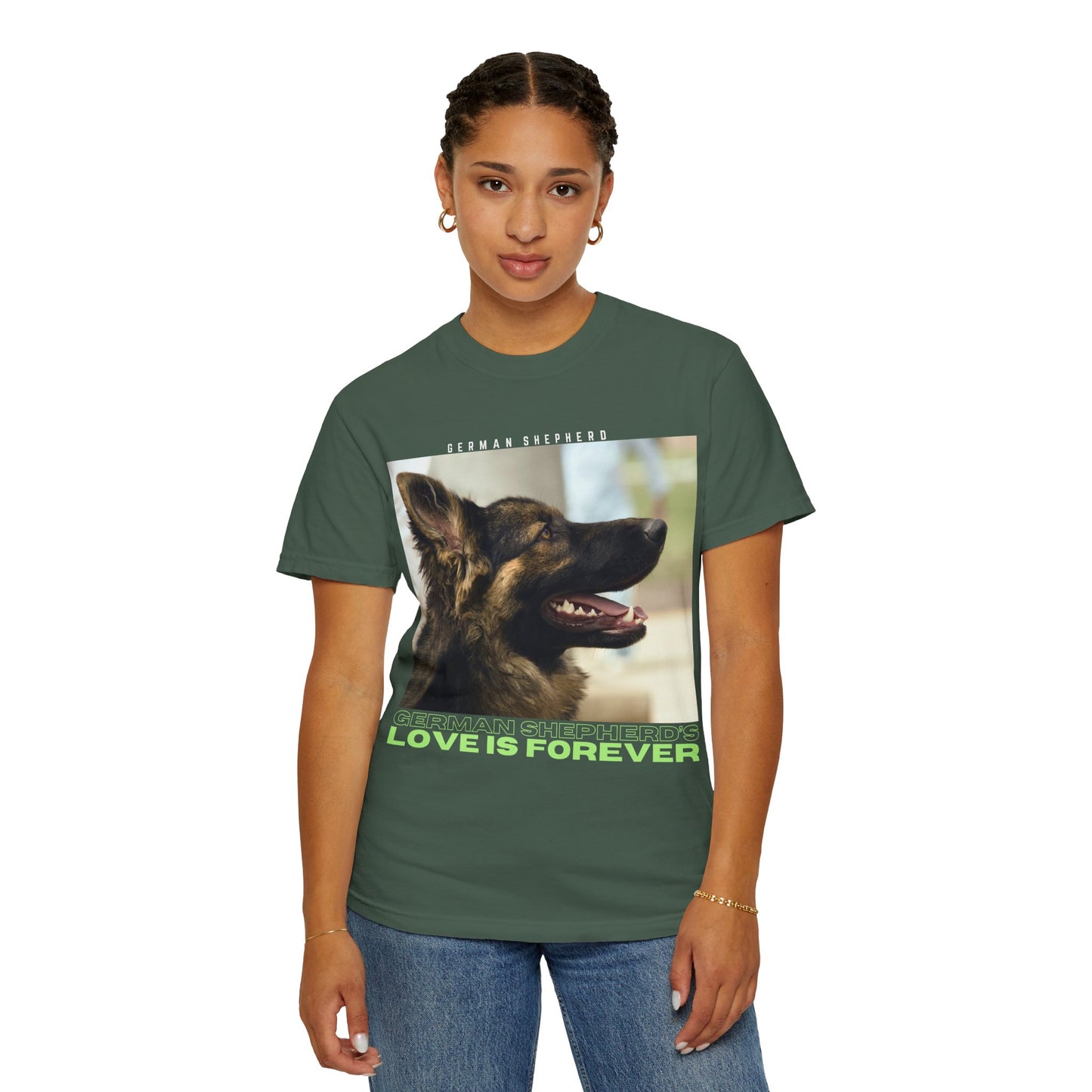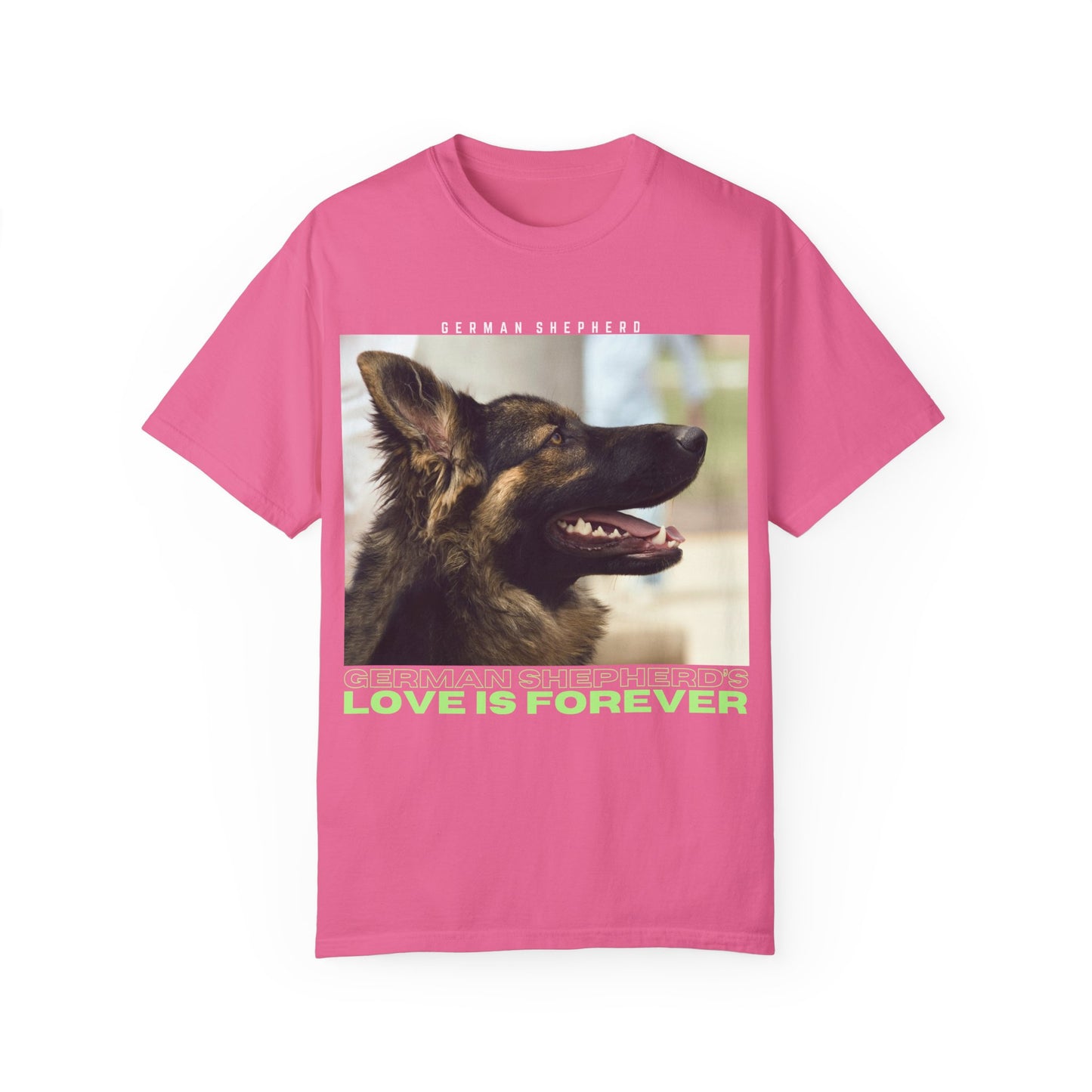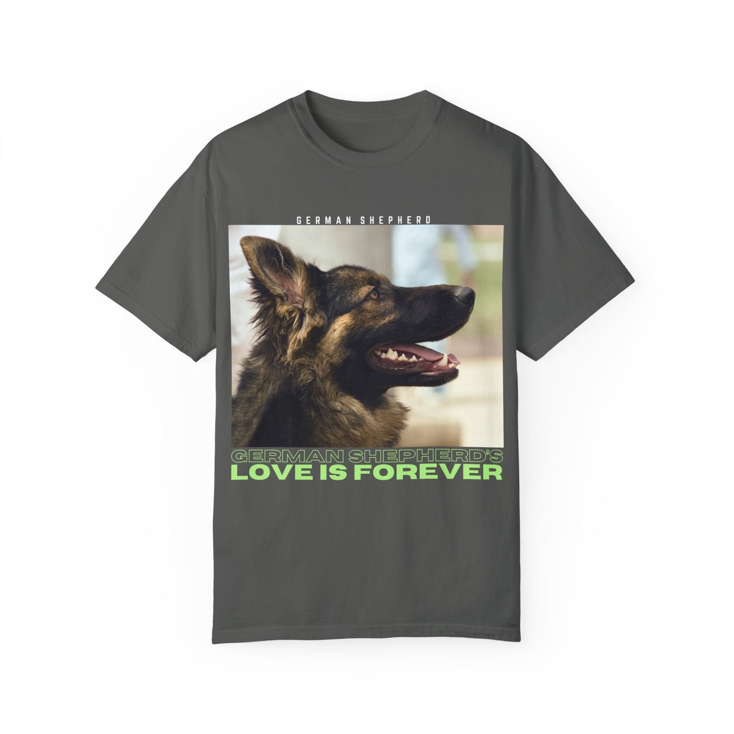 The garment dyed t-shirt featuring a close-up image of a working line German Shepherd with its mouth opened, paired with the quote "A GSD's Love is Forever", is a powerful and captivating design suitable for both men and women. The image of the German Shepherd, known for its loyalty and strength, adds a touch of boldness and character to the apparel. The quote further emphasizes the eternal bond and unwavering love that these dogs are famous for. This unique and eye-catching t-shirt is sure to appeal to dog lovers and those who appreciate the beauty and loyalty of the German Shepherd breed.