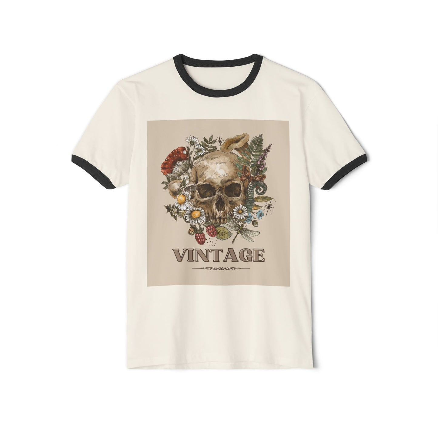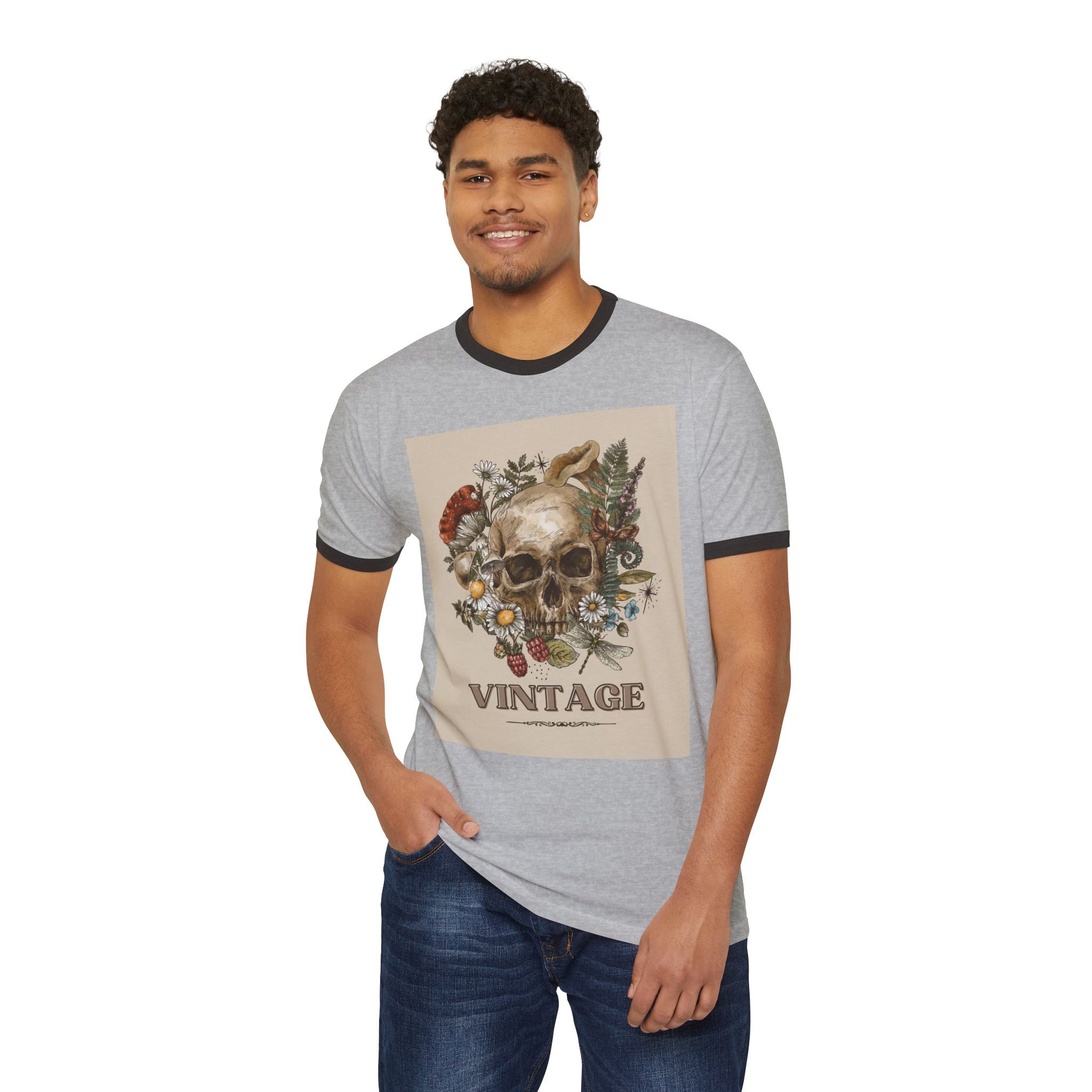 Vintage-Inspired Skull Ringer T-Shirt, Unisex Tee, Boho Style Shirt, Retro Graphic Top, Unique Gift for Halloween, Nature Lovers Apparel